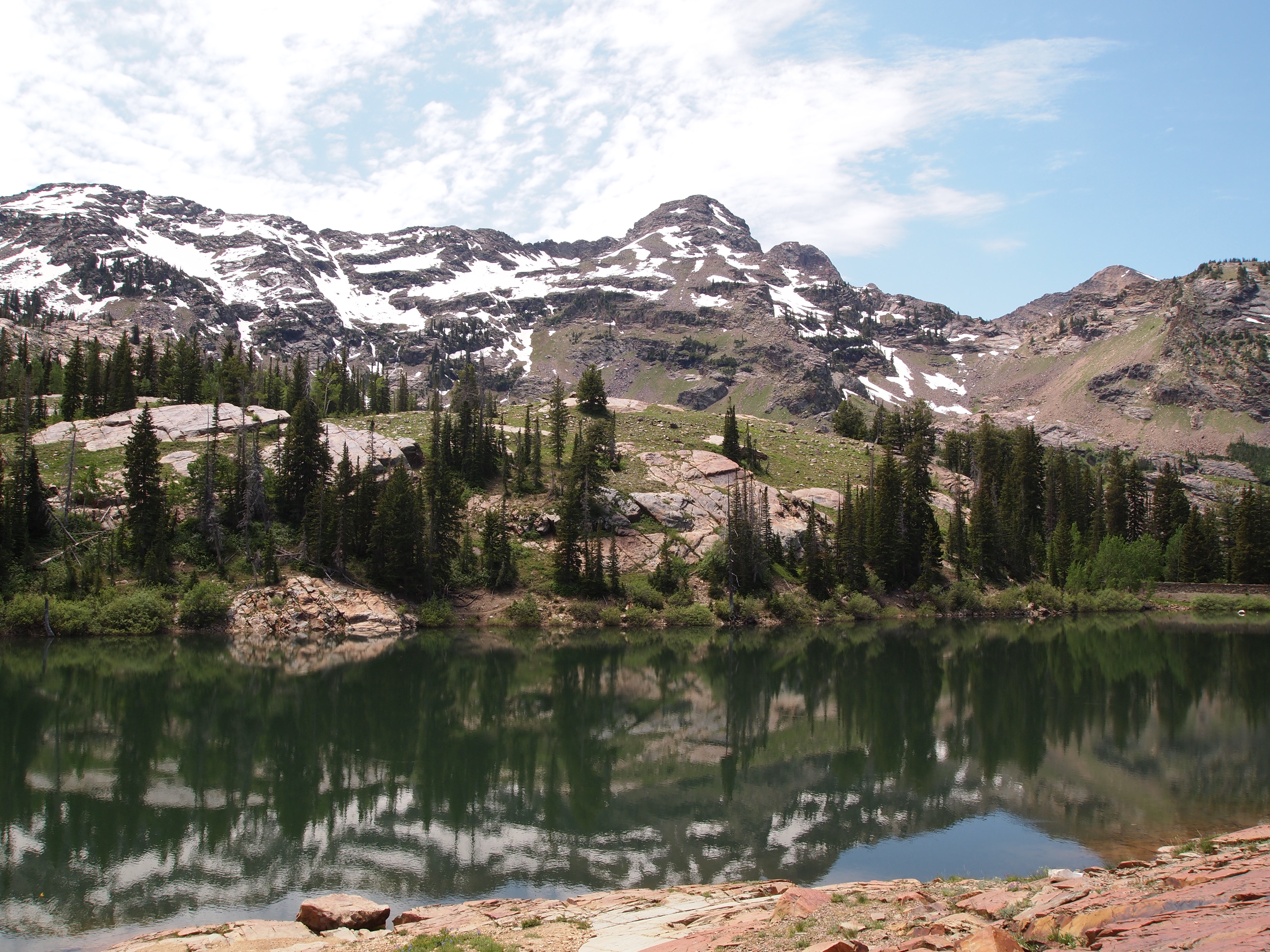 Thankfully we finally made it! Before we could actually see the lake I knew we were there. Behind us, the views of the canyon were extraordinary. We could even glimpse the Great Salt Lake and the city. Just beyond the granite we reached Lake Blanche. Wow. What a picturesque sight. The lake rests against the backdrop of Sundial Peak creating an unbelievably gorgeous setting. We snapped a couple photos before sitting in the shade of some aspens to eat our lunch. Near the end of the trail, people passing by told us about a moose eating on the far side of the lake. We could see him fairly well from the north side of the lake as he munched on the surrounding greenery.