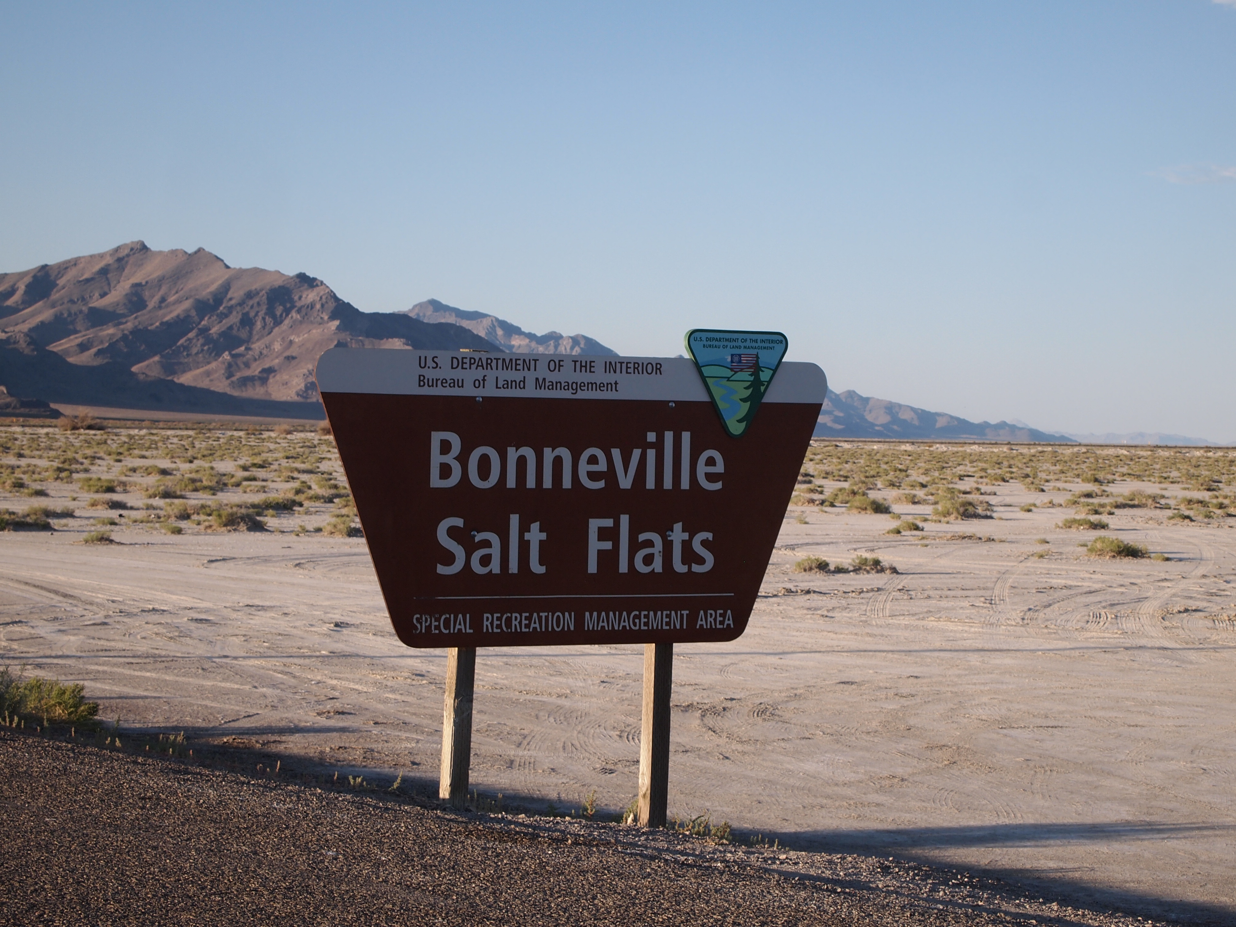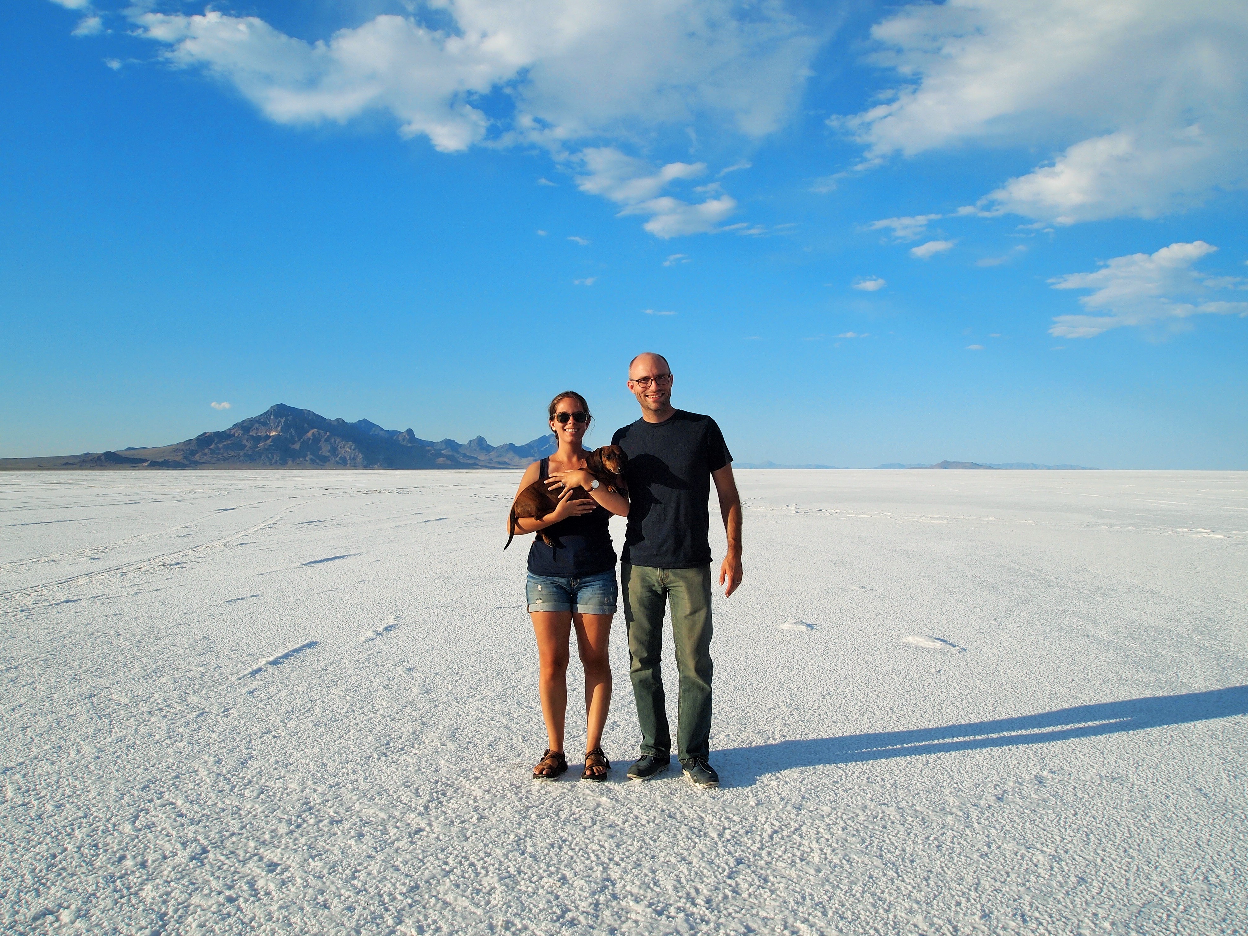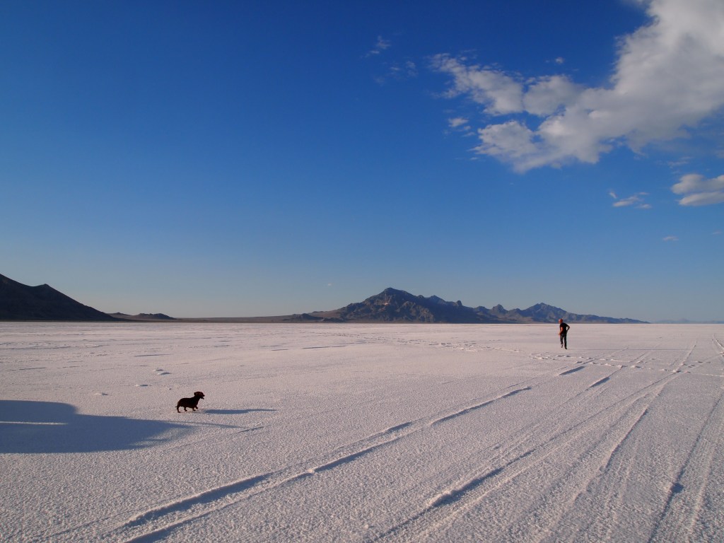 The Bonneville Salt Flats sits on the Utah-Nevada border along I-80 and stretches over 30,000 acres of land adjacent to the Great Salt Lake. The salt flats is the result of ancient Lake Bonneville’s evaporation; all that remains of the lake which once filled the Great Basin is the Great Salt Lake. The salt flats is deceiving. From a distance it simply appears to be a sandy desert, but as you draw nearer it looks like a field of fresh snow. Only once you are on top of it, does it actually look like hard-packed salt. Even then, the salt stuck to our shoes and tires like snow, but with much more resiliency. Even a car wash didn’t completely remove all the salt. Like walking in White Sands, the sun’s rays reflected off of the salt’s surface making it incredibly bright and sweltering on the flats. Truman quickly grew dehydrated, and even Zach and I were rather parched by the end of our visit.