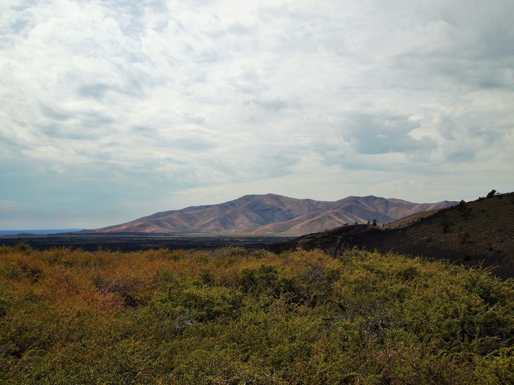 The forecast warned of rain, but thankfully, other than some small drops here and there, we were spared during the day. Before we arrived at the official entrance to the monument, we stopped at an overlook off the highway. The overlook proved to be one of the best views in the park. From the highway the Lost River mountains shone in the distance, casting a watchful eye over the basalt plain in front of us. We could see several cones in the distance with varying stages of plant regrowth. Though I had seen photos of the black, barren fields, sagebrush provided vibrant green and yellow bursts of color all around. There was a small path which led from the main viewpoint to another, better vantage point. From there the lava flows below glistened in the peeking sun and contrasted beautifully with the flowering sage. There was also a sculpture of a lava tube from nearby Sun Valley for visitors to ponder.