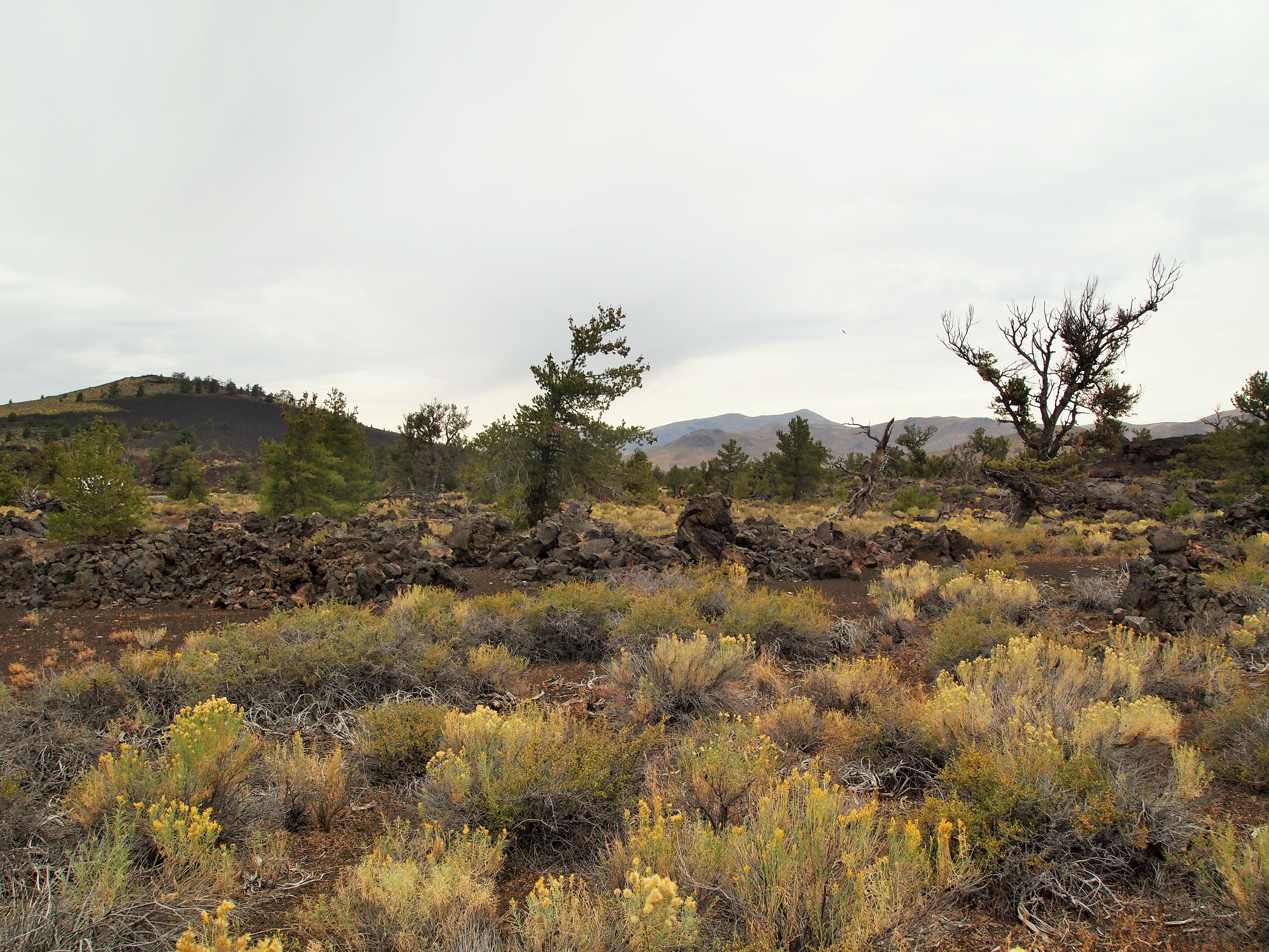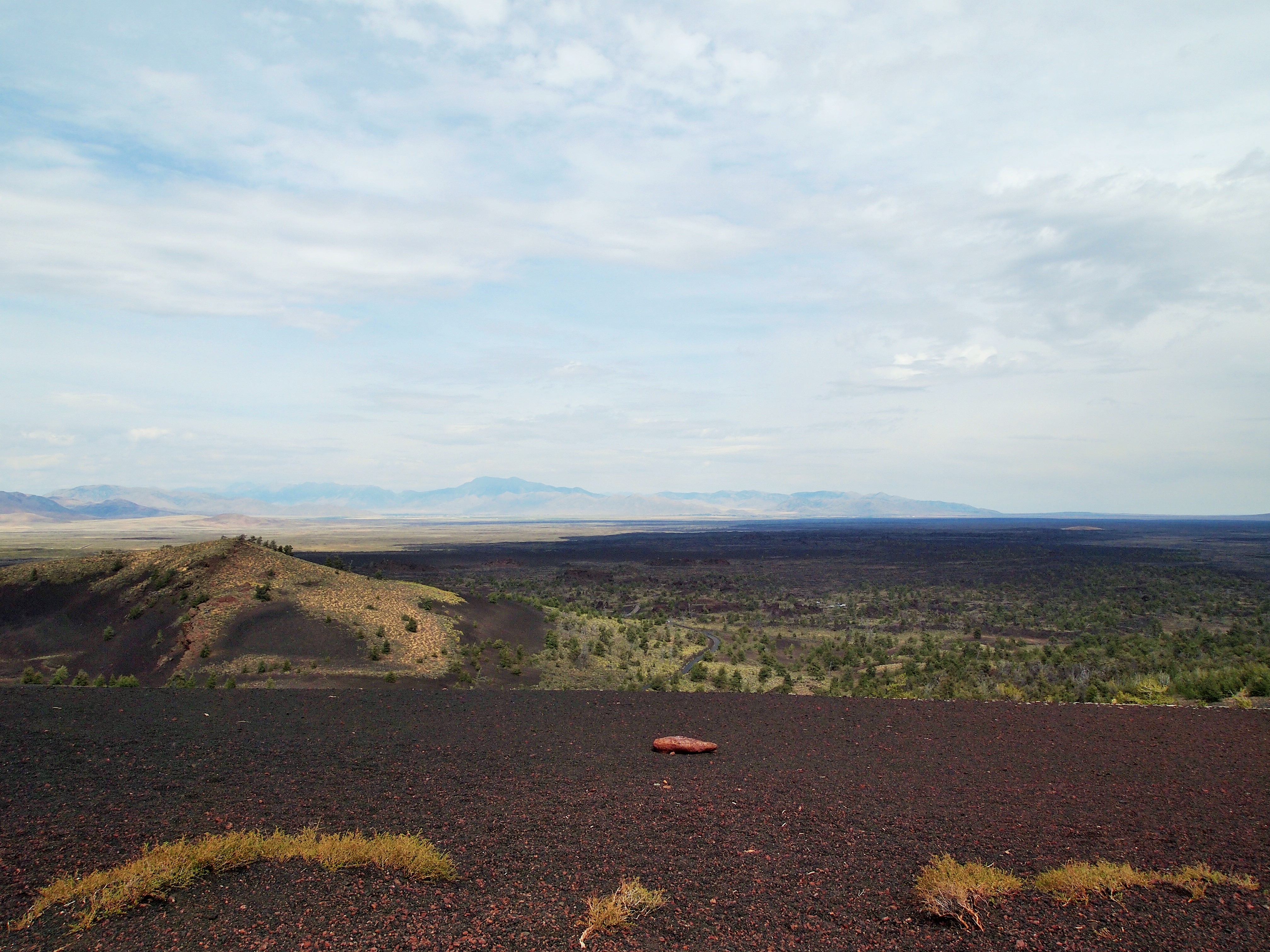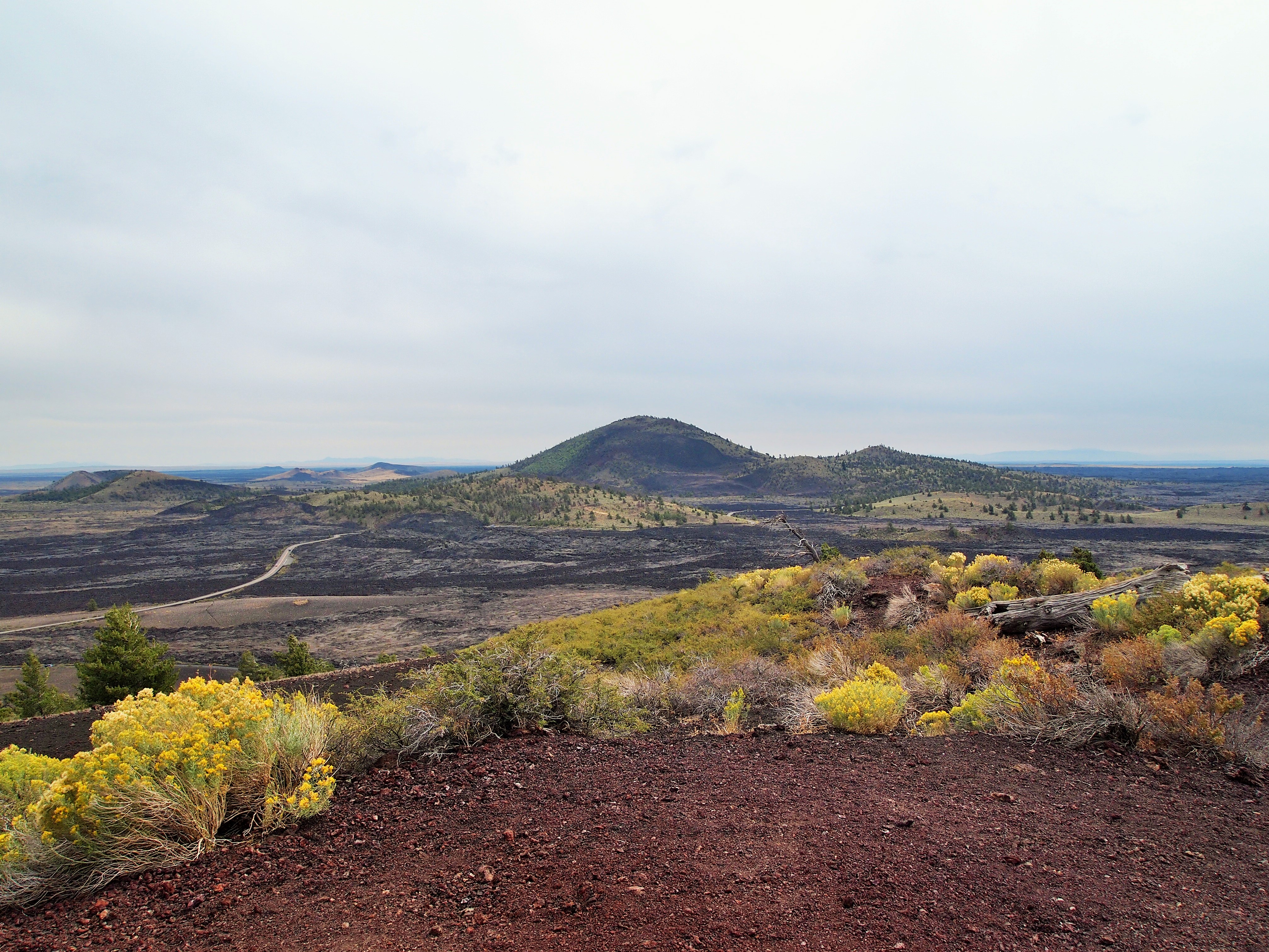 The forecast warned of rain, but thankfully, other than some small drops here and there, we were spared during the day. Before we arrived at the official entrance to the monument, we stopped at an overlook off the highway. The overlook proved to be one of the best views in the park. From the highway the Lost River mountains shone in the distance, casting a watchful eye over the basalt plain in front of us. We could see several cones in the distance with varying stages of plant regrowth. Though I had seen photos of the black, barren fields, sagebrush provided vibrant green and yellow bursts of color all around. There was a small path which led from the main viewpoint to another, better vantage point. From there the lava flows below glistened in the peeking sun and contrasted beautifully with the flowering sage. There was also a sculpture of a lava tube from nearby Sun Valley for visitors to ponder.