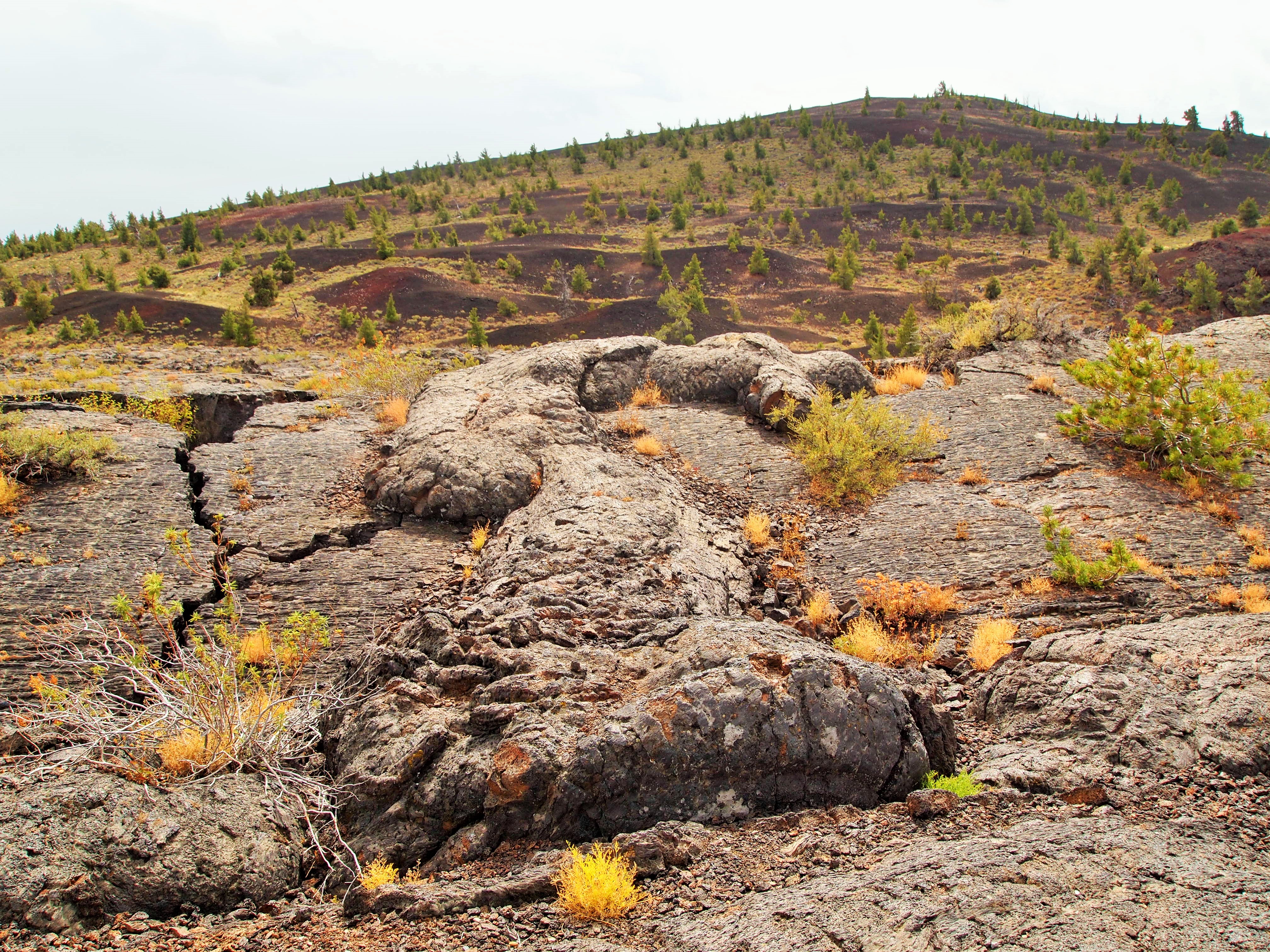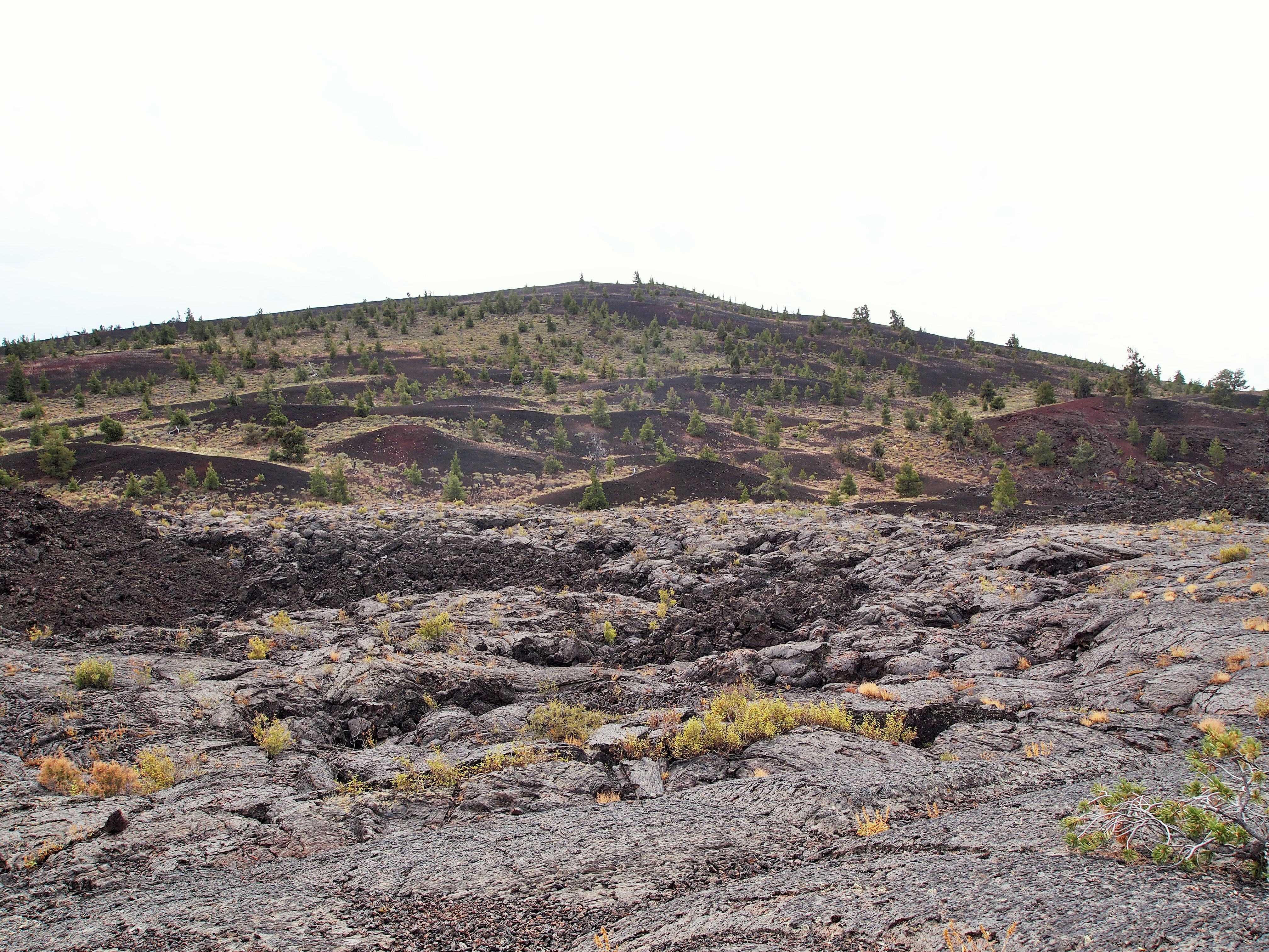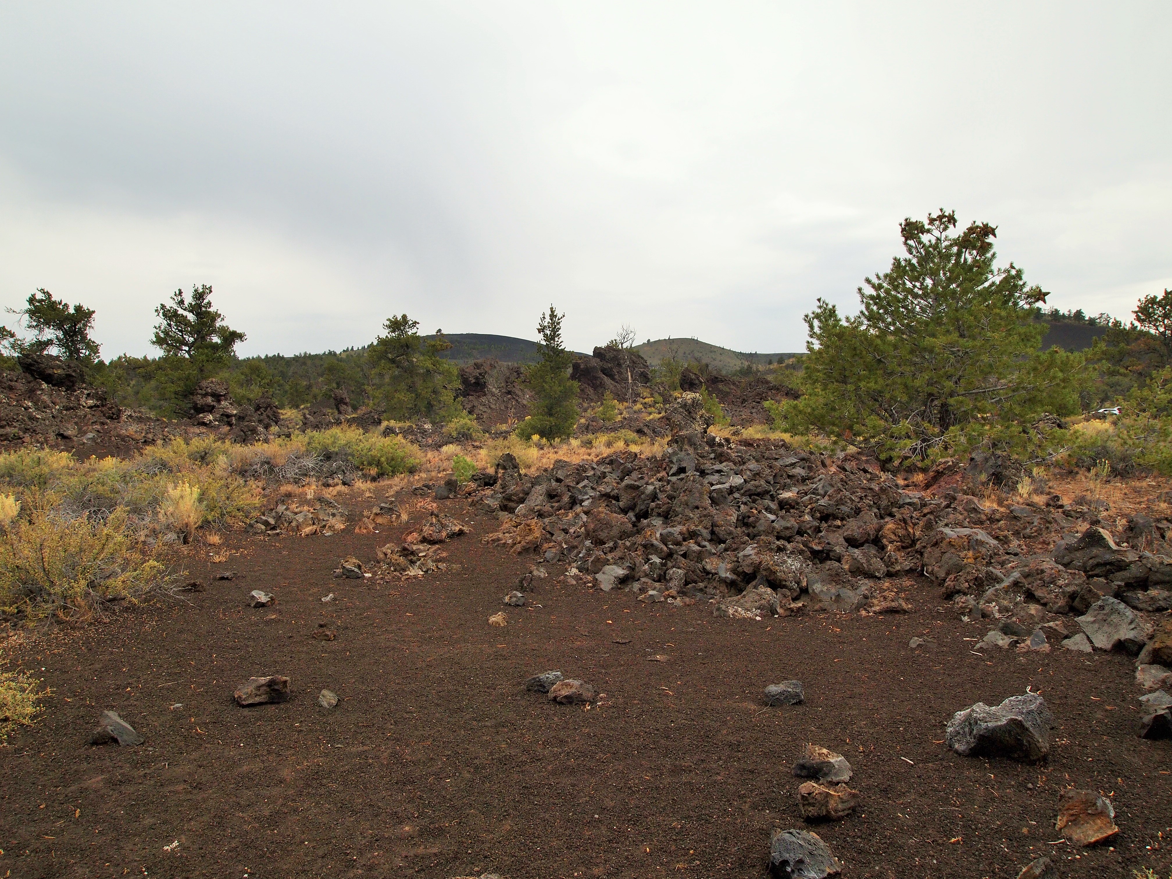 The forecast warned of rain, but thankfully, other than some small drops here and there, we were spared during the day. Before we arrived at the official entrance to the monument, we stopped at an overlook off the highway. The overlook proved to be one of the best views in the park. From the highway the Lost River mountains shone in the distance, casting a watchful eye over the basalt plain in front of us. We could see several cones in the distance with varying stages of plant regrowth. Though I had seen photos of the black, barren fields, sagebrush provided vibrant green and yellow bursts of color all around. There was a small path which led from the main viewpoint to another, better vantage point. From there the lava flows below glistened in the peeking sun and contrasted beautifully with the flowering sage. There was also a sculpture of a lava tube from nearby Sun Valley for visitors to ponder.