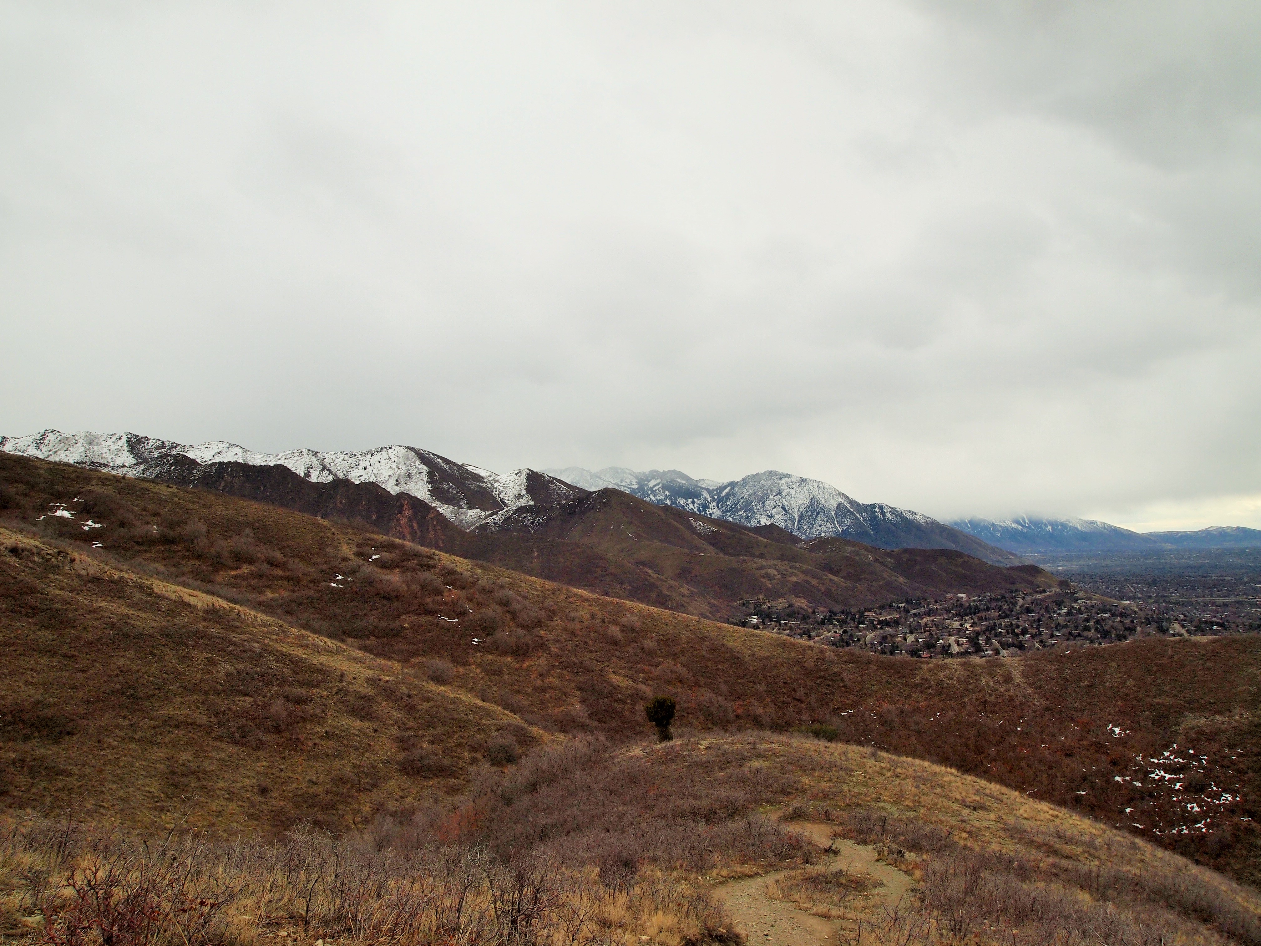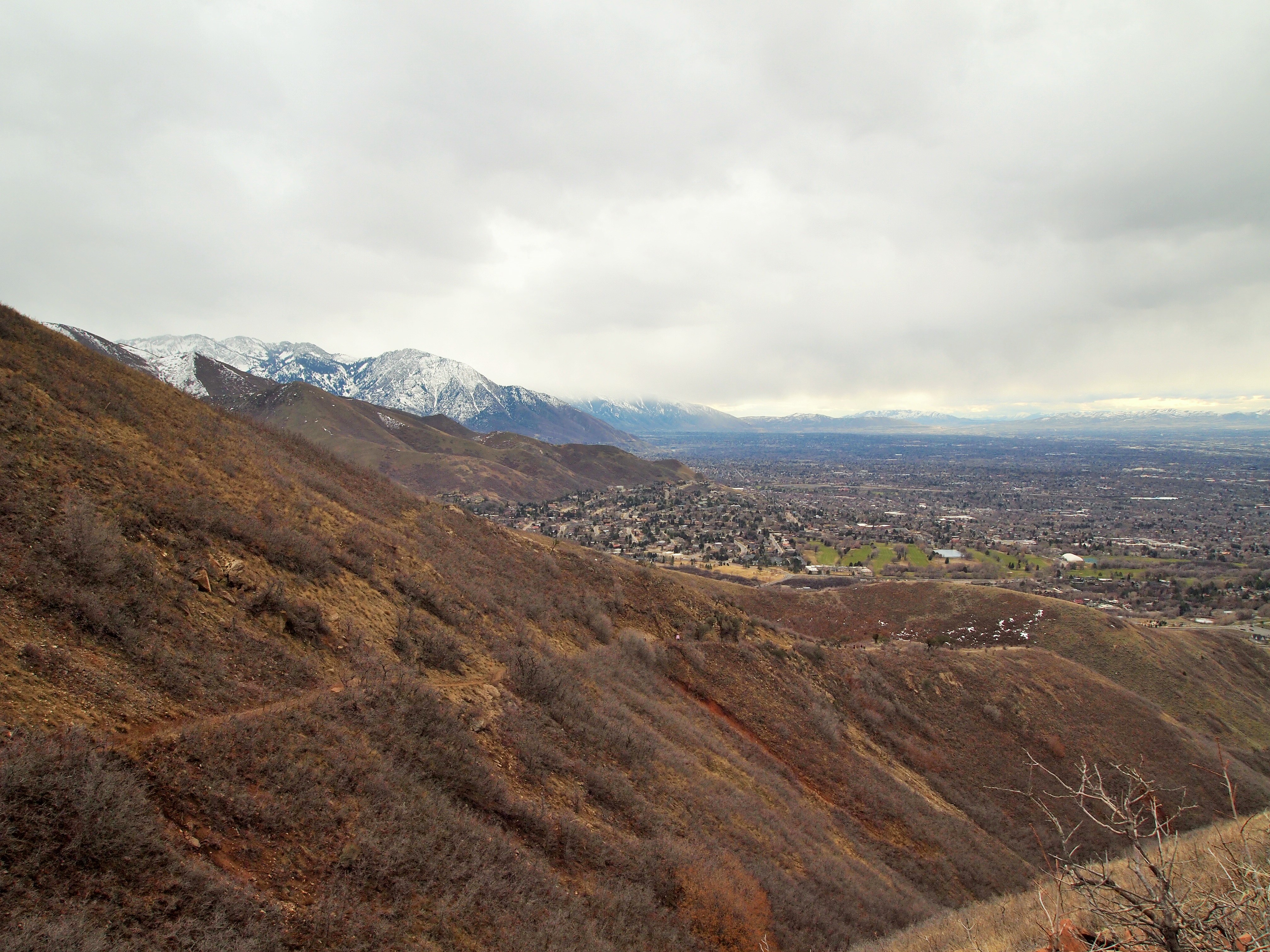 We came to a Y and took the trail to the west which shortly brought us to The Living Room. Even for an overcast day we had a pretty great view of the city below. We could see the Oquirrh Mountains to the southwest, the Wasatch shrouded in more snowfall to the east, and even the Great Salt Lake and Antelope Island.
