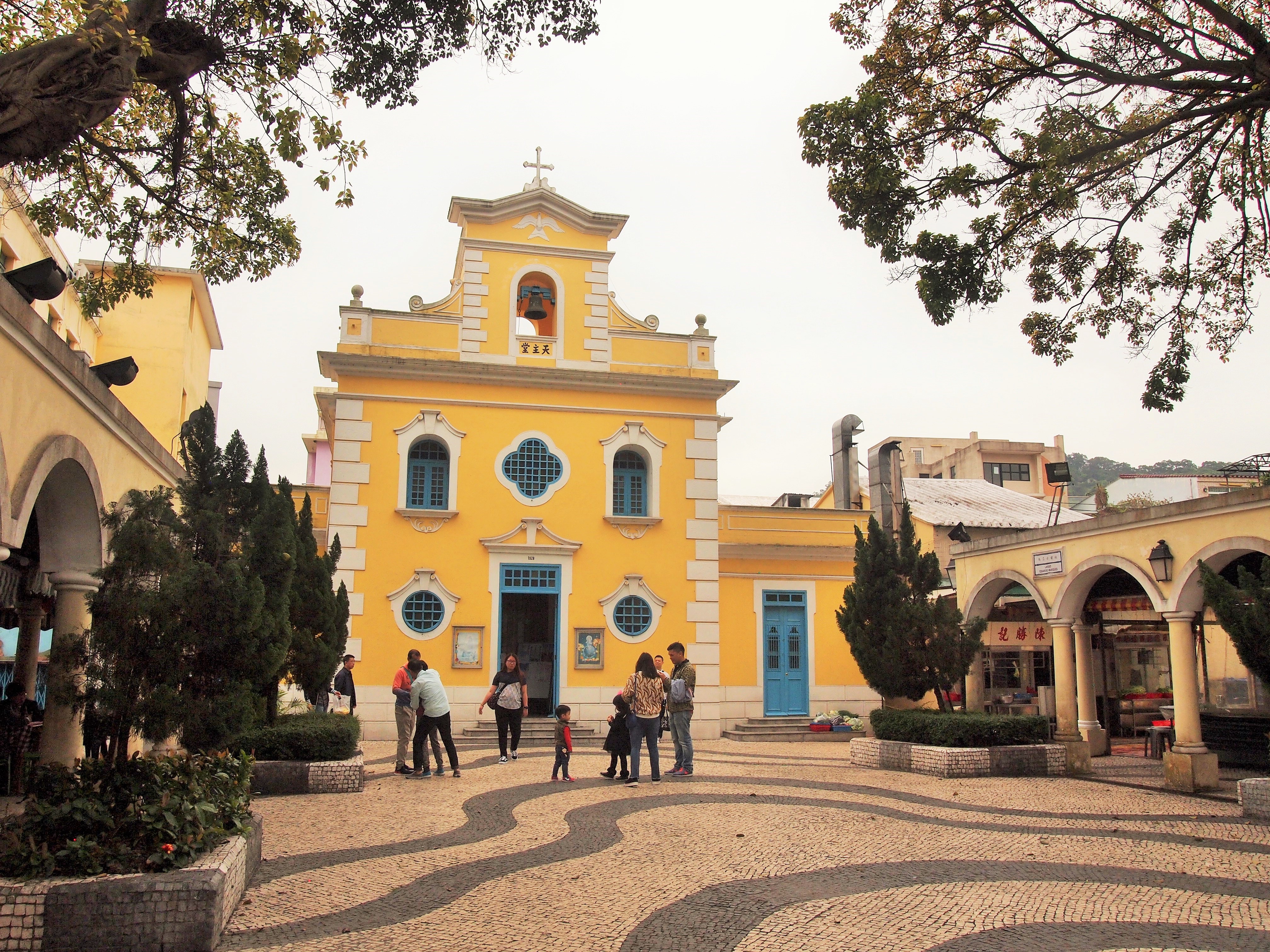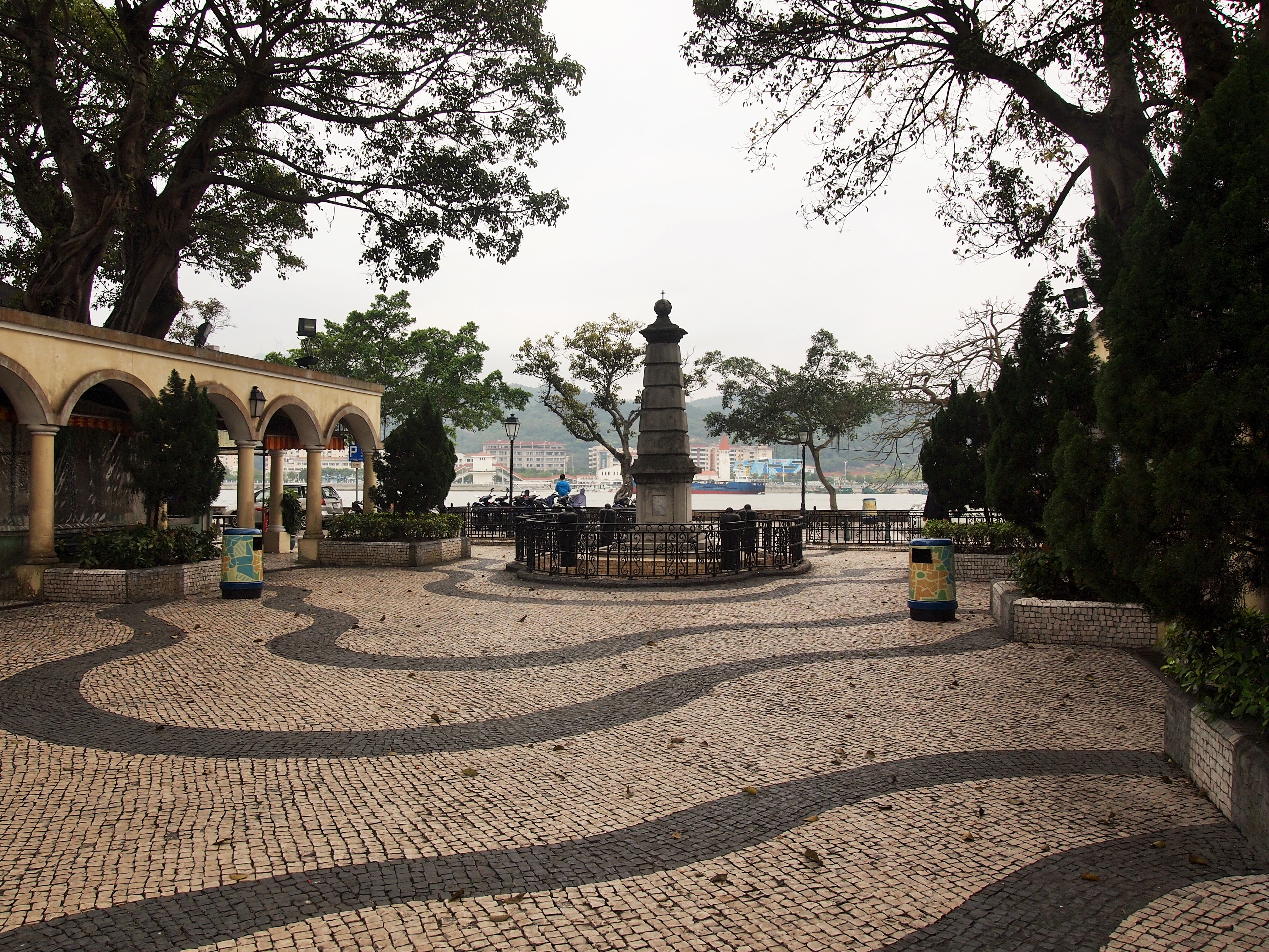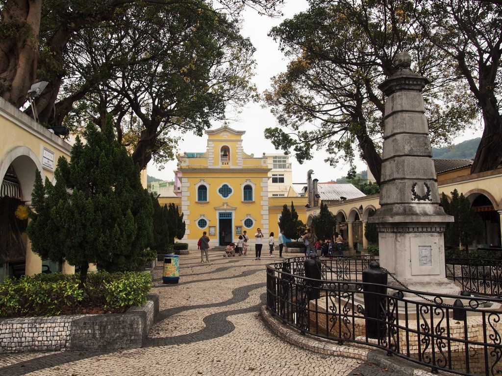 After our snack, we set out to walk the village loop. Just behind the several Lord Stow’s Bakery locations, was a row of Chinese homes and Sam Seng Kong Temple, a tiny Buddhist temple. We wound our way back around to the main roundabout and strolled along the seafront to Coloane’s most iconic site, St. Francis Xavier Chapel. Named for a missionary on his way to China & Japan, it is definitely the most picturesque chapel in all of Macau. Like most of Macau’s churches, the inside is lacking, but the chapel’s secluded courtyard setting off the main road and its sweet pastel colors make it exceptional. In its hey-day Coloane was a hide out for pirates who used the caves and cliffs off the coast to ransack cargo ships passing between Macau and China. The monument in front of the chapel, complete with cannon balls, commemorates the final pirate attack in 1910.