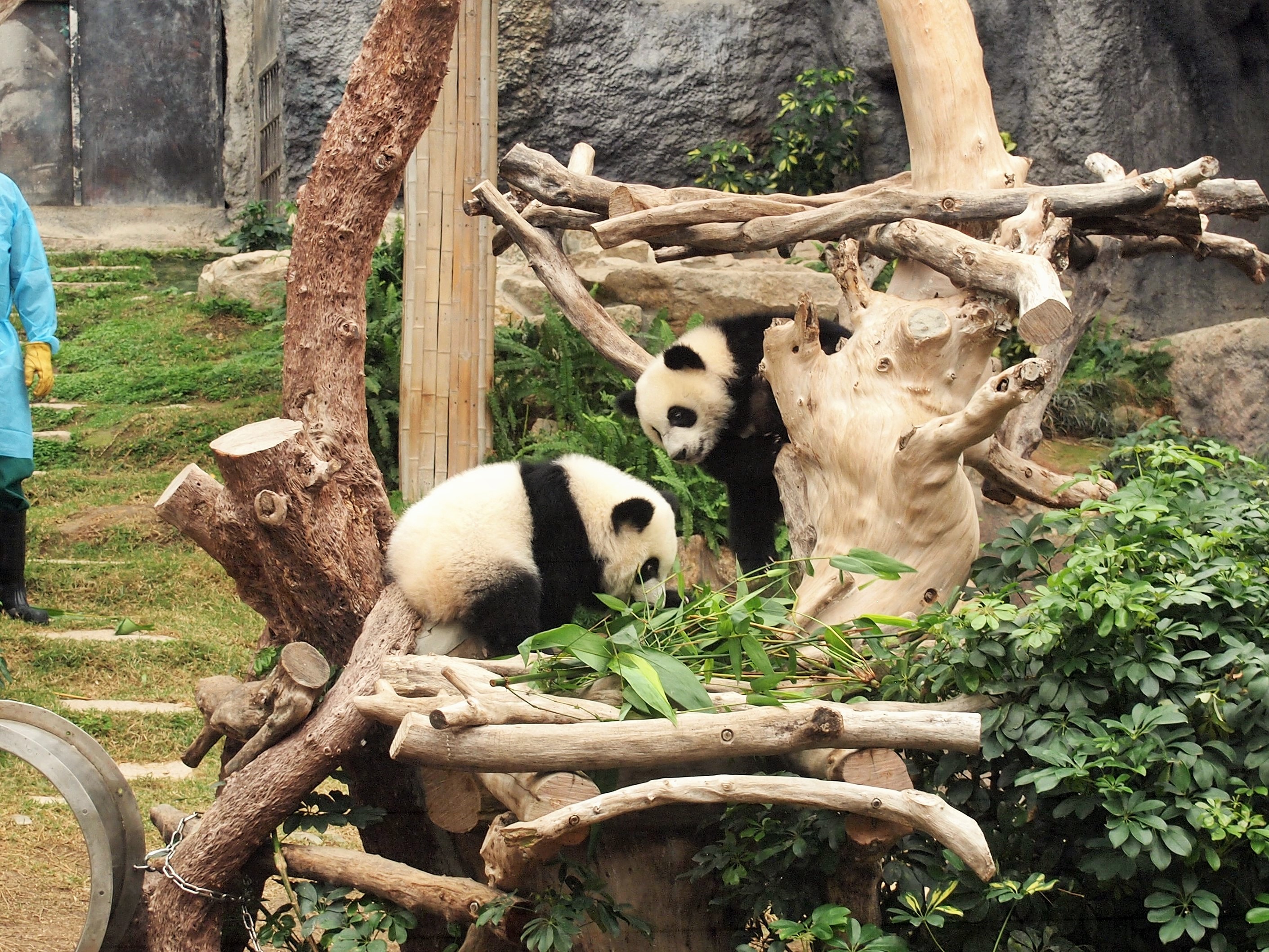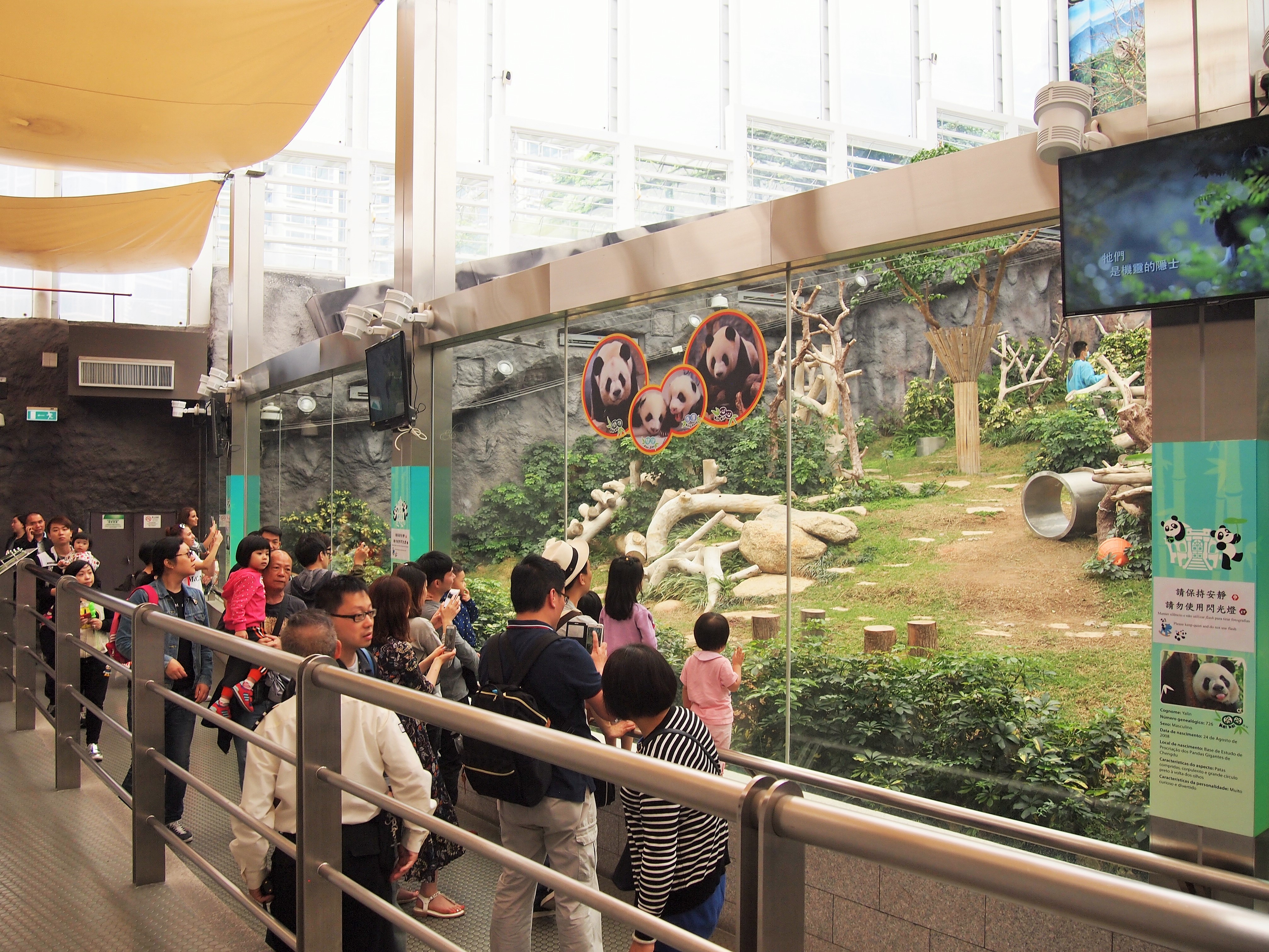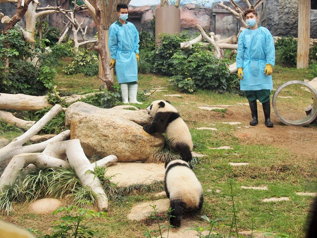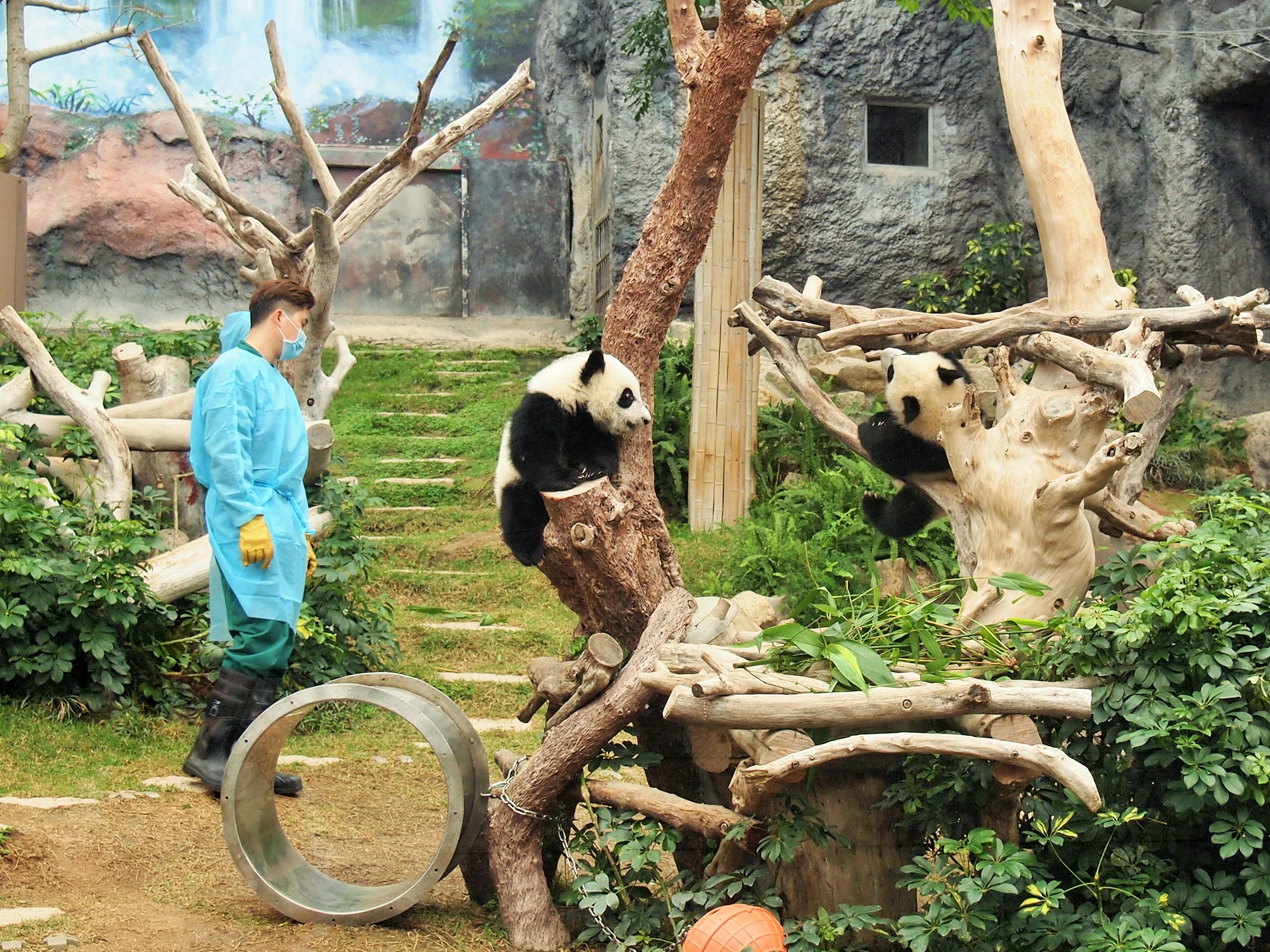 Macau Panda Pavilion is home to four giant pandas – two adults and two cubs. The twin cubs, Jian Jian and Kang Kang, were born in June 2016 and were the first pandas born in Macau. The parents, Xin Xin and Kai Kai, were gifts from the Chinese government on the 15th anniversary of Macau’s return to China. We were able to see both cubs and they were the highlight of our visit. They were so adorable!!! They played, rolled around, chased each other and the handlers, and were just too damn cute for words. It was quite difficult to tear ourselves away from the cubs. We could have watched them for hours. The adult – I’m not sure which one we saw – was much less exciting. He/she simply sat in the center of the enclosure and munched on bamboo leaves.