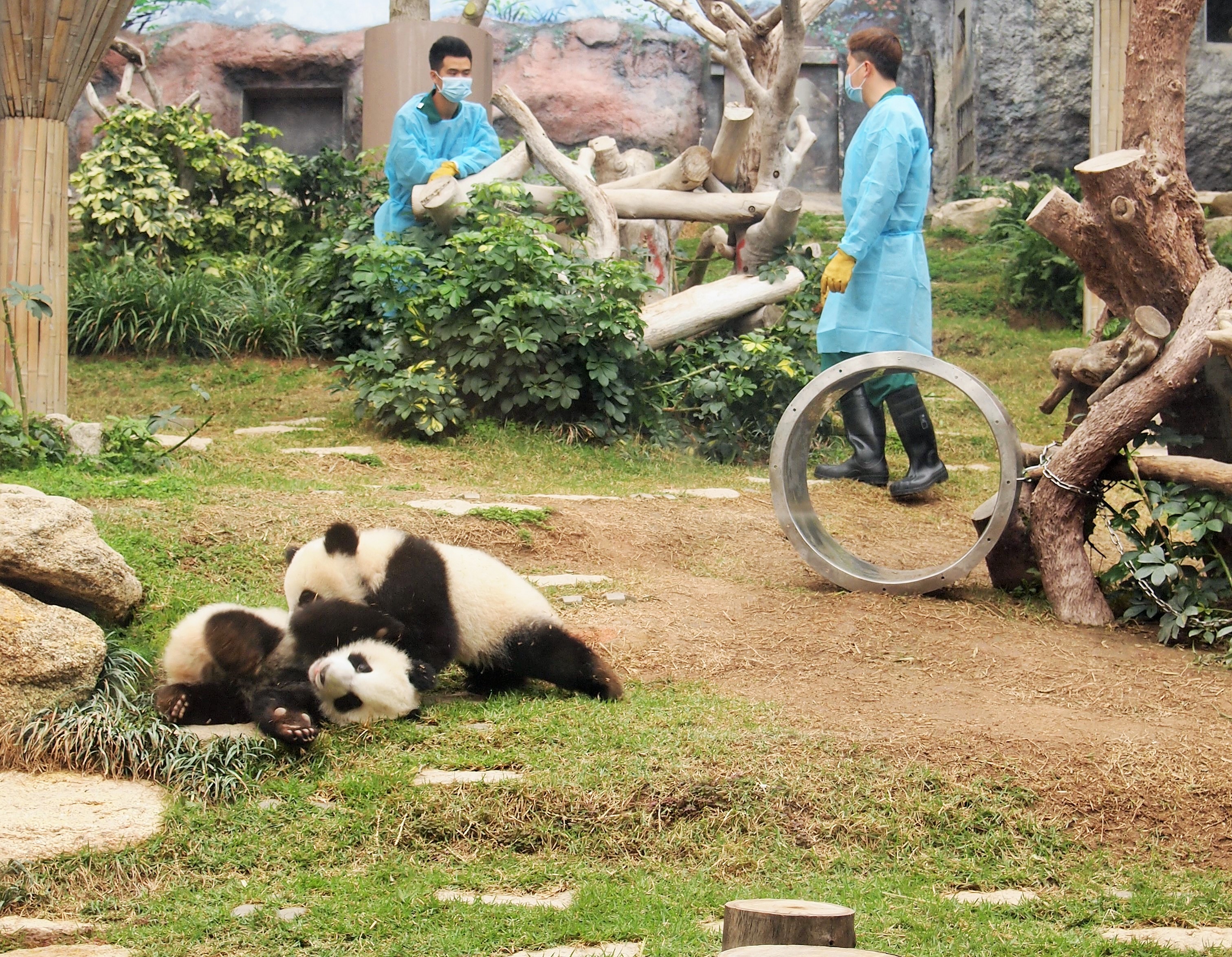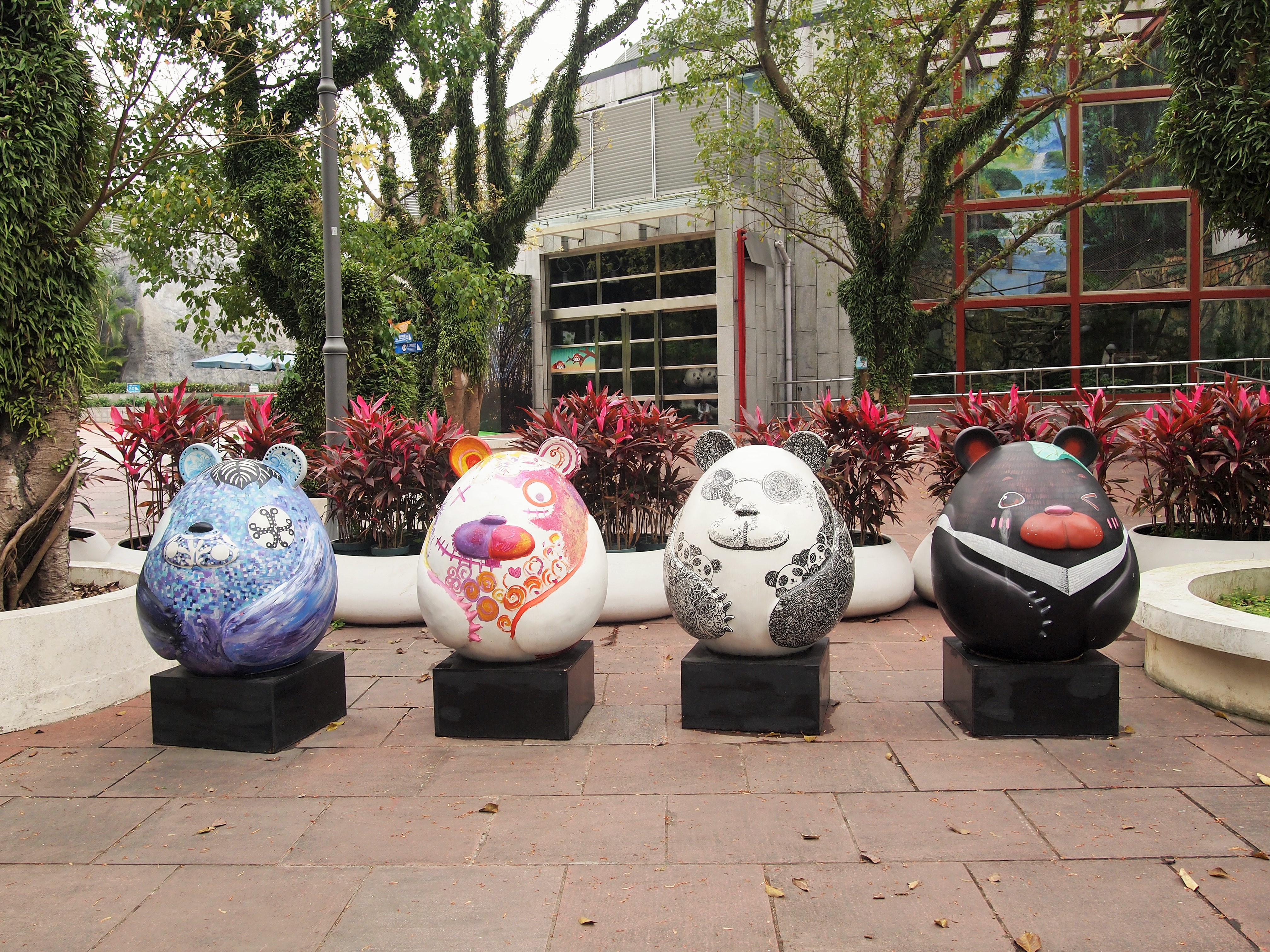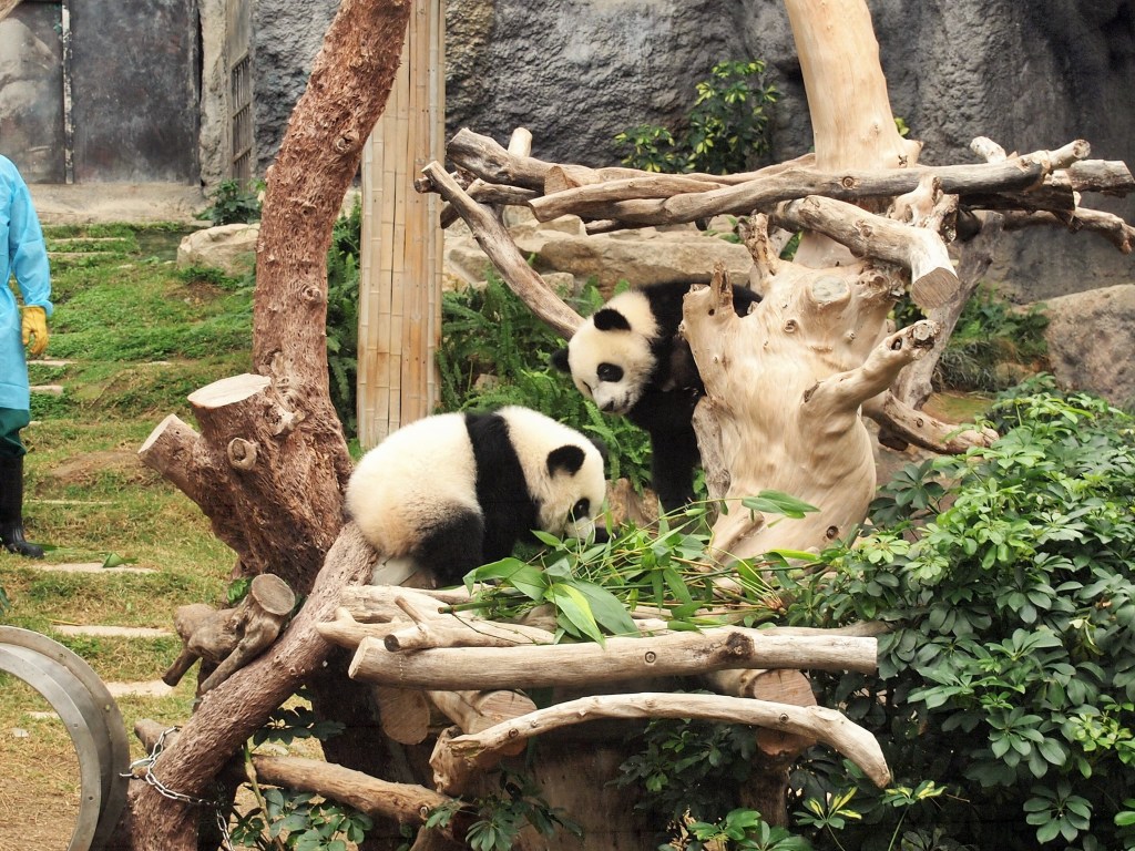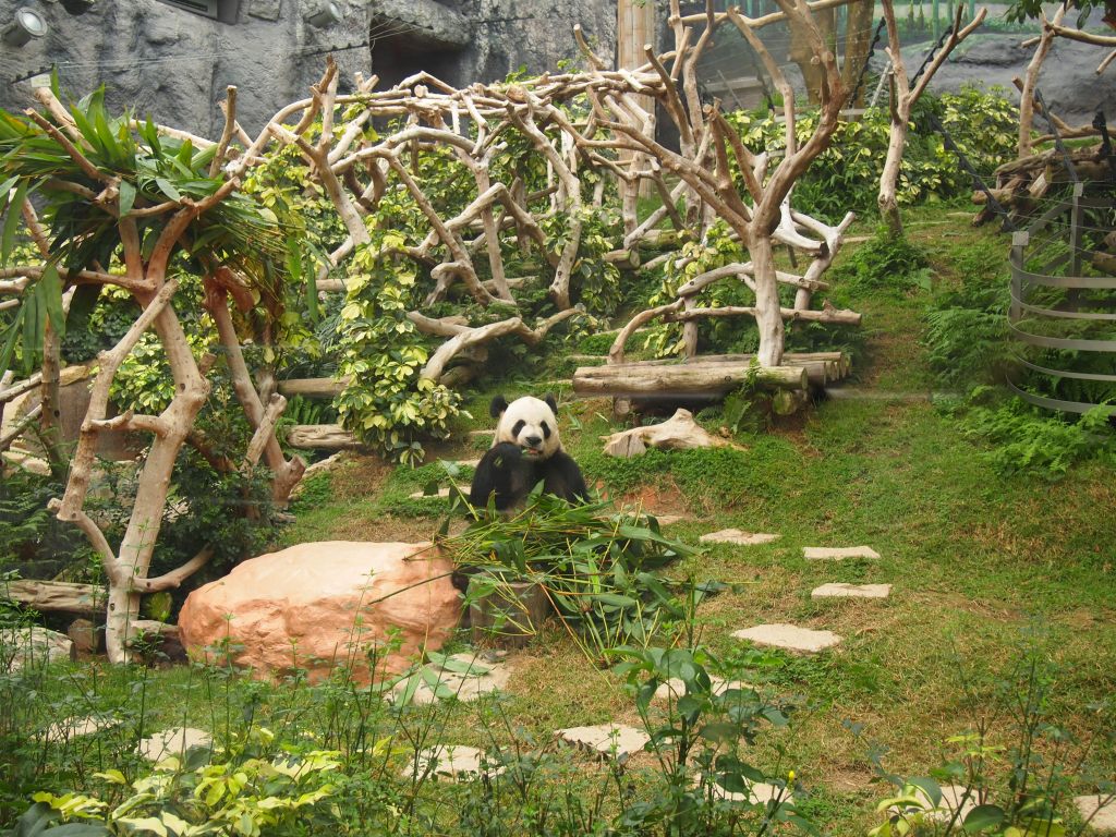 Macau Panda Pavilion is home to four giant pandas – two adults and two cubs. The twin cubs, Jian Jian and Kang Kang, were born in June 2016 and were the first pandas born in Macau. The parents, Xin Xin and Kai Kai, were gifts from the Chinese government on the 15th anniversary of Macau’s return to China. We were able to see both cubs and they were the highlight of our visit. They were so adorable!!! They played, rolled around, chased each other and the handlers, and were just too damn cute for words. It was quite difficult to tear ourselves away from the cubs. We could have watched them for hours. The adult – I’m not sure which one we saw – was much less exciting. He/she simply sat in the center of the enclosure and munched on bamboo leaves.