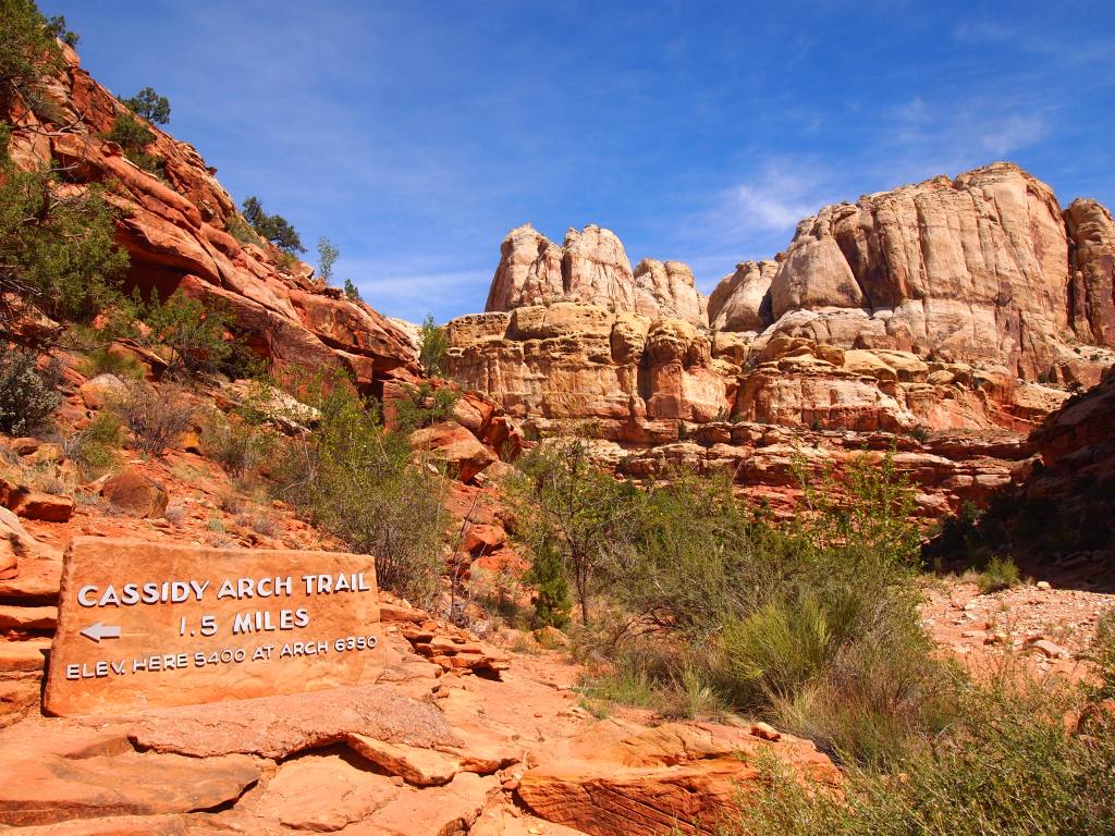 After 3.5 miles we pulled off the drive and onto Grand Wash Road, an unpaved road which leads to two trailheads, Cassidy Arch and Grand Wash. We decided to do Cassidy Arch as our first hike of the day, a pleasant 3.4 mile trek. The arch is named for Butch Cassidy who is rumored to have used Grand Wash as a hide out from time to time. The trail has an elevation gain of 670 ft. which is mostly at the beginning; then it levels out and follows the rim around to the arch. The trail becomes all slickrock at the end and following the cairns becomes essential to make it to the arch. When we arrived there was only one other couple at the arch – that would never be the case at Arches NP!