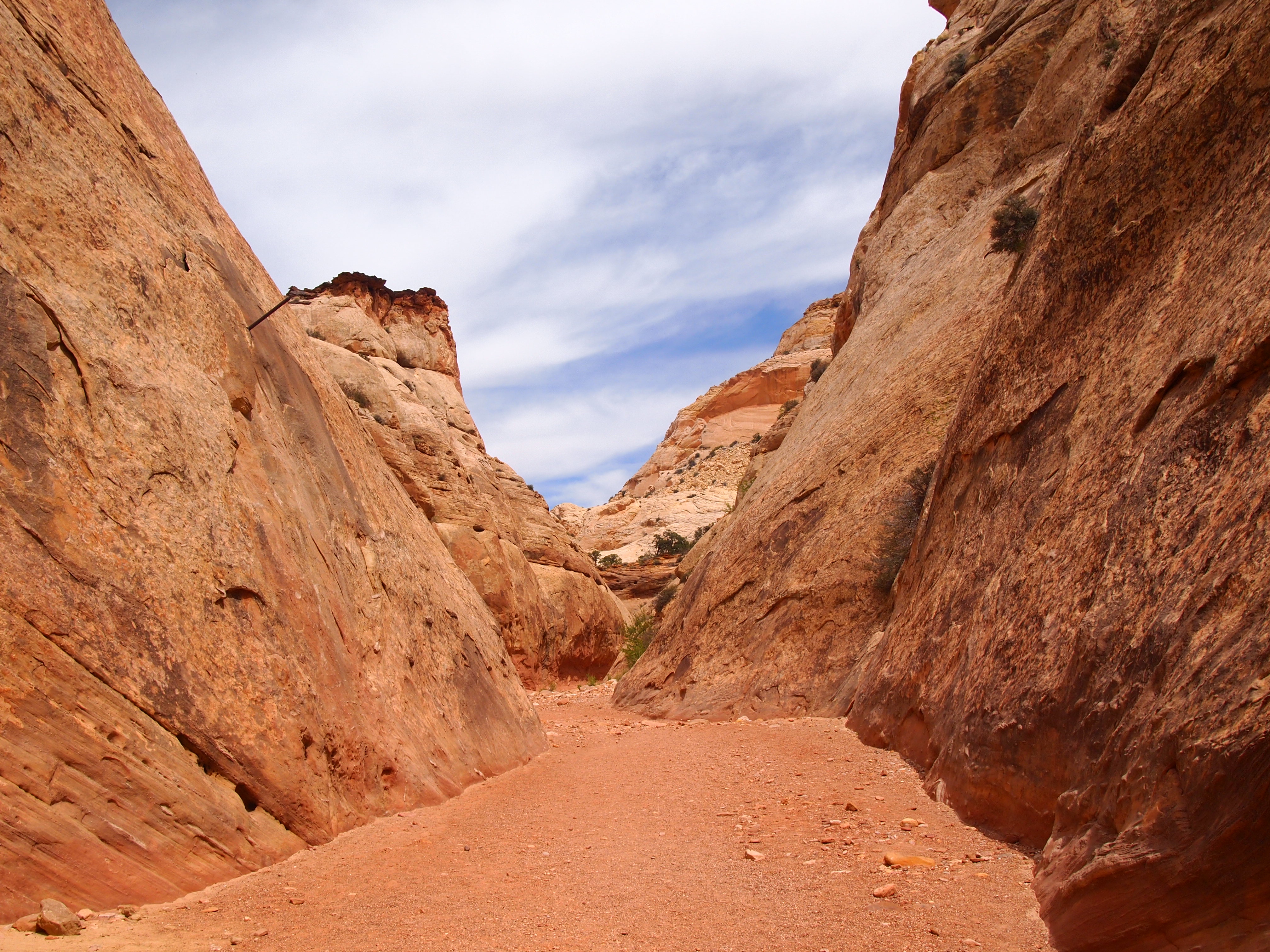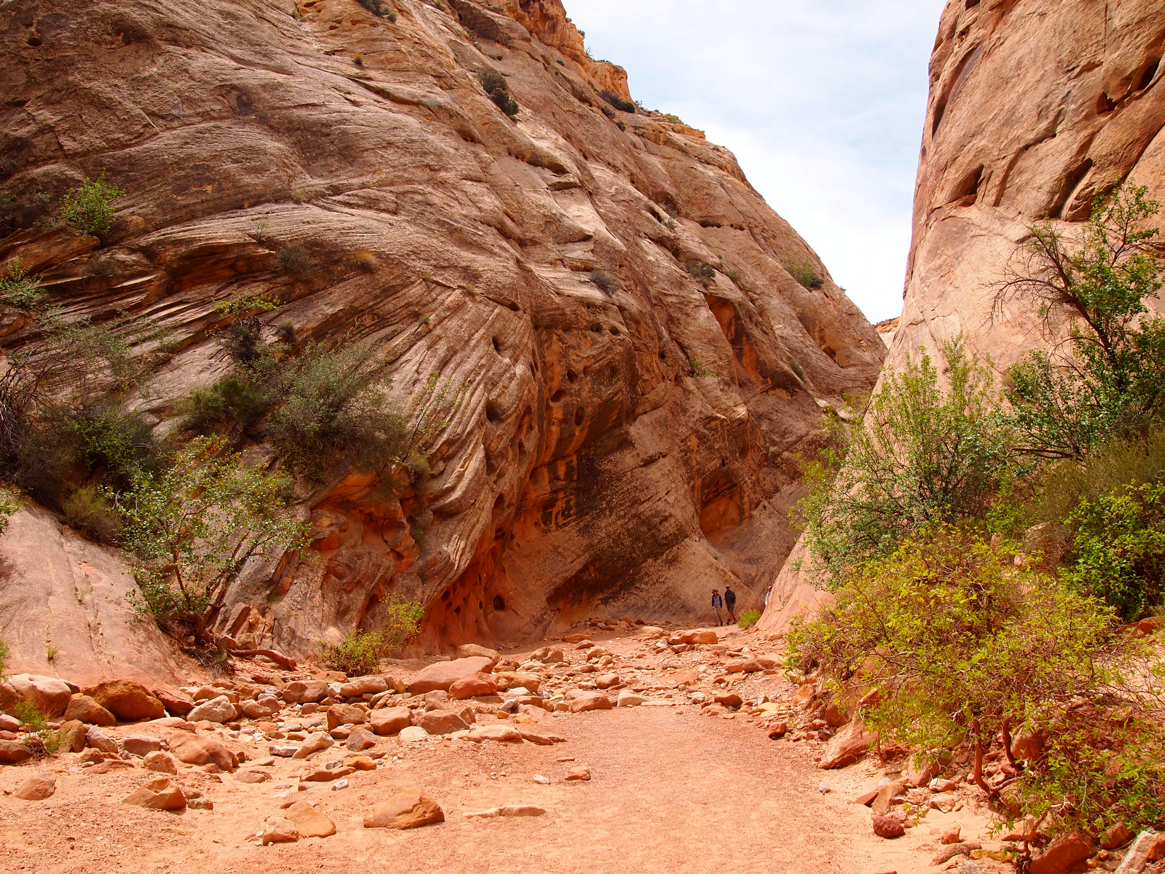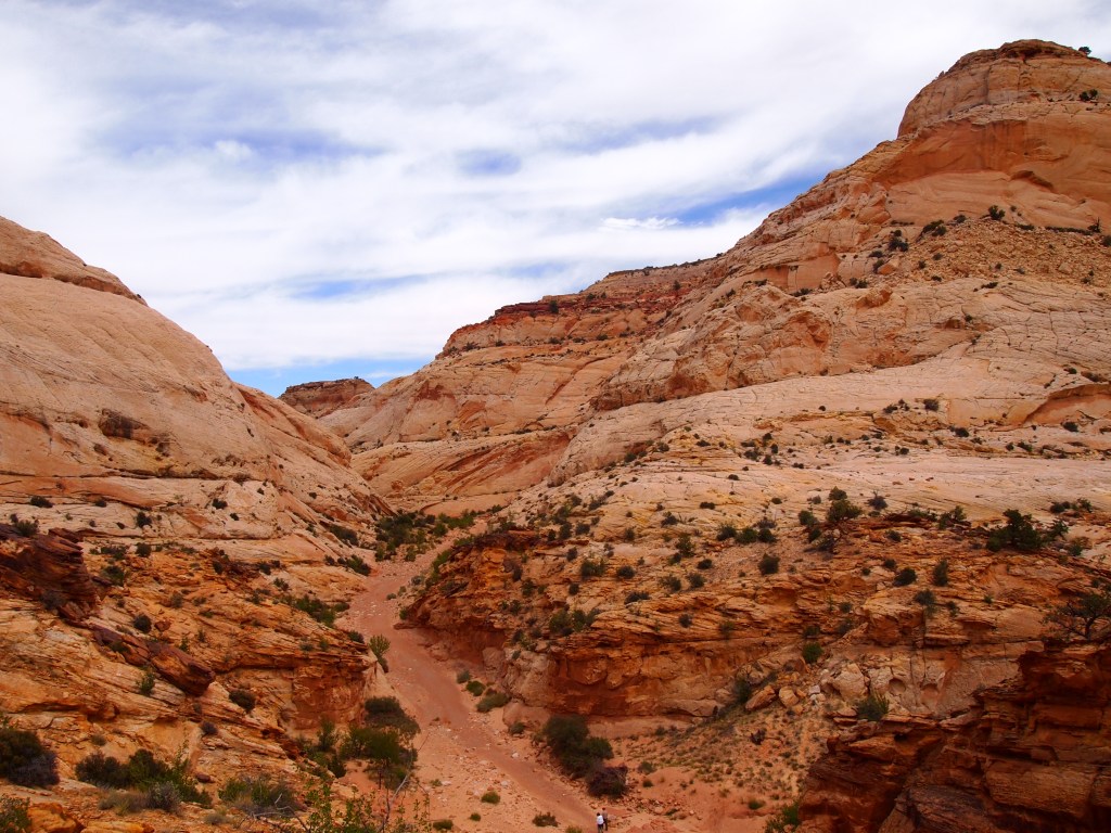 The trail through Capitol Gorge is a dry creek bed. It remains fairly level the entire time though visitors do have the option to hike up to the tanks, or tinajas as we’d say in Texas. The trail ends at the park boundary after a mile so it’s a pretty basic hike that anyone can do, young or old. Although it’s not a strenuous hike in the least, it’s a great way to feel the scale of the Fold and how formidable the journey must have been for anyone traversing this section of Utah. We chose to hike up to the tanks, and as is often the case, we were disappointed to find all but one empty. However, it was nice to get a higher perspective of the area surrounding the Gorge.