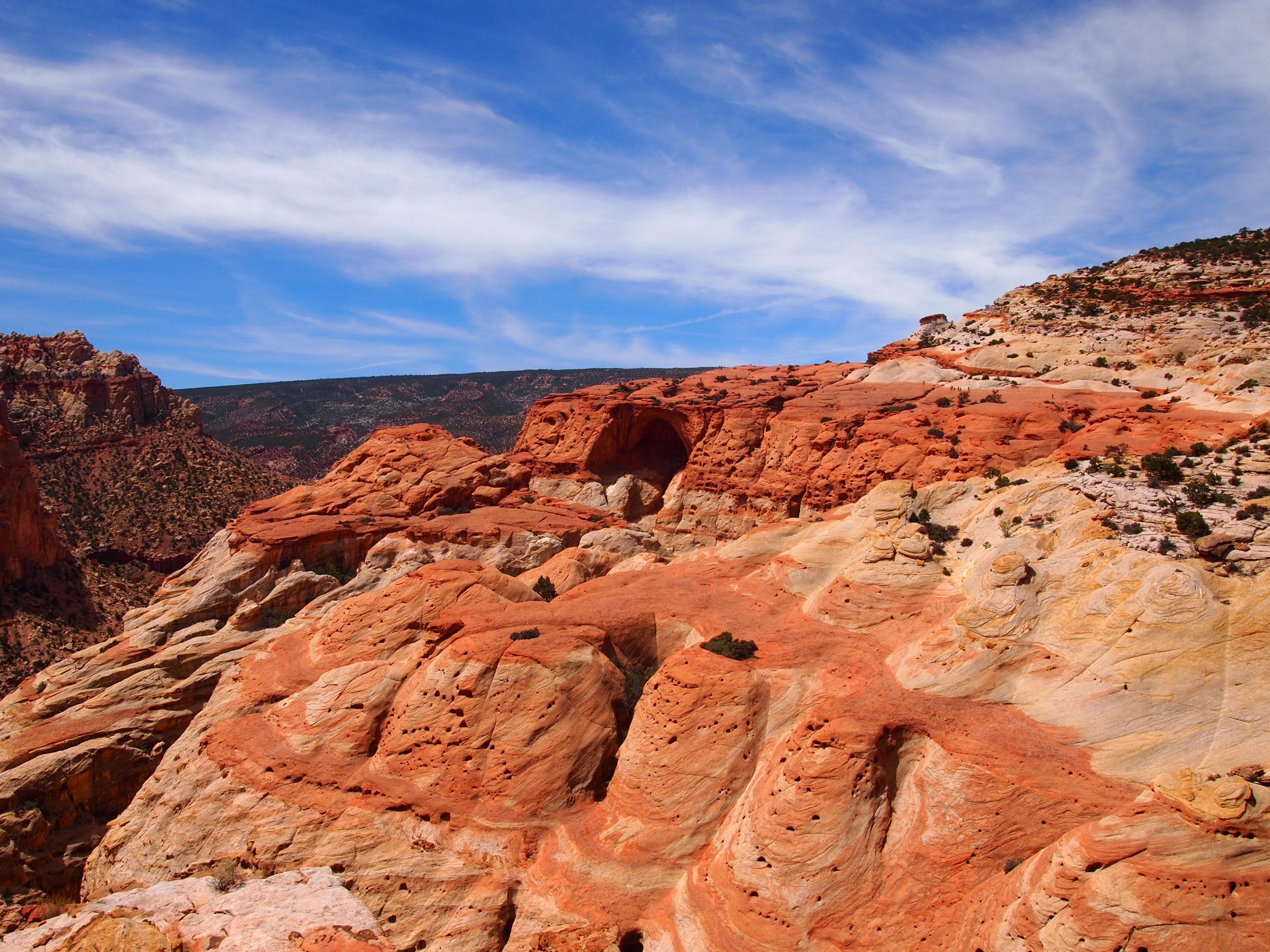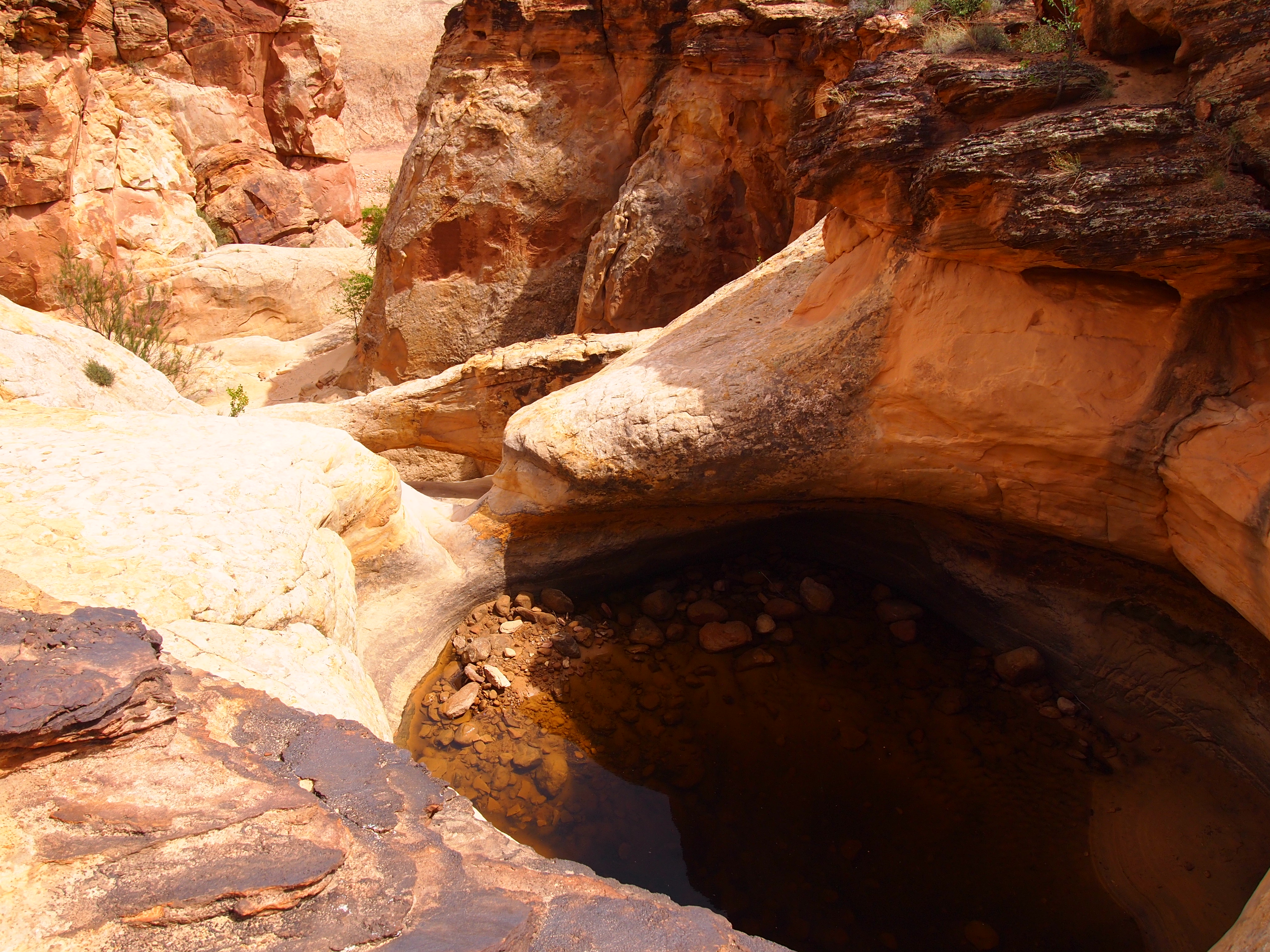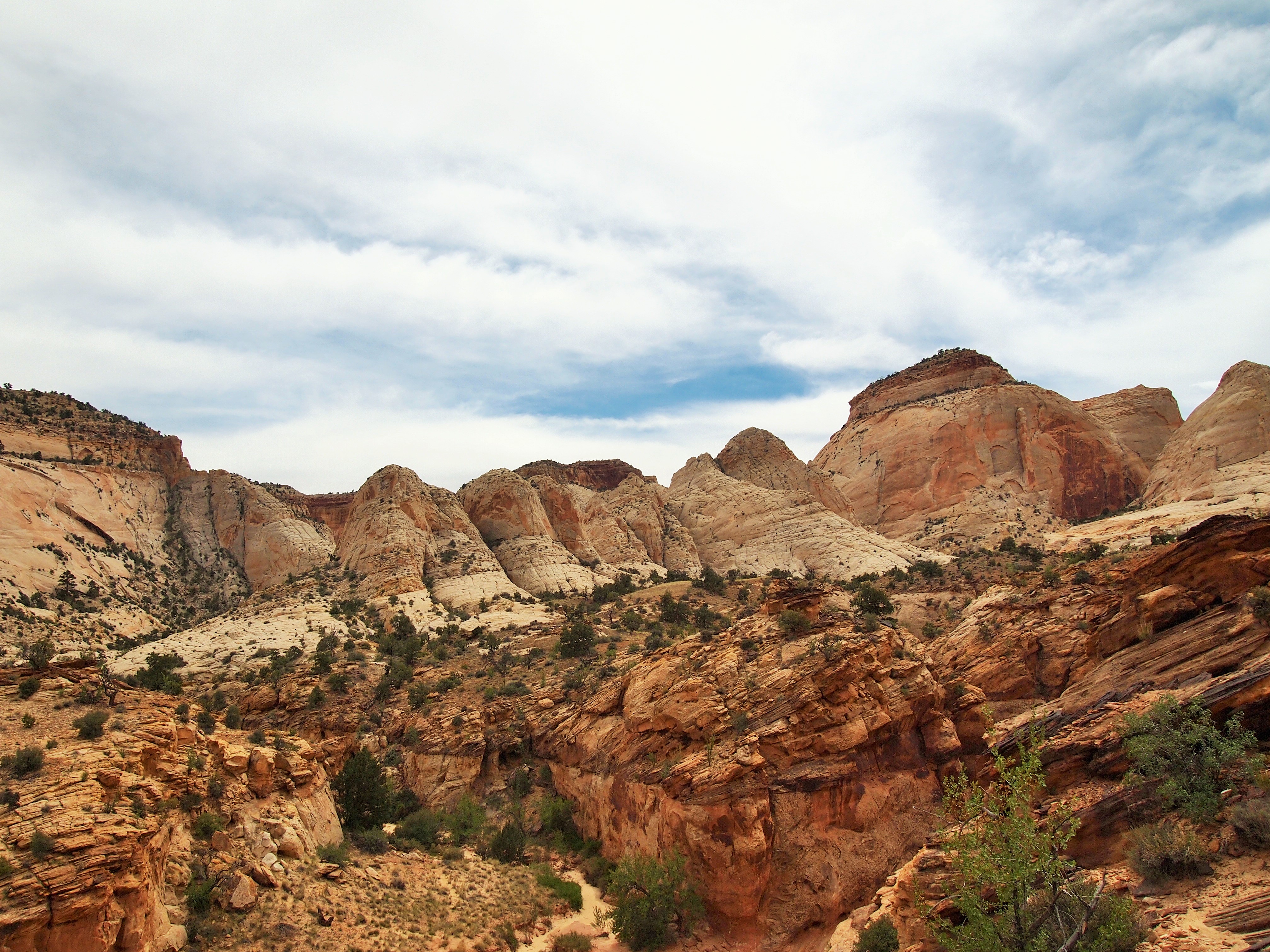 The trail through Capitol Gorge is a dry creek bed. It remains fairly level the entire time though visitors do have the option to hike up to the tanks, or tinajas as we’d say in Texas. The trail ends at the park boundary after a mile so it’s a pretty basic hike that anyone can do, young or old. Although it’s not a strenuous hike in the least, it’s a great way to feel the scale of the Fold and how formidable the journey must have been for anyone traversing this section of Utah. We chose to hike up to the tanks, and as is often the case, we were disappointed to find all but one empty. However, it was nice to get a higher perspective of the area surrounding the Gorge.
