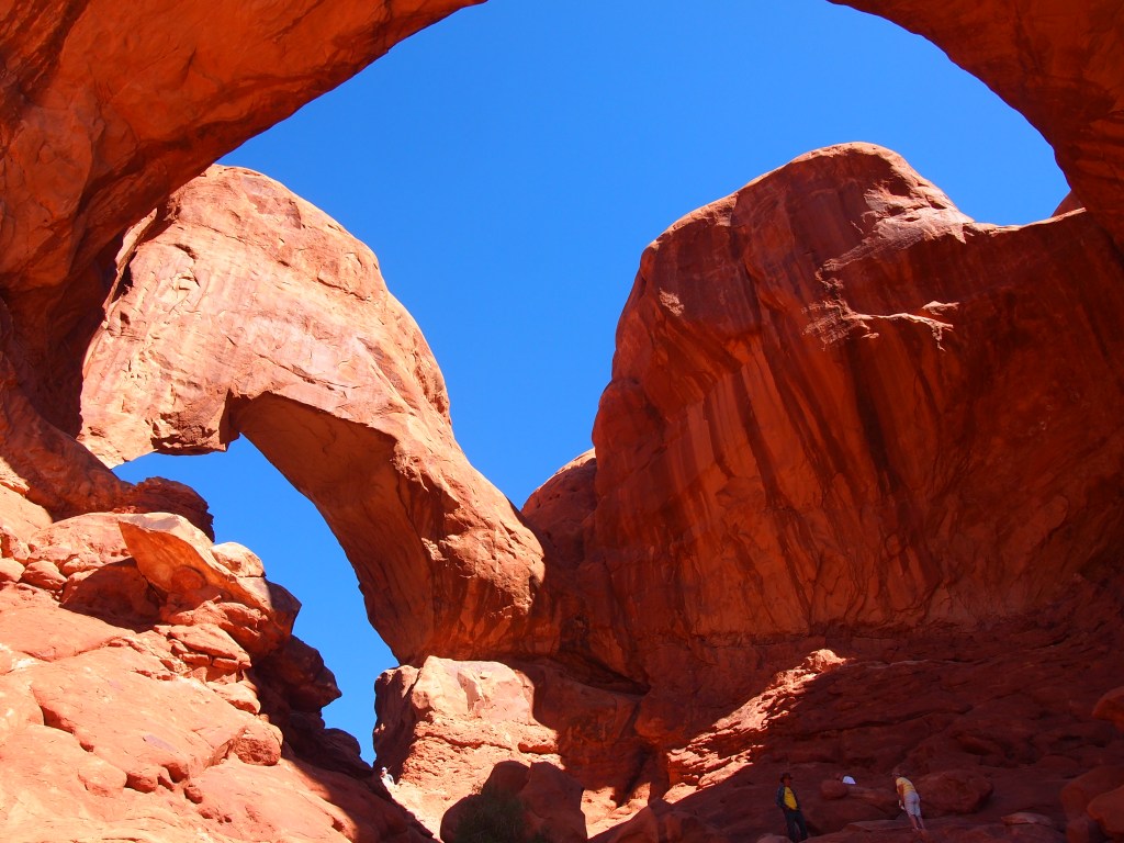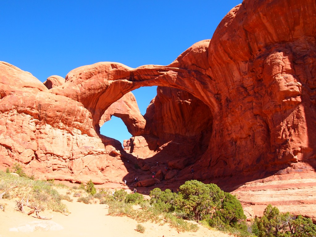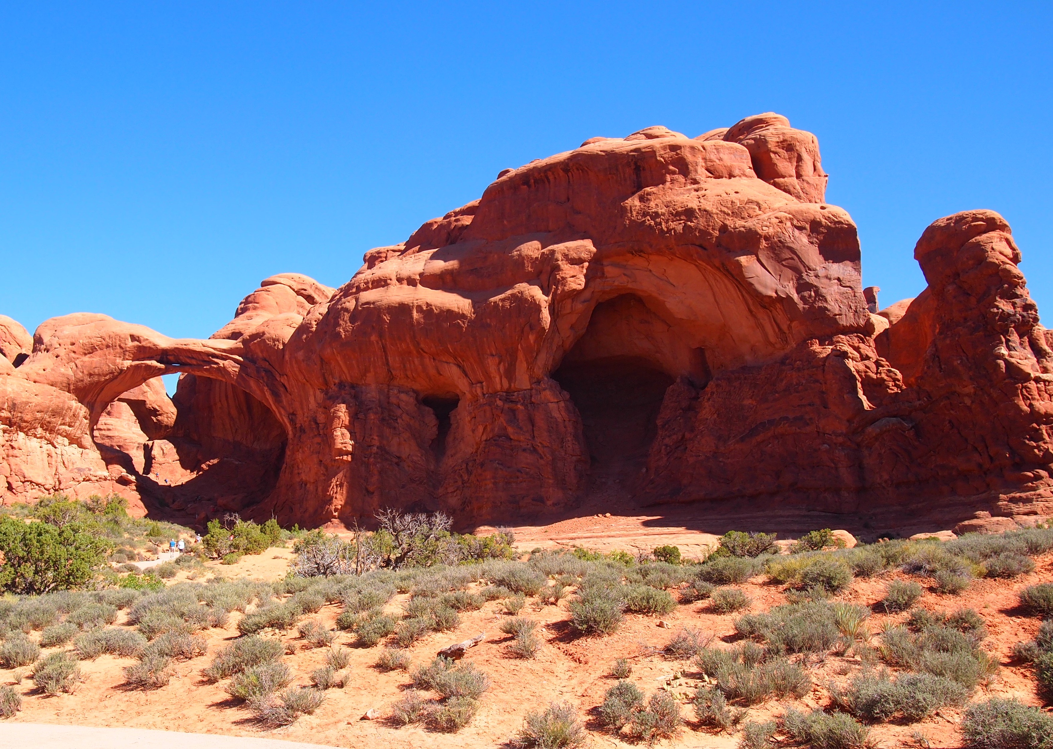 After we looped back around to the parking area, there were a couple more tour buses which had dropped off loads of people. Grateful to have missed the crowds, we went across the lot to Double Arch. Double Arch, an impressively large combination of two arches, is well worth the short trek. Double Arch may look familiar to fans of Indiana Jones and the Last Crusade; it was featured at the beginning of the film. Though the trail to Double Arch is easy, getting into the center of the arches requires a little climbing and scrambling.