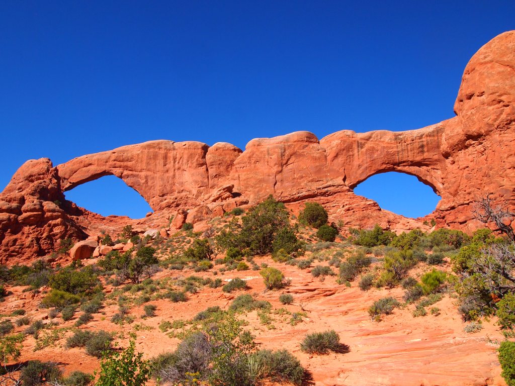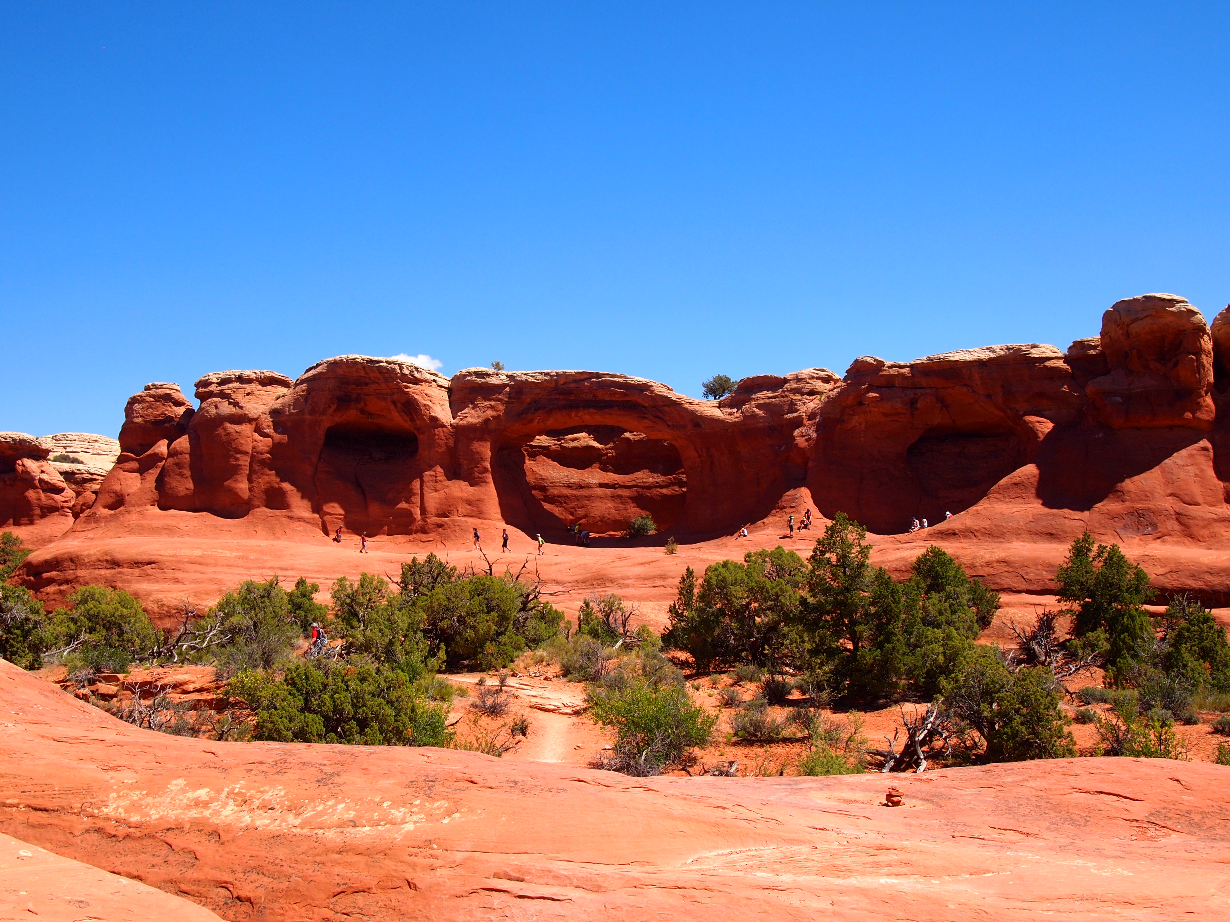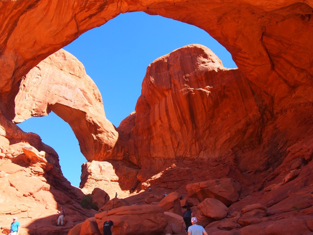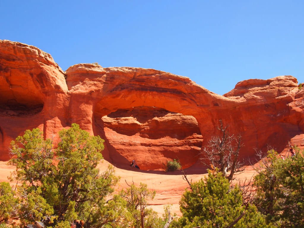 After we looped back around to the parking area, there were a couple more tour buses which had dropped off loads of people. Grateful to have missed the crowds, we went across the lot to Double Arch. Double Arch, an impressively large combination of two arches, is well worth the short trek. Double Arch may look familiar to fans of Indiana Jones and the Last Crusade; it was featured at the beginning of the film. Though the trail to Double Arch is easy, getting into the center of the arches requires a little climbing and scrambling.