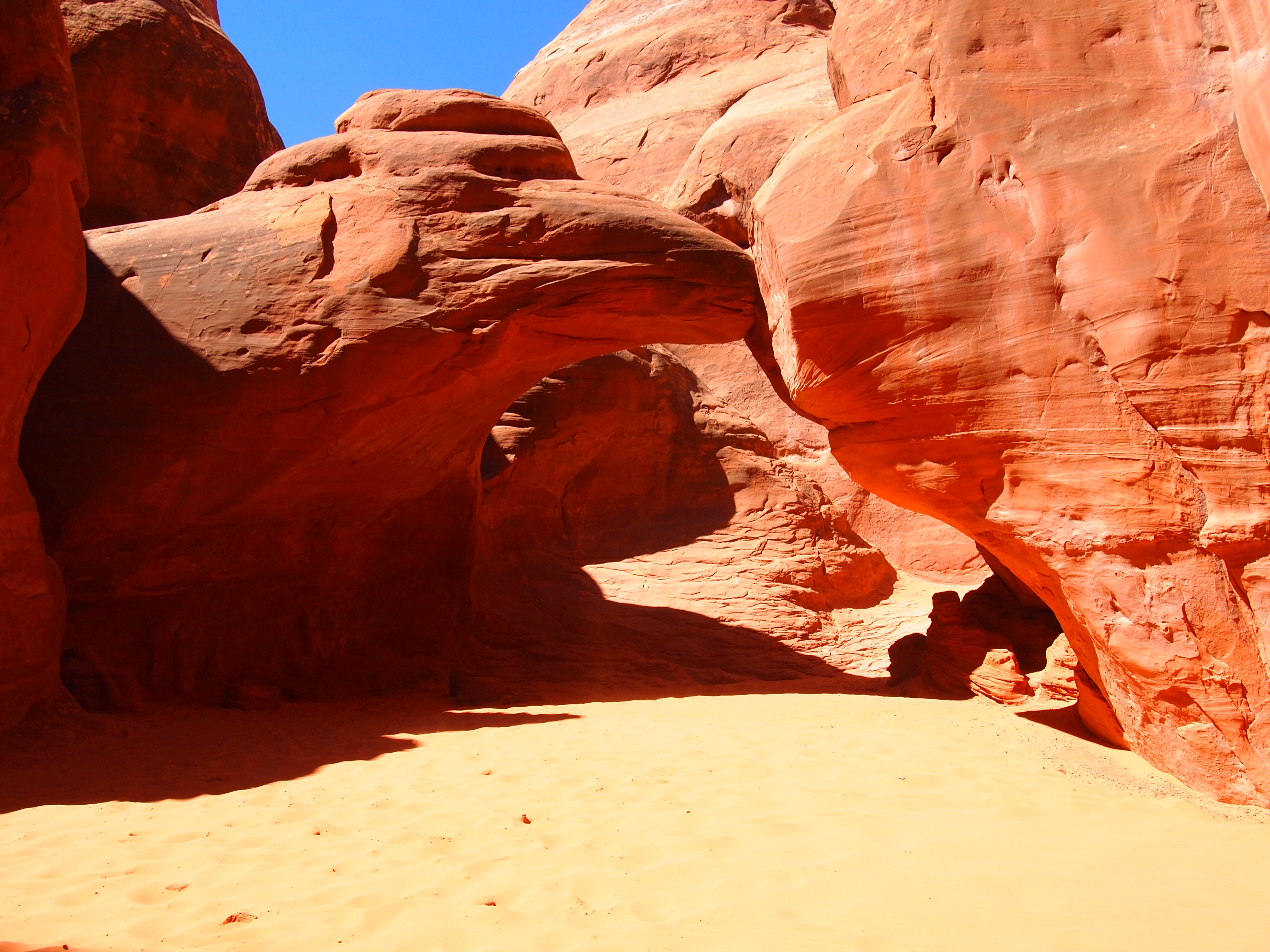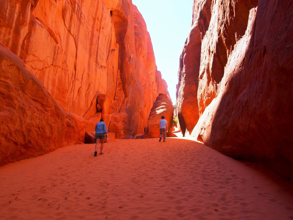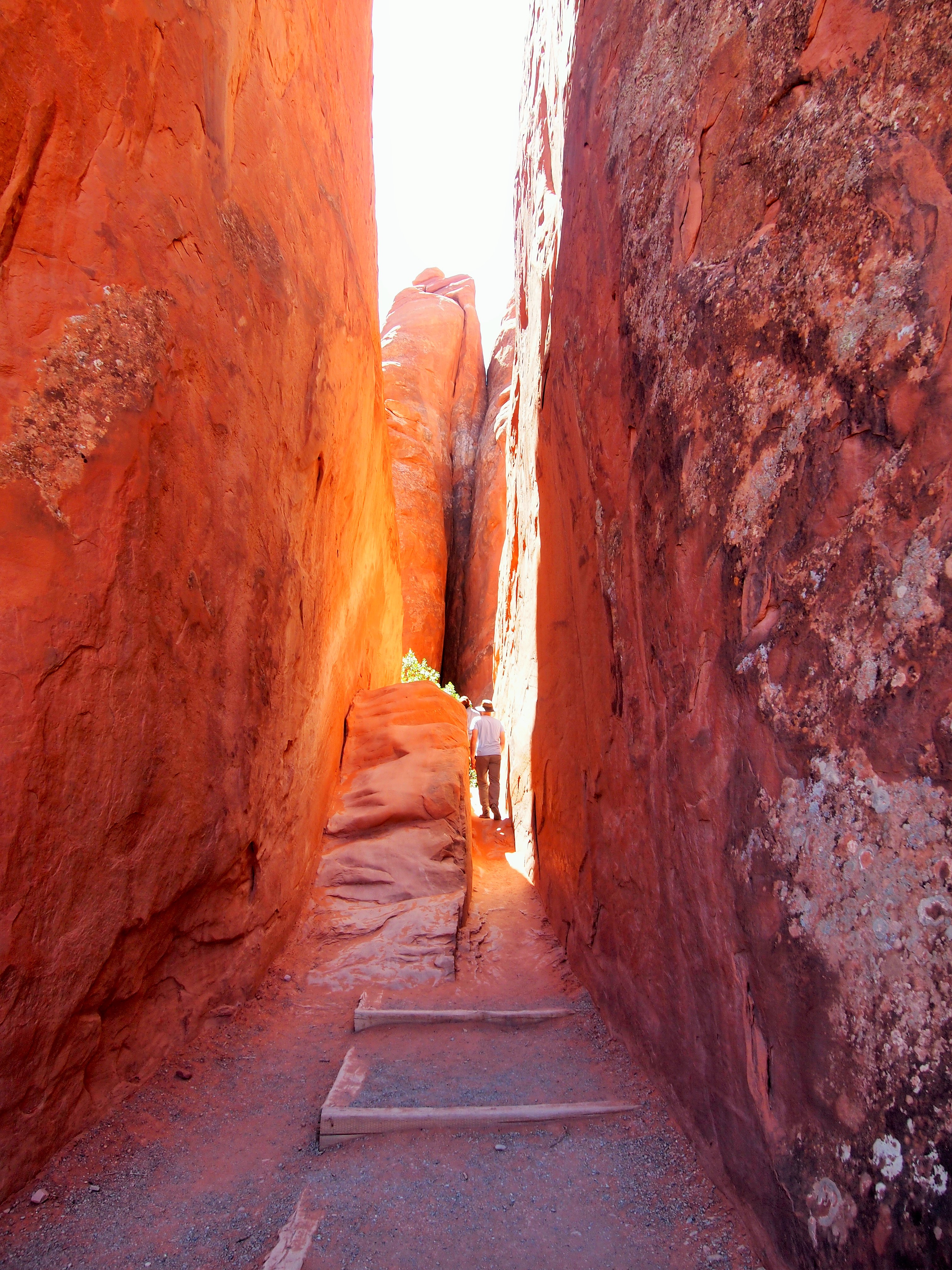 Though it wasn’t awful in the rest of the park, the gusty winds that day were especially tortuous during the short hike to Sand Dune Arch. Past a narrow opening in the rocks, the trail becomes a blanket of soft sand. With each gust, sand was whipped up into our faces and thrown on the backs of our legs. Due to recent rock falls, a sign encouraged hikers to keep a safe distance from the arch so we decided not to stand too close.