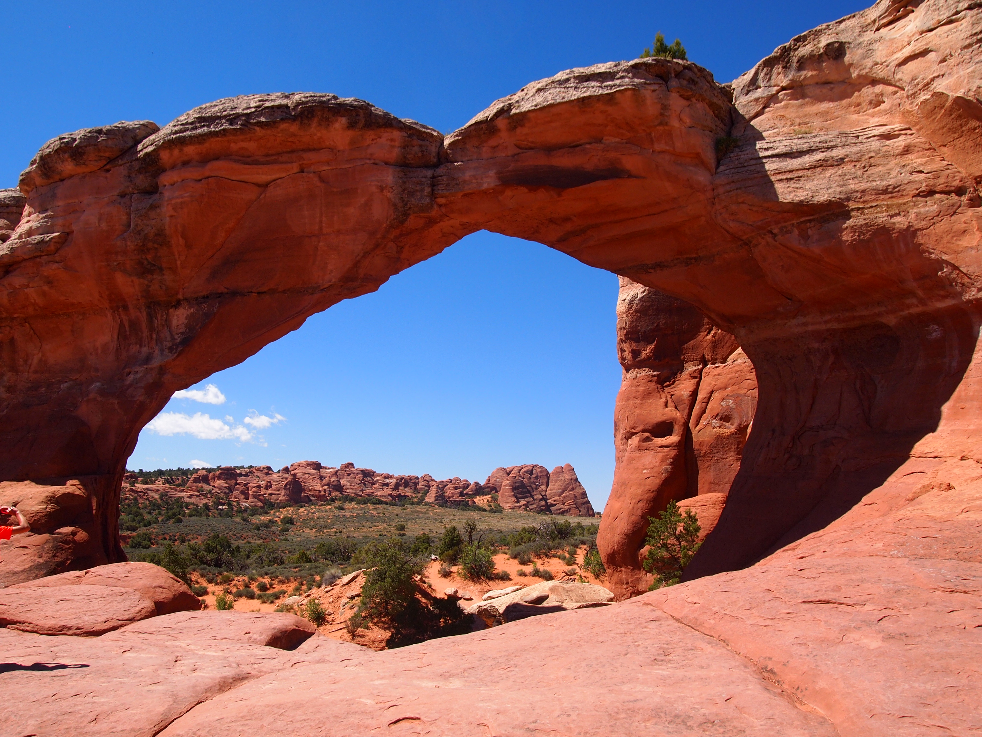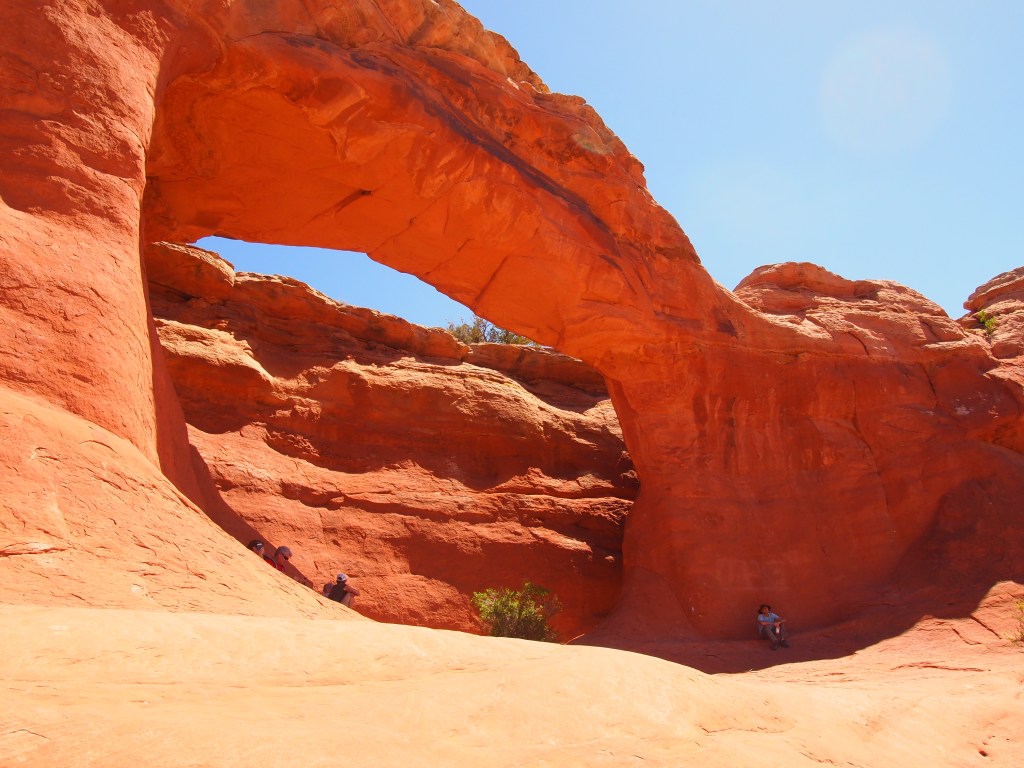 We left the sand trap to begin the longer hike to Broken and Tapestry Arches. The first part of the hike led us across an open meadow of sage brush to Broken Arch. We had to climb through the arch to continue on the trail. I thought the view of the arch was actually better from the back and for a brief moment we had it to ourselves. We continued through more open meadow, coming upon slickrock every once in a while, until the trail turned toward Tapestry Arch when it became all slickrock – though we didn’t have to do much scrambling to reach the arch. We were grateful for the wind at this point, as the sun had reached its zenith and blazed down on us for the duration of the hike.