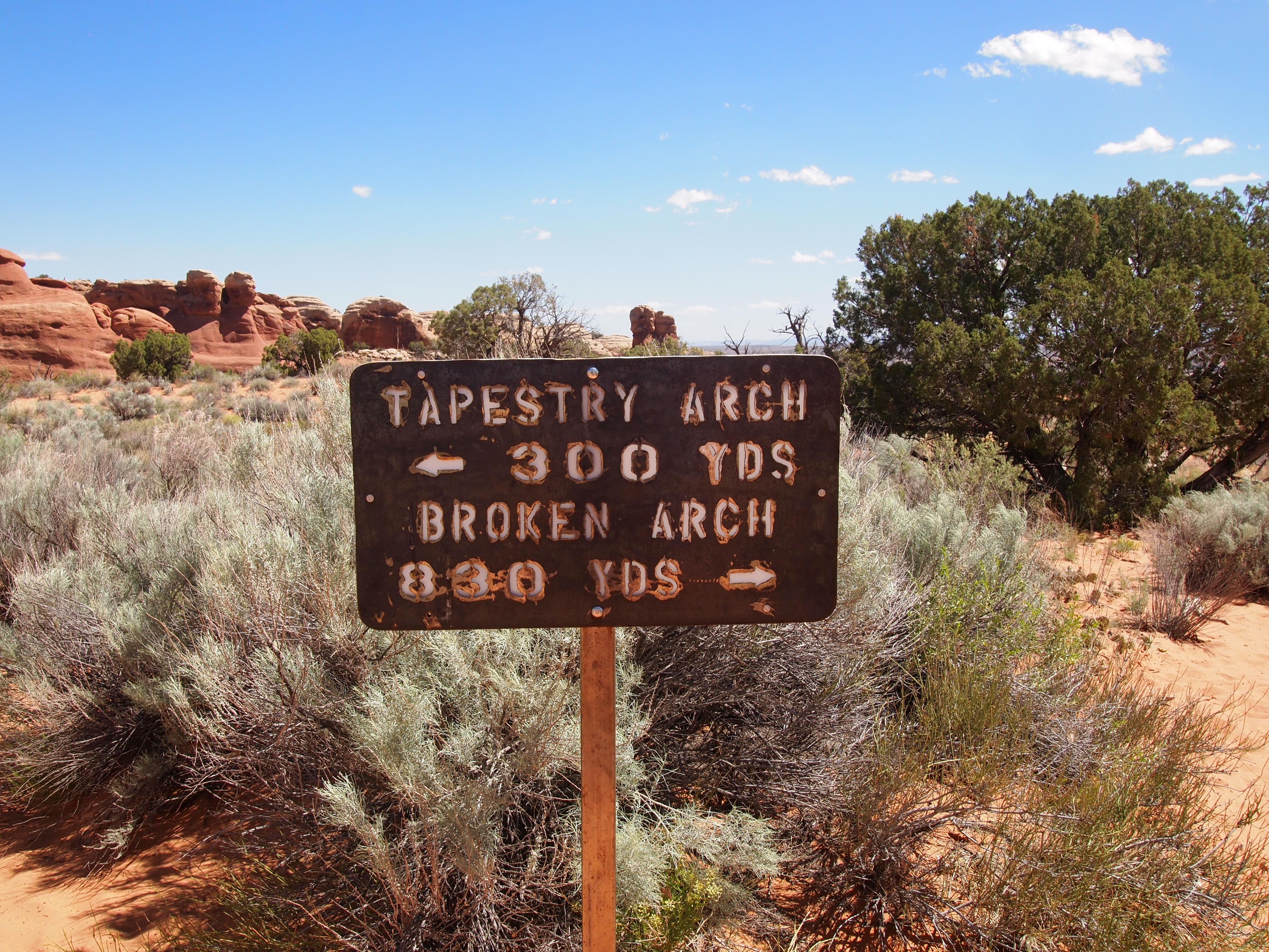 We left Double Arch with one more hike in mind for the morning. Since Devil’s Garden was closed, the park road stopped at the trailhead for Sand Dune Arch, a short 0.3 mile hike that can be combined with Broken Arch to make a larger 2 mile loop. Although part of the loop was closed due to the construction, we were still able to hike to Broken Arch and farther on to Tapestry Arch; we just had to double back the same way we came in.