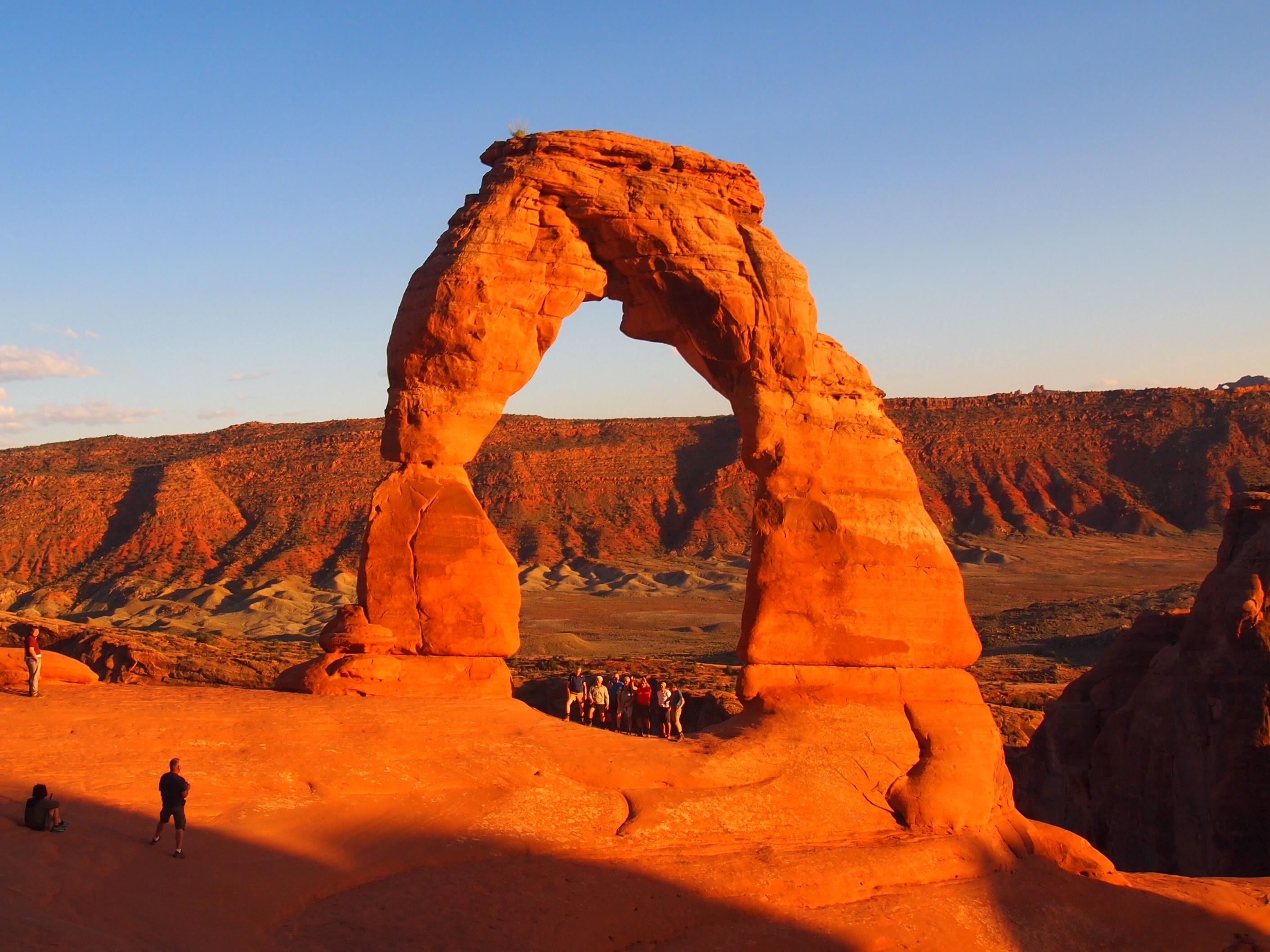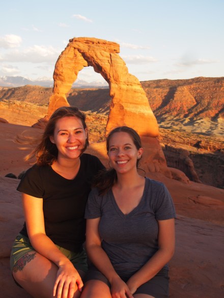 When we hiked to Delicate Arch in November, Andy the photographer told us we needed to do it again at sunset because the light on the arch is stunning. So that was the plan! We decided to start our hike at 7pm, a little more than an hour before sunset (8:20) so that we could get to the arch and stake out a decent spot to watch the light change. We reached the arch around 7:30pm which was the real magic hour. The arch was fully illuminated by the sun’s glow, and it was truly spectacular. As the sun continued its descent, we watched shadows creep up onto the arch. It wasn’t a bad way to end the day at Arches NP. (To get the best views of the arch near sunset, I’d suggest going an hour and a half before sunset to catch it in its full glory.)