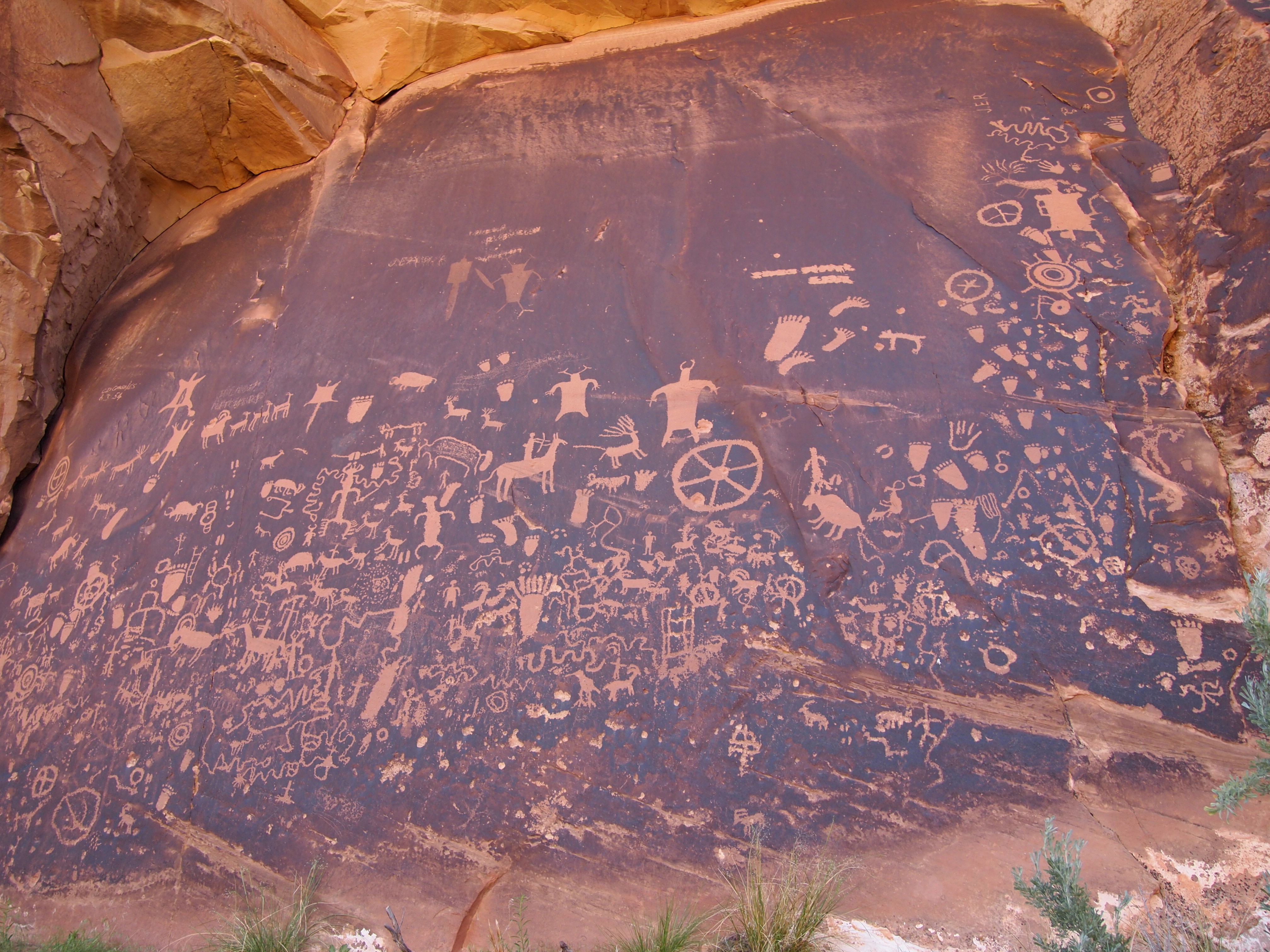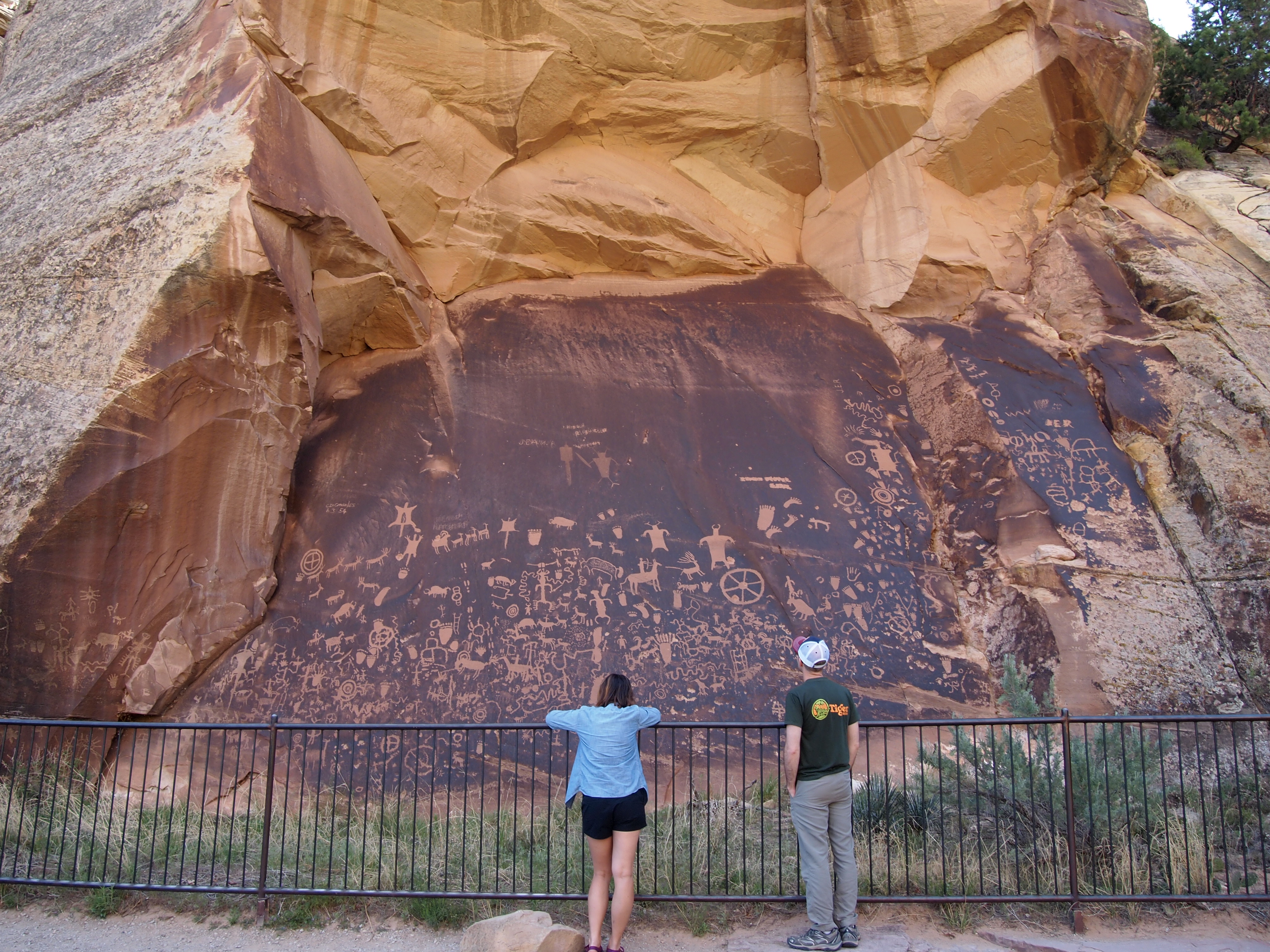 Just off the road, this giant collection of petroglyphs is believed to be a record of 2,000 years of activity. Early peoples are thought to have contributed to this slab of rock over time, each person adding their own account of life. More recently, early settlers also made additions – we noticed some initials and dates on the periphery of the slab. The sheer size of the panel puts everything we saw in Nine Mile Canyon to shame; it’s massive. Many of the figures and shapes were similar although we hadn’t seen any footprint etchings before.