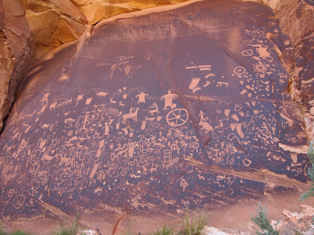 The Needles is in the southeast corner of Canyonlands and fairly remote. It’s 40 miles south of Moab on US 191 and then another 35 miles down UT 211, the only paved road in and out of that section of the park. We knew it would be a drive so we grabbed some coffee at our go-to spot in Moab – Red Rock Bakery & Cafe – and hit the road before 8am. I love the drive between Monticello and Moab; the high desert sage brush mixed with the red rock landscape is what makes southern Utah so picturesque. Before we arrived at the park, we stopped at Newspaper Rock State Historical Monument.