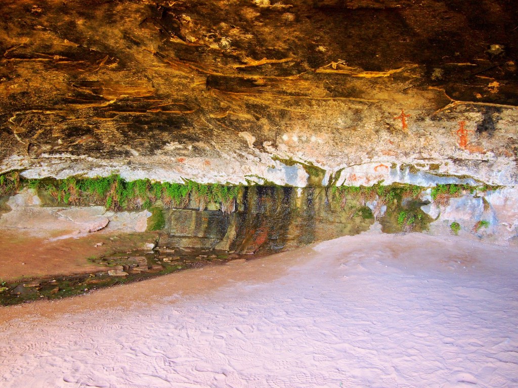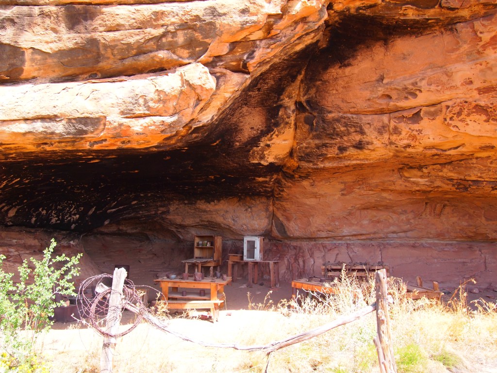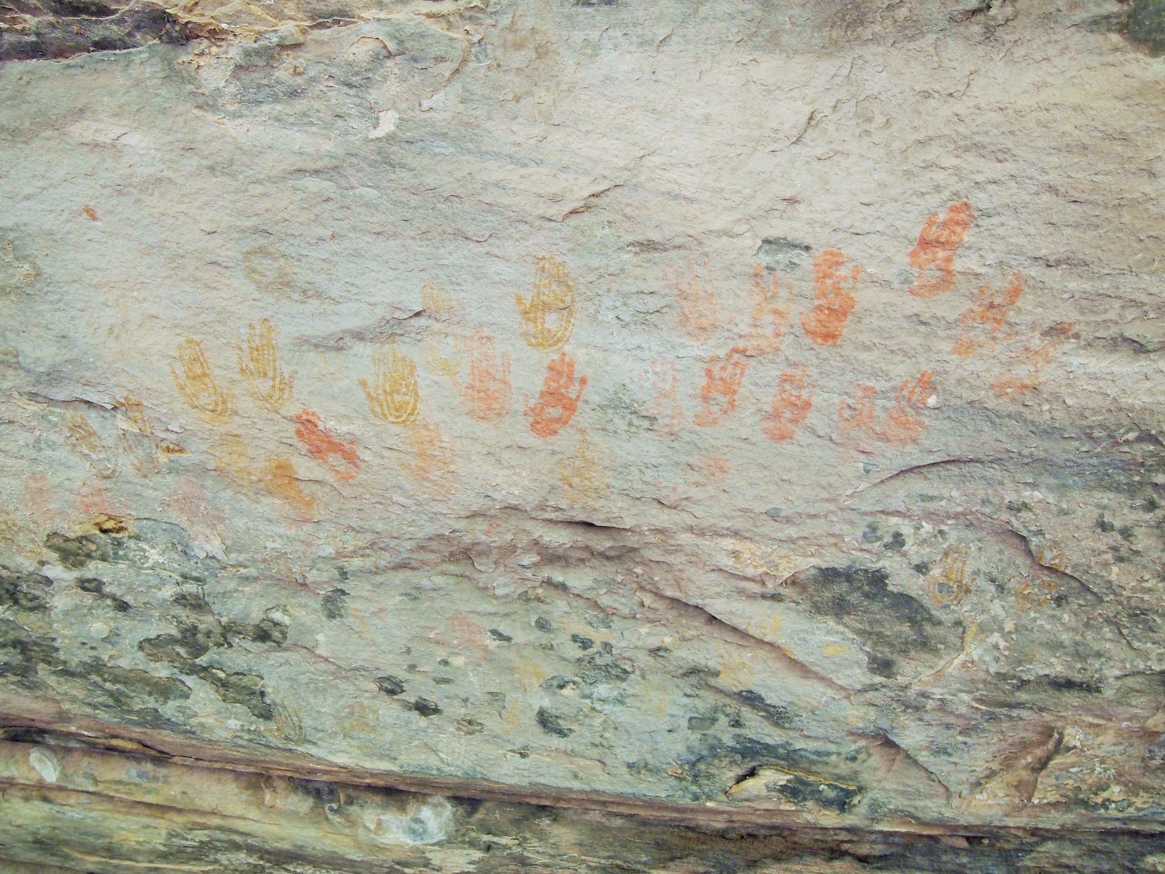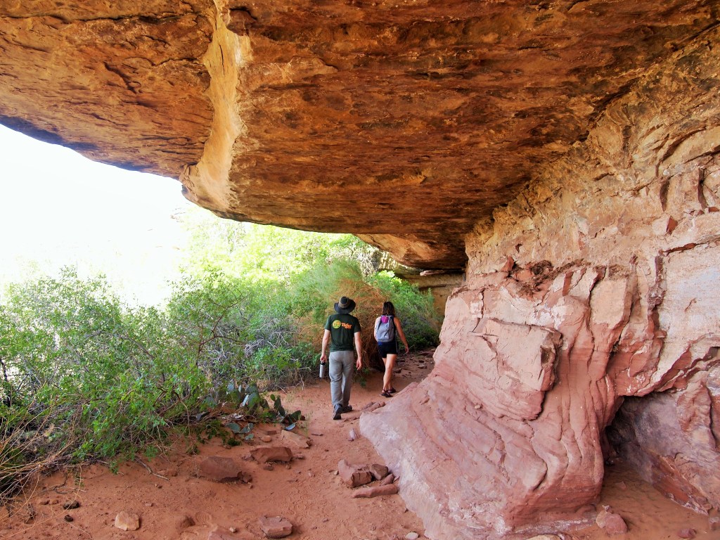 I was a little skeptical about Cave Spring as the description on the trail map – “historic cowboy camp & prehistoric petroglyphs” – sounded boring. I was delightfully surprised by the hike; it was a nice little loop, and I was happy we did it. The first part took us by an abandoned cowboy camp – as promised – and the cave spring, the trail’s namesake. Much of the trail was under the overhanging lip of the rock, providing a nice shady respite from the sun. Some of the rock near the cave spring was etched with petroglyphs but the most surprising was the cluster of colorful hand prints.