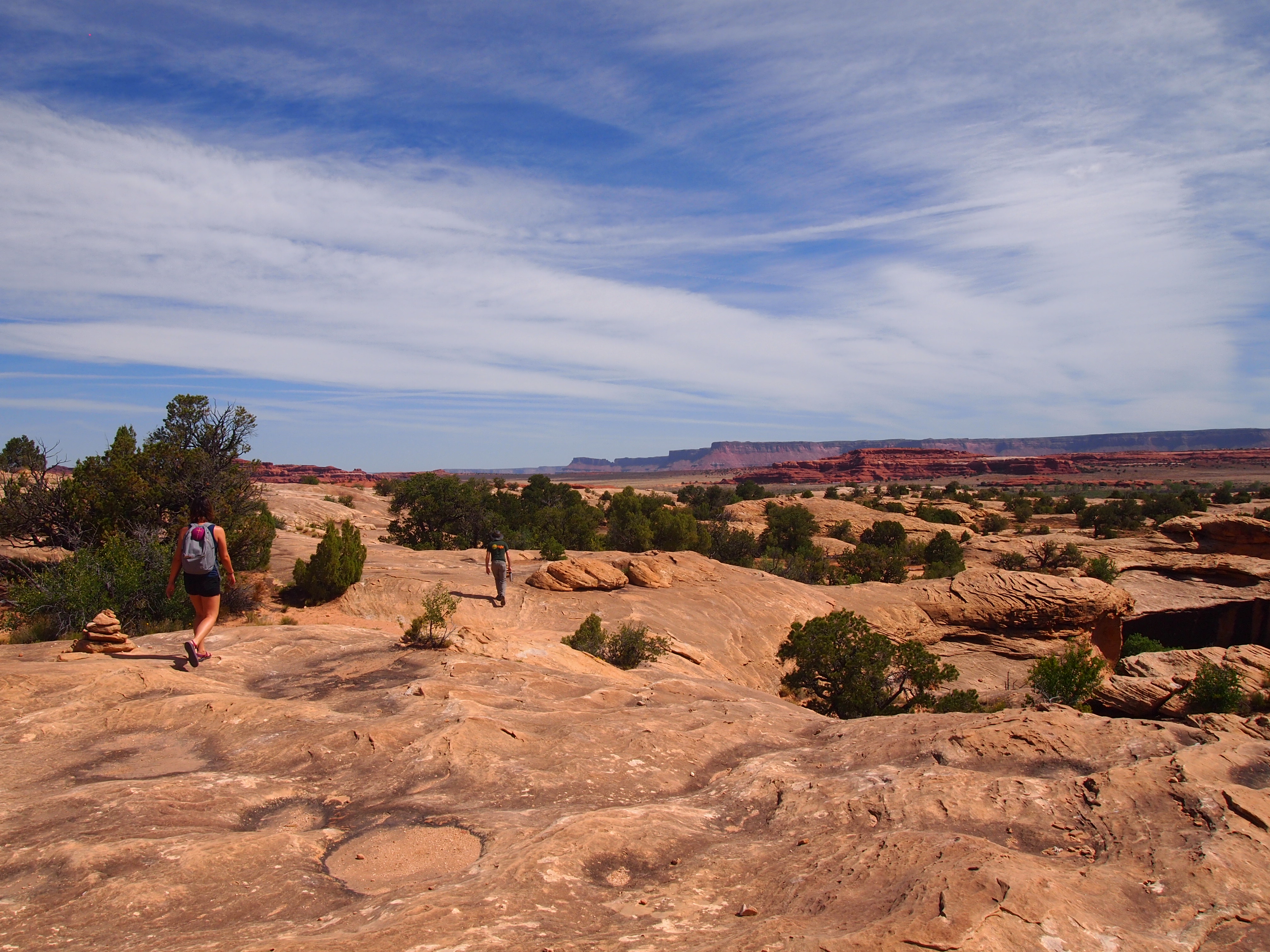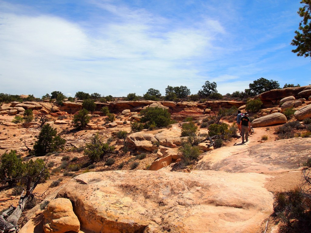 After leaving Newspaper Rock, the road opened up into a large and breathtaking valley leading us the rest of the way to The Needles district. Similar to Island in the Sky, there is a scenic drive and an overlook for the less able of visitors, but the majority of the district caters to hardy backpackers and day-hikers. Since we didn’t get a particularly early start (it was around 10am when we finally arrived) and we wanted to be able to get in a visit to Island in the Sky later, I chose the longest of the short day hikes, the 2.4 mile Slickrock Trail. When we stopped in the Visitor’s Center, the ranger also recommended tacking one of the tiny hikes on to our itinerary, a 0.6 mile loop trail called Cave Spring.