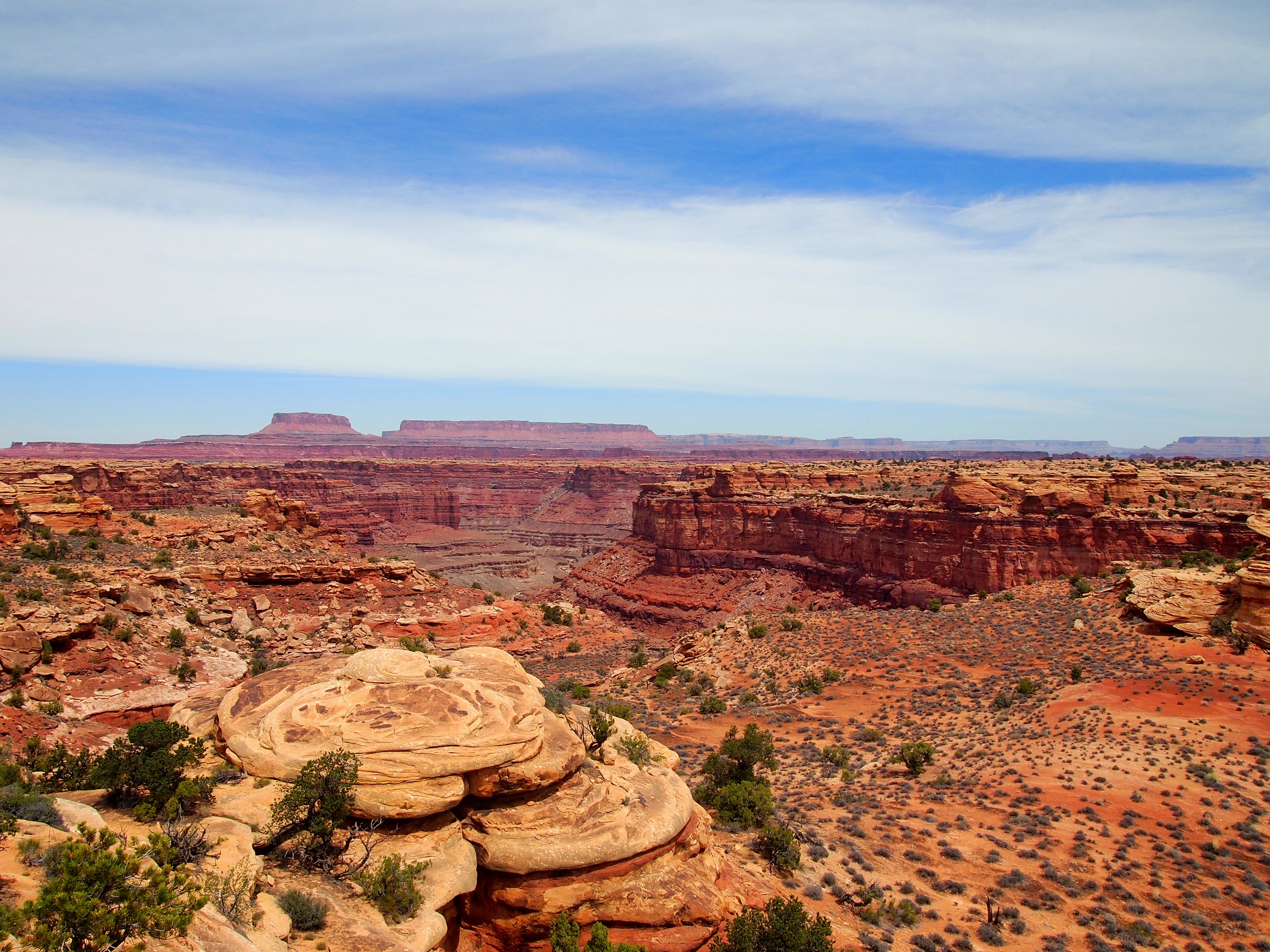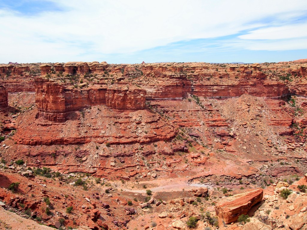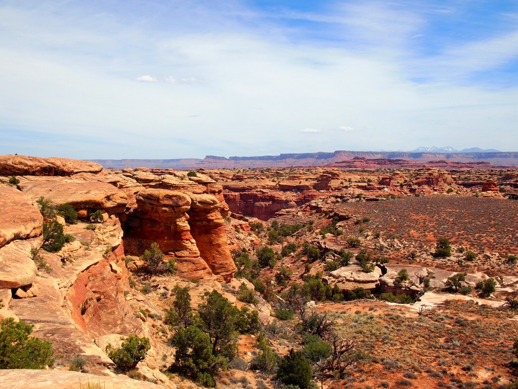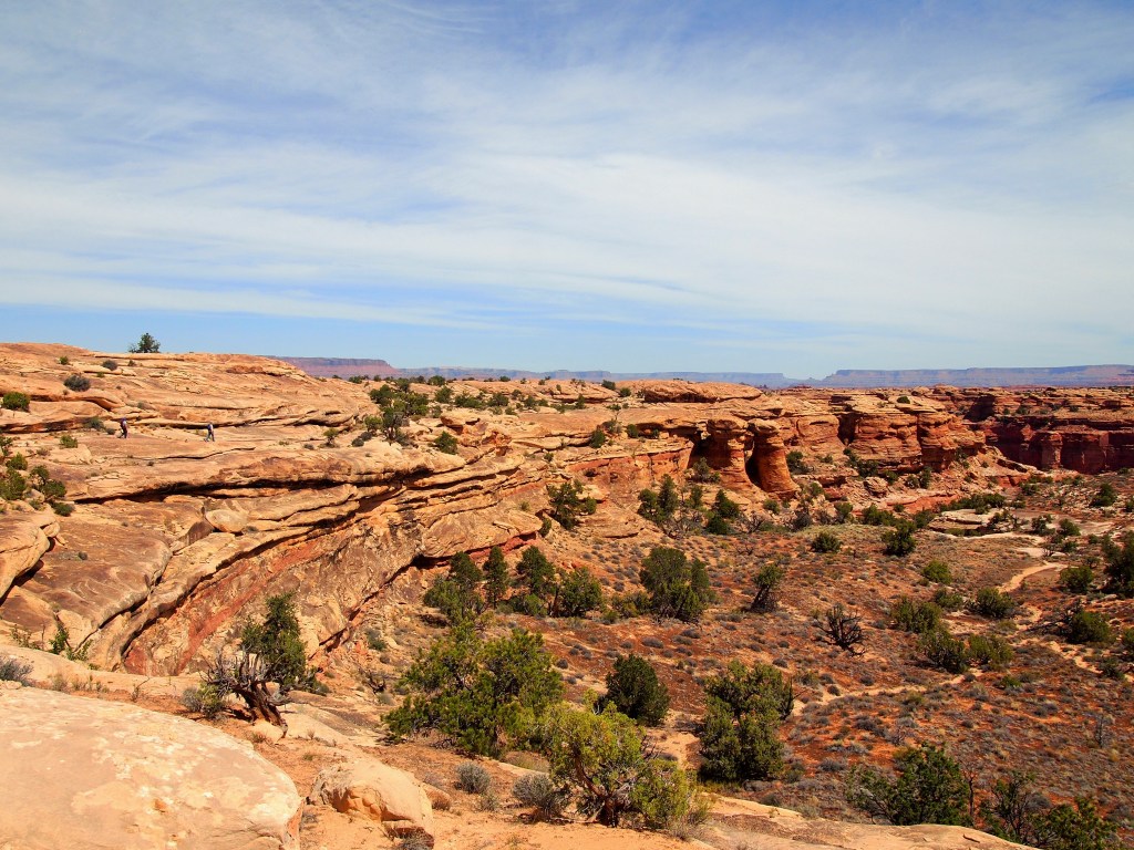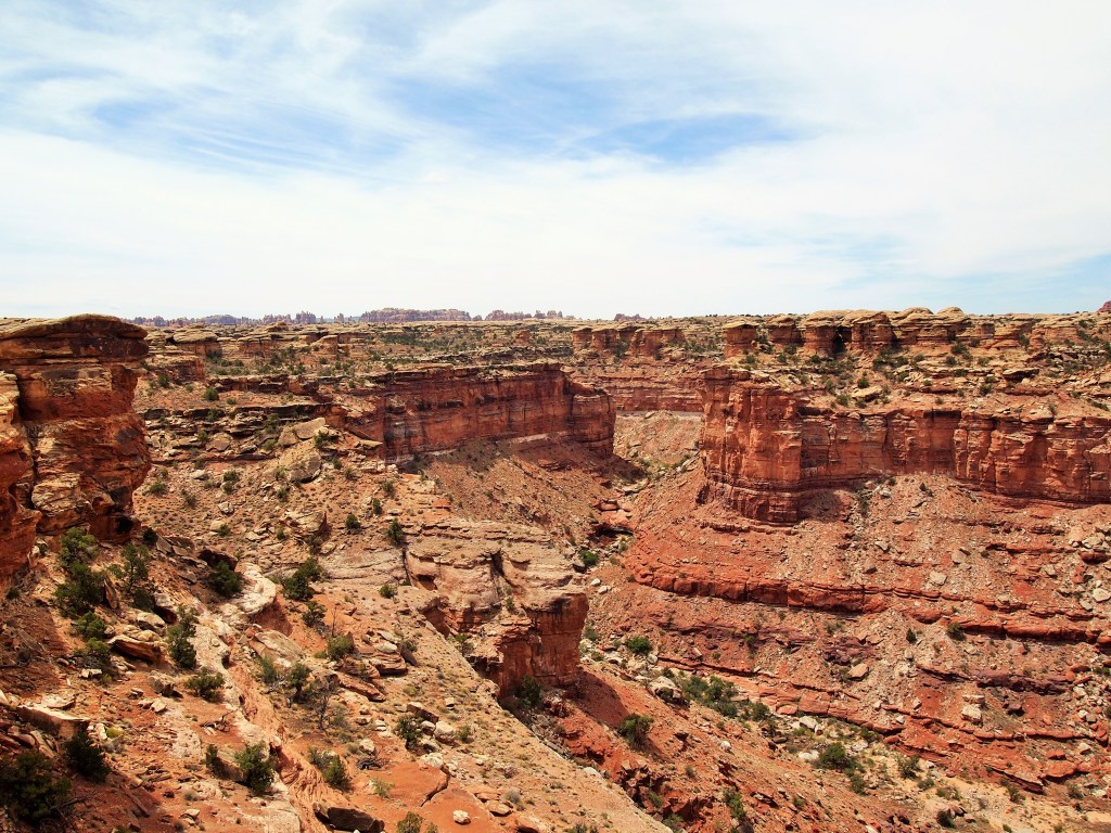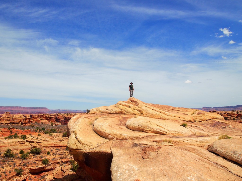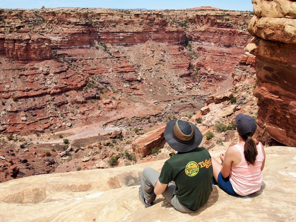 By the third viewpoint over Lower Little Spring Canyon, we could see our destination – Big Spring Canyon – a bit clearer. In the distance Island in the Sky is visible as well. At Viewpoint #4 over Big Spring Canyon we stopped to have a snack and hang out a bit before beginning the loop back around to the parking area. A giant raven hassled us for some food – we didn’t relent – and I thought about how terrible it would be to lose your balance standing on the edge. Breathtaking.