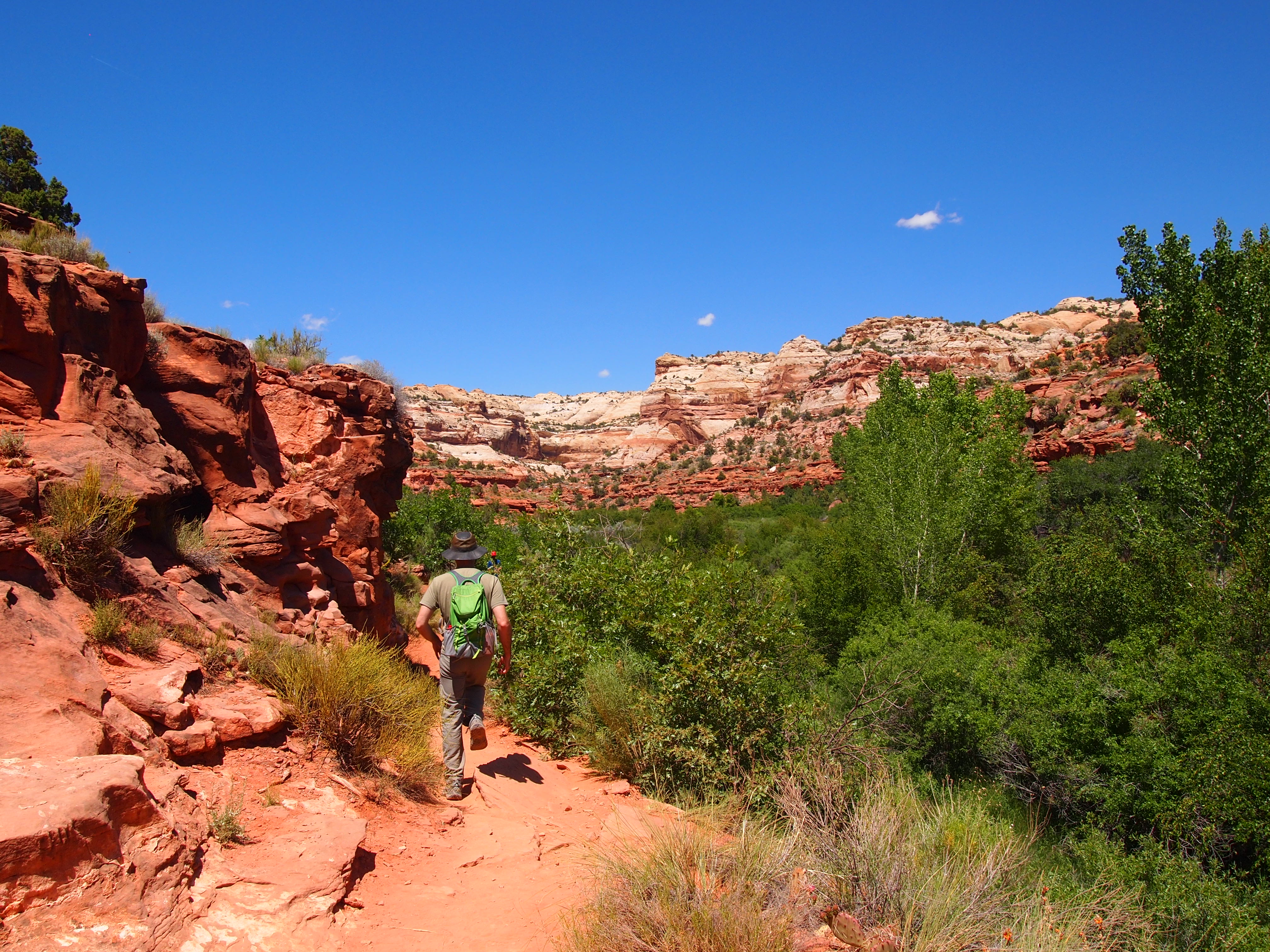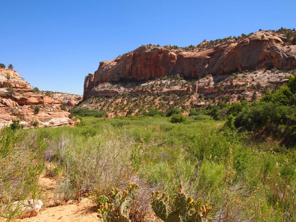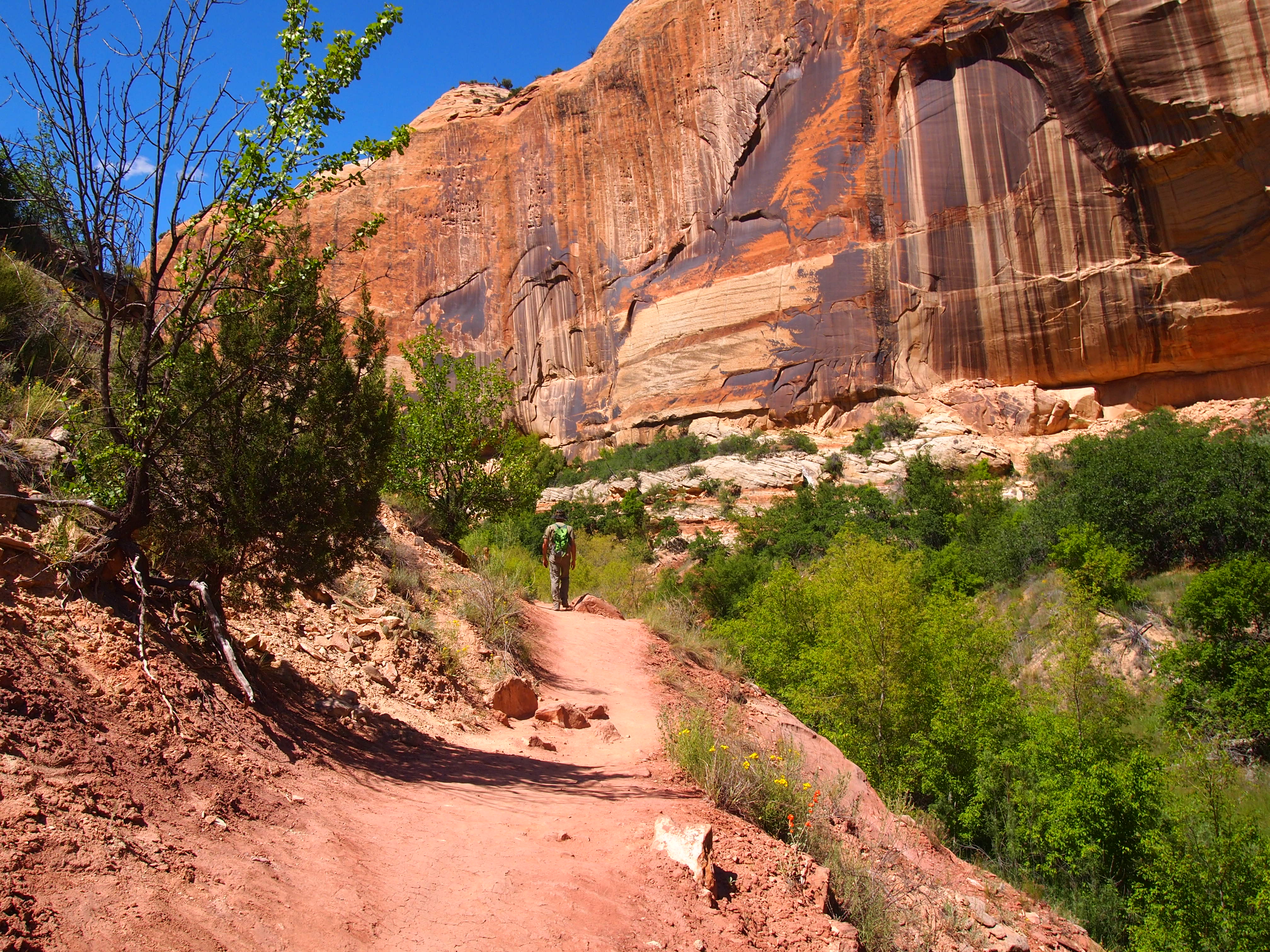 Lower Calf Creek Falls showcases a different side of GSENM. Here you see the life-giving force of water as the trail skirts the lush canyon floor along Calf Creek. Although the trail doesn’t directly follow the creek, its presence is evident. The vibrant green of the plant life around the creek was beautiful especially against the varying red hues of the canyon walls. Combine that with a bluebird sky and it was hard to take a bad photo. With that said, much of the trail is exposed; you aren’t trading a day in the sun for a day in the shade. Thankfully, we had a couple things going for us. We began our hike around 2pm – during the peak of the sun’s heat, yes – but since we were heading northwest, the sun was mostly at our backs as we hiked to the waterfall. As we hiked back out, the sun’s glare had shifted and was kept mostly behind the canyon walls giving us fairly shaded 3 mile journey back.