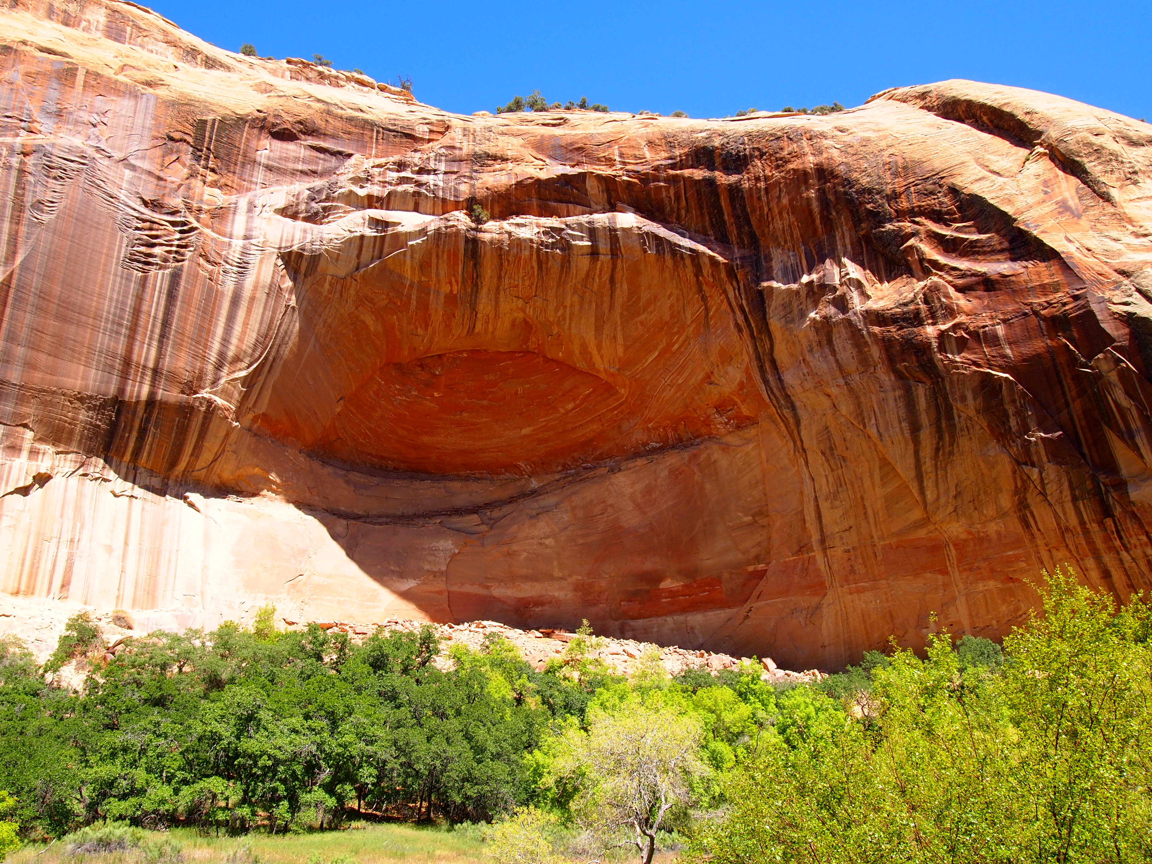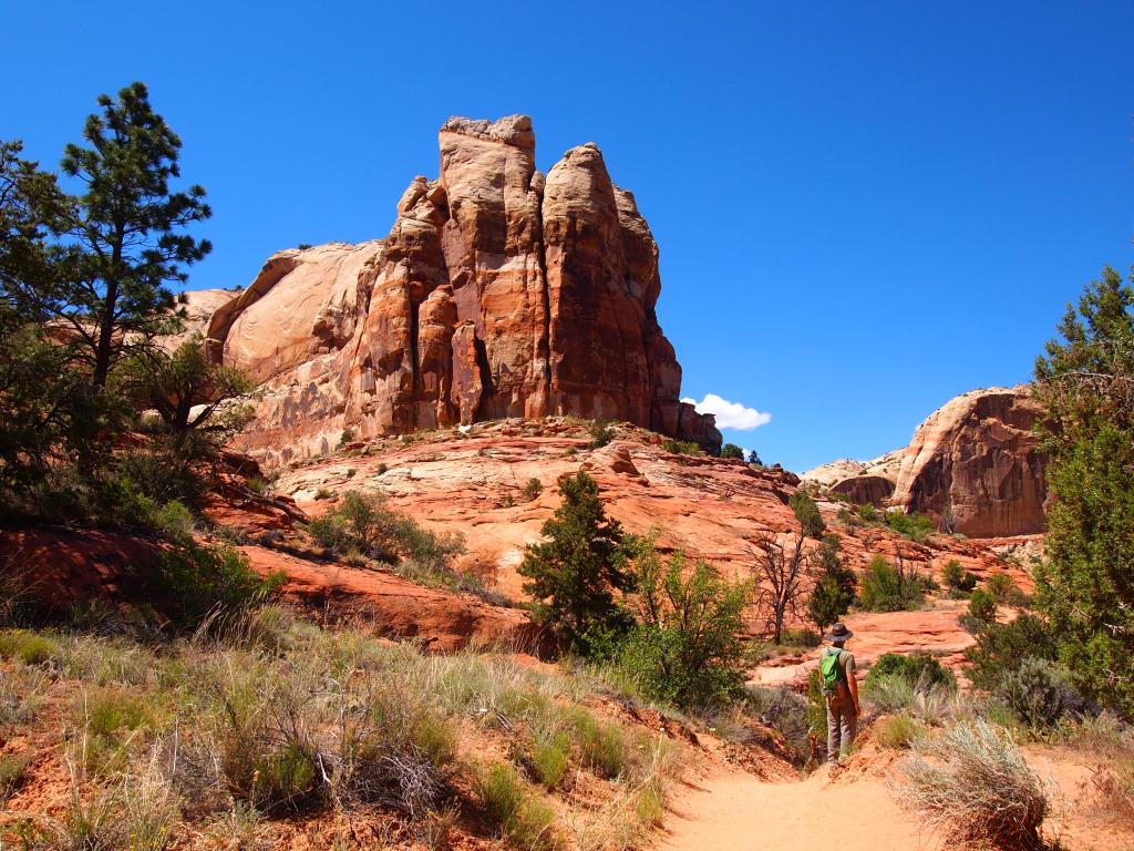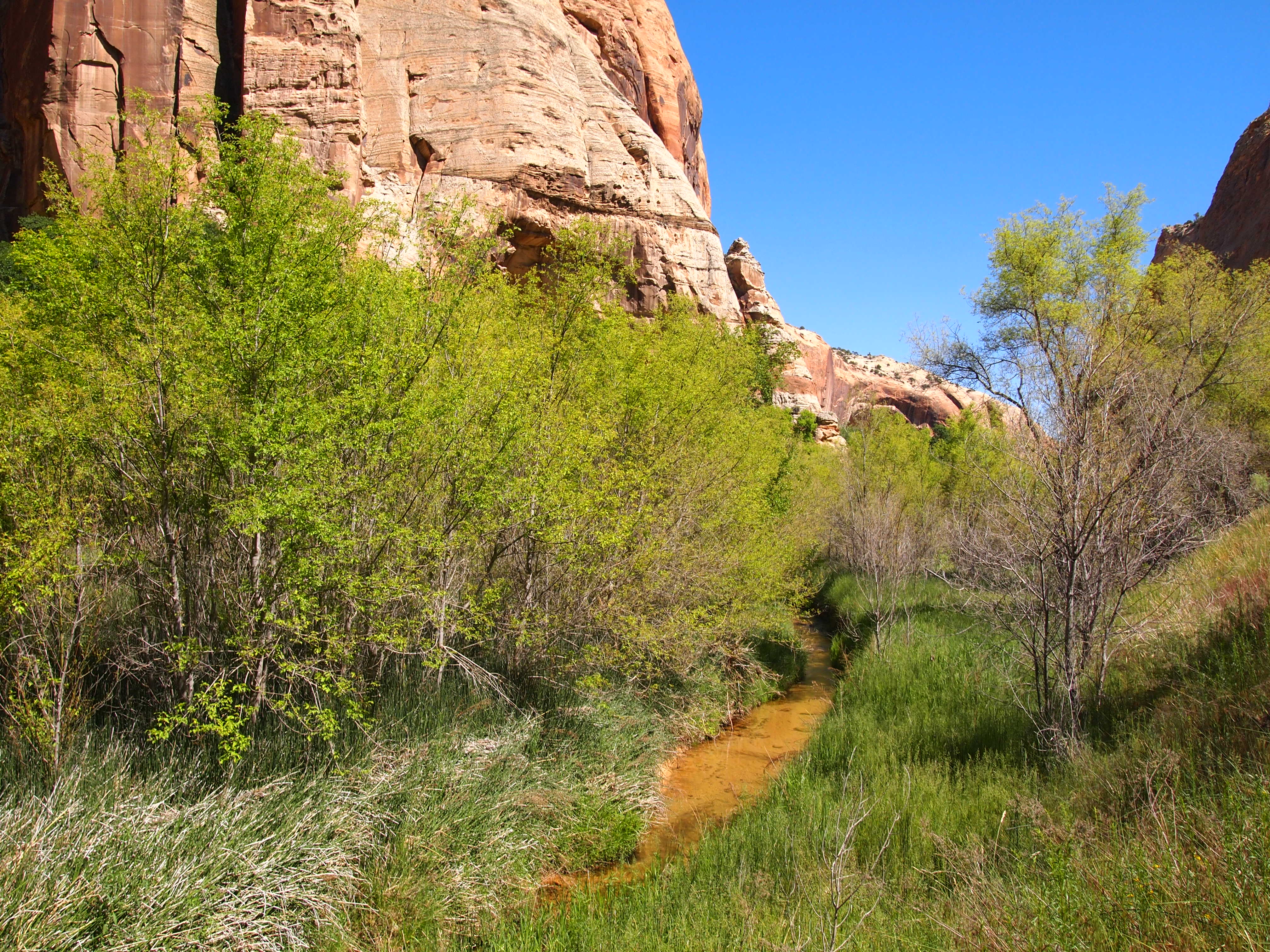 Lower Calf Creek Falls showcases a different side of GSENM. Here you see the life-giving force of water as the trail skirts the lush canyon floor along Calf Creek. Although the trail doesn’t directly follow the creek, its presence is evident. The vibrant green of the plant life around the creek was beautiful especially against the varying red hues of the canyon walls. Combine that with a bluebird sky and it was hard to take a bad photo. With that said, much of the trail is exposed; you aren’t trading a day in the sun for a day in the shade. Thankfully, we had a couple things going for us. We began our hike around 2pm – during the peak of the sun’s heat, yes – but since we were heading northwest, the sun was mostly at our backs as we hiked to the waterfall. As we hiked back out, the sun’s glare had shifted and was kept mostly behind the canyon walls giving us fairly shaded 3 mile journey back.