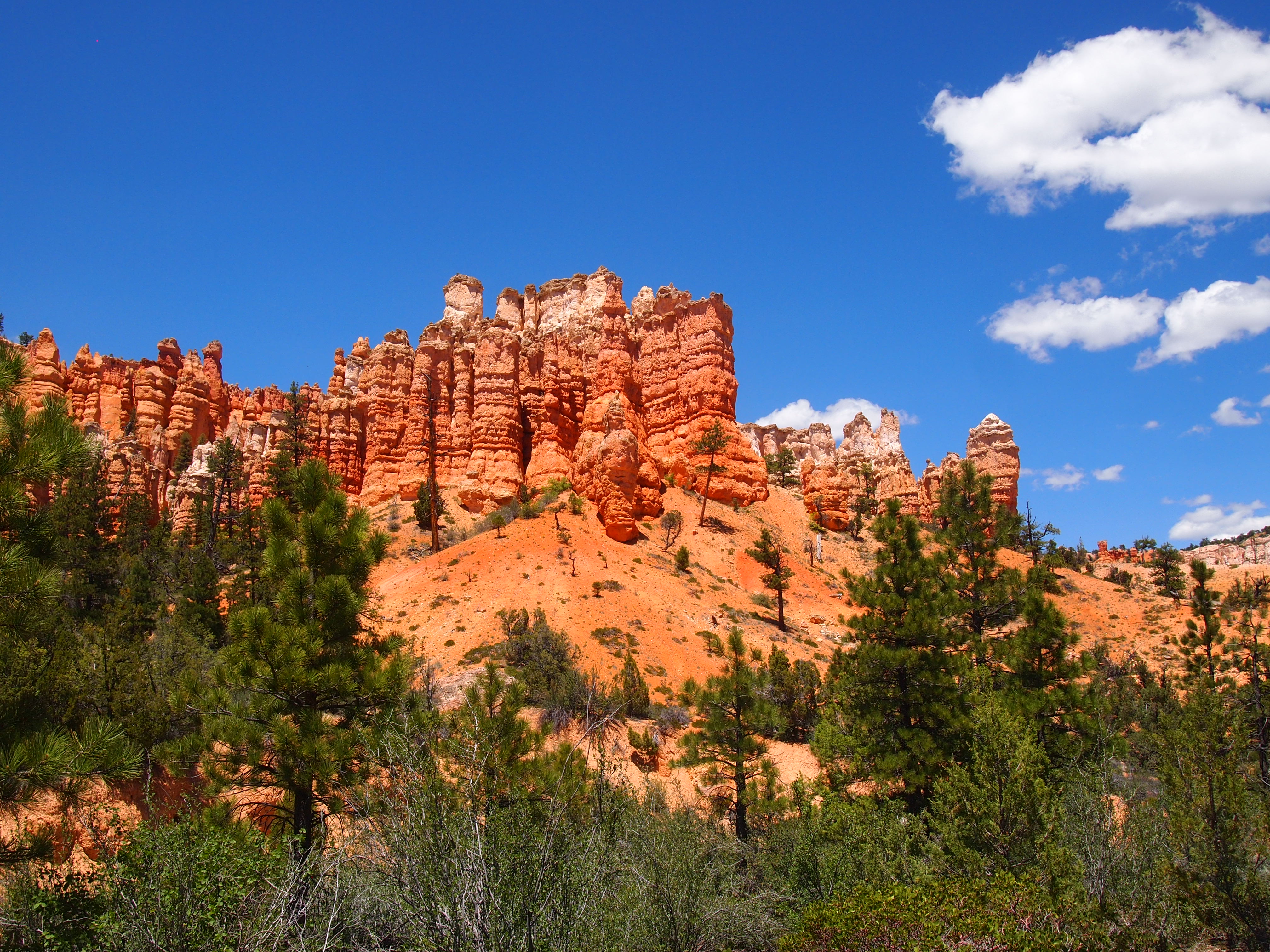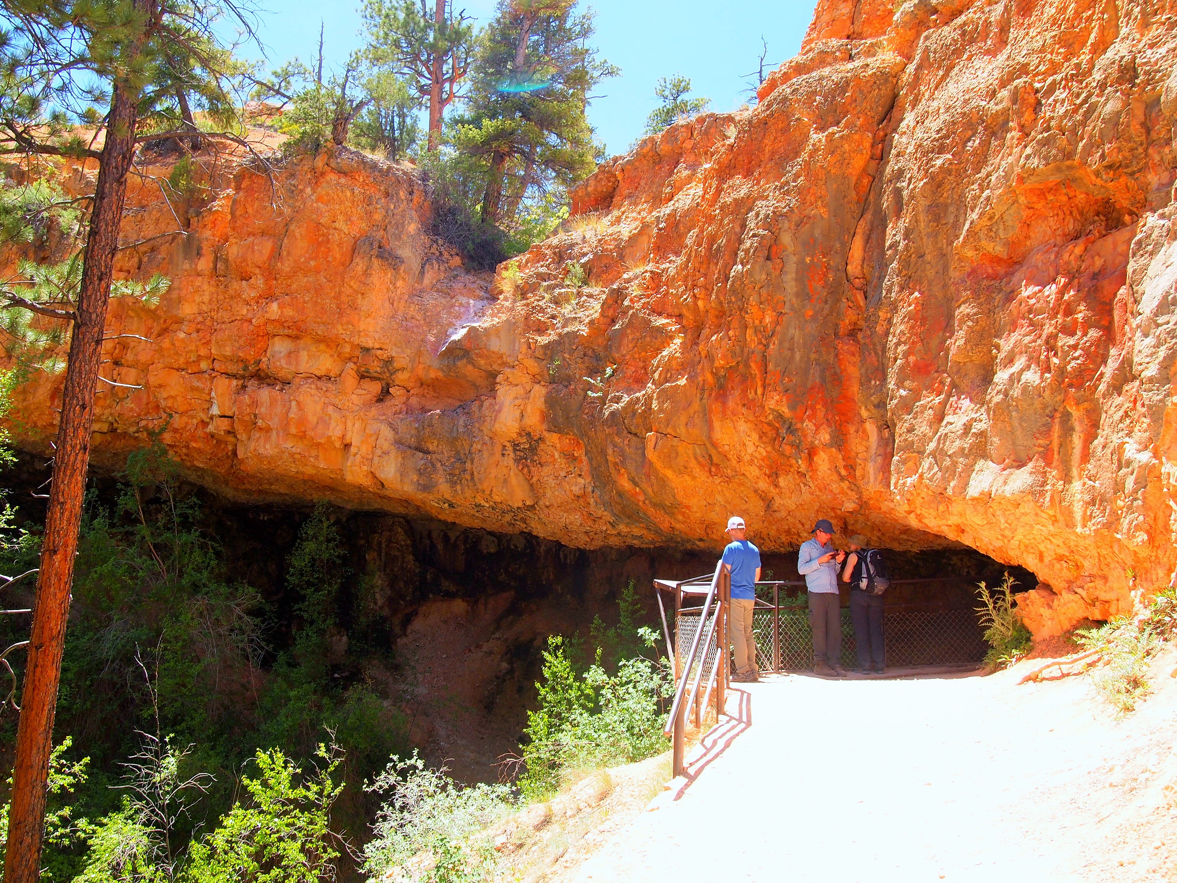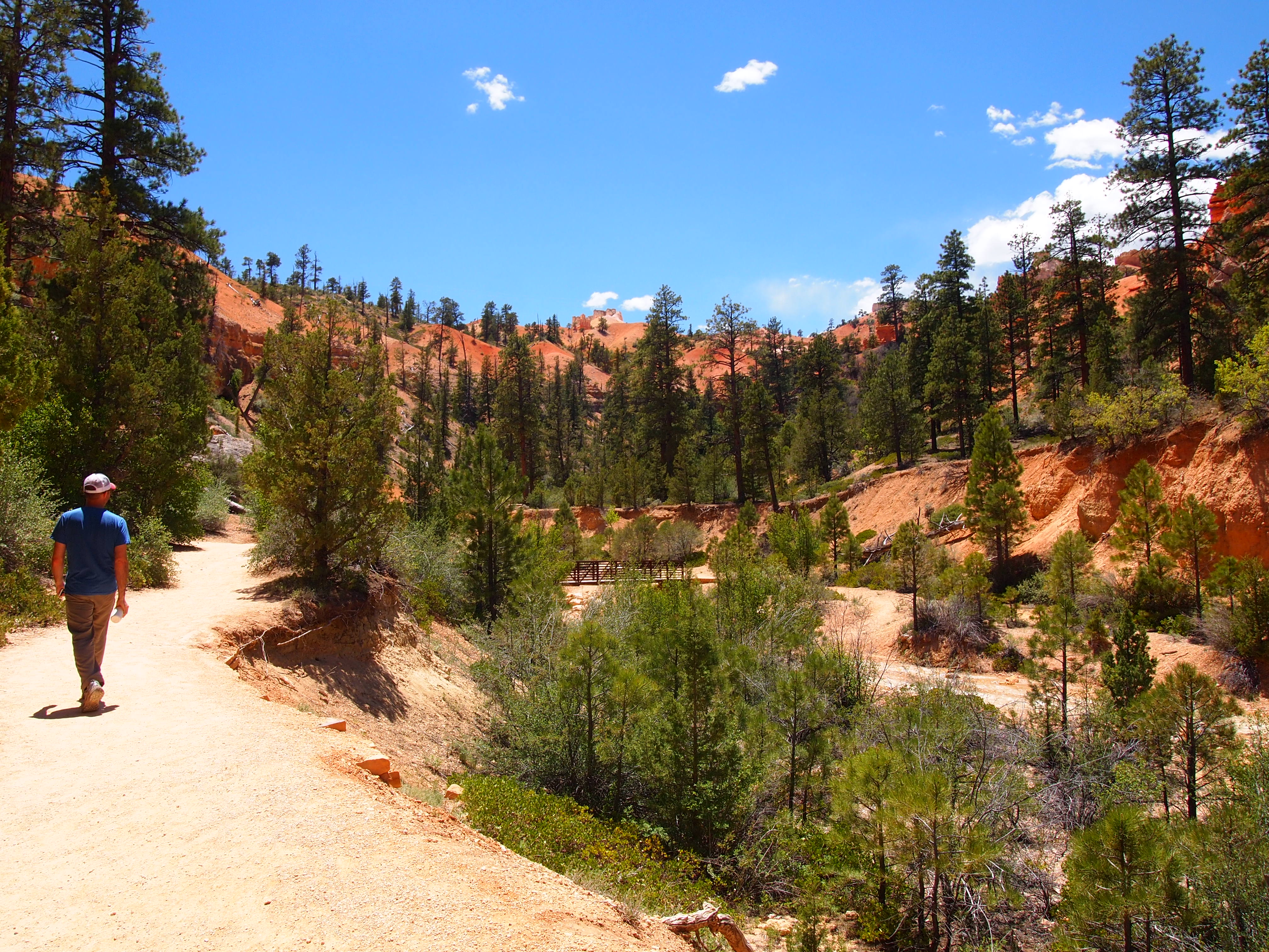 I knew that Scenic Byway 12 would pass by Bryce Canyon National Park. From the map I had, I thought we would drive just above it, never entering the park, simply grazing the boundary. What a delightful surprise when we drove by the sign welcoming us to Bryce Canyon NP! I was thrilled! As we drove by colorful hoodoos lining the road side, I told Zach to pull over at the next turnout; I wanted a decent photo. All of a sudden we drove by a turnout filled with cars and people. That was it, we missed it! We pulled over to circle back and upon reaching the parking lot discovered that it wasn’t a turnout. It was a trailhead for a short 0.4 mile (0.8 RT) hike called Mossy Cave. WHAT! We had time for that! How could we not! So, we parked, lathered on some more sunscreen, and set off.