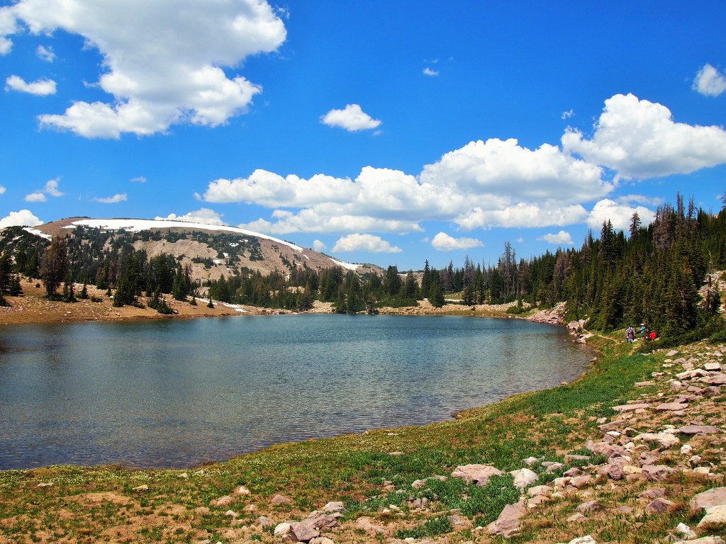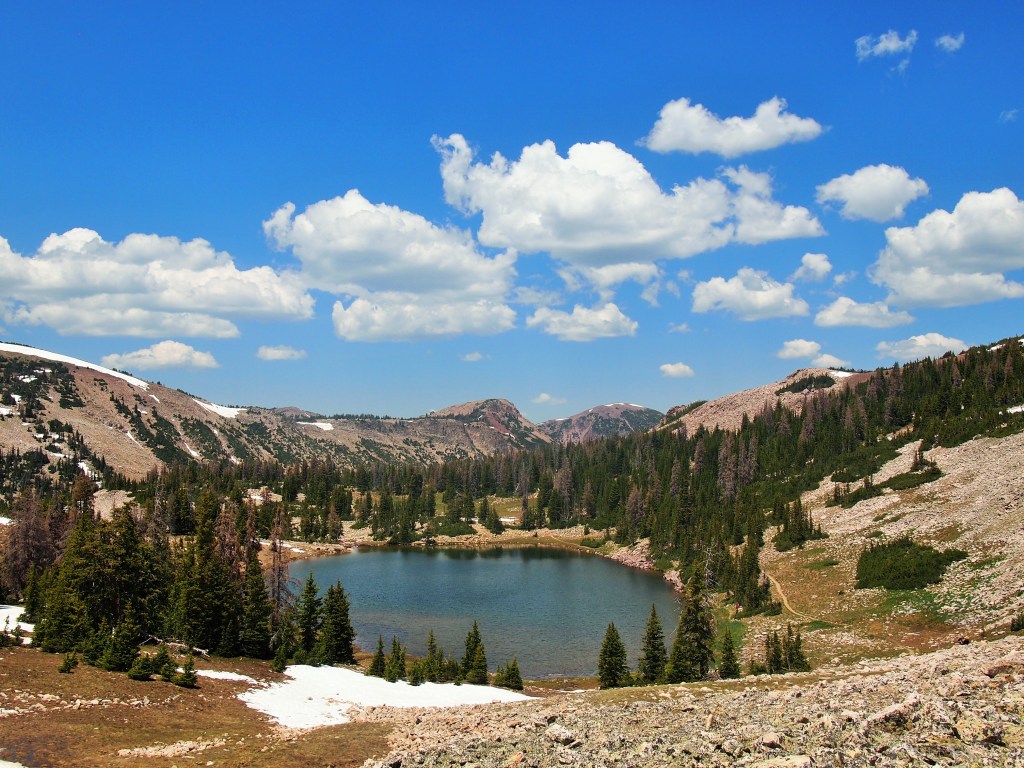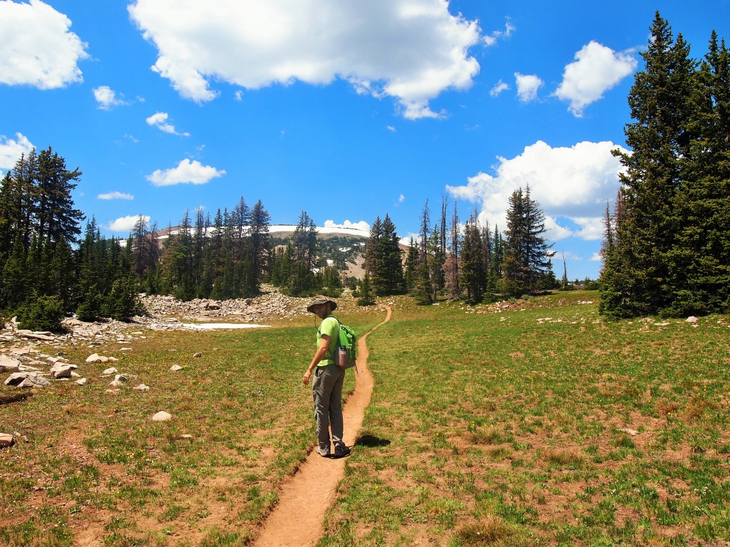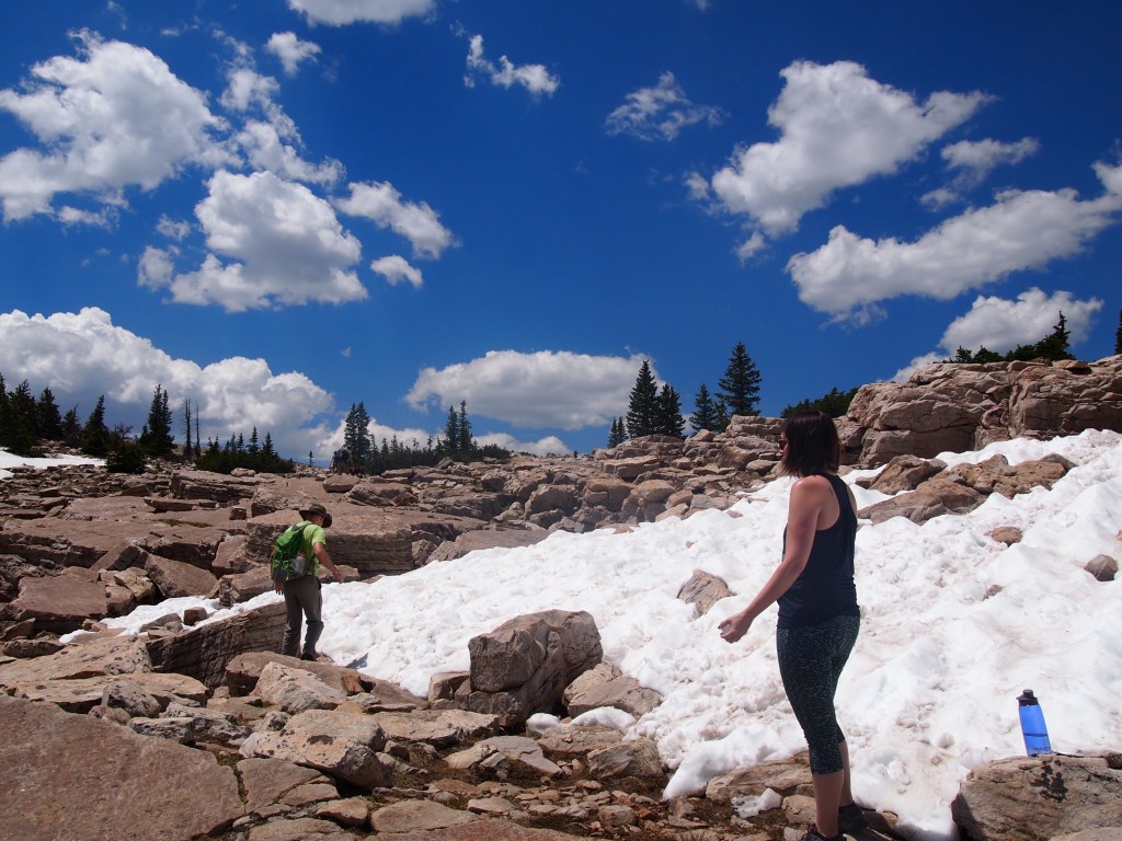 We didn’t get an early start and stopped at the Whole Foods in Kimball Junction to grab some snacks on the way so we didn’t start until close to 12:30pm. But it didn’t really matter. A 100 degree day in the Salt Lake Valley meant a cool 65 degrees at the trailhead. From the Pass Lake Trailhead, hikers can choose to go clockwise toward Kamas Lake or counter-clockwise toward Scout Lake. We went counter-clockwise and in hind sight I think this was the right decision. The bulk of the climbing is in the first 1.5 miles as the trail passes Picturesque Lake, Scout Lake, and then ascends to the saddle between Scout and Lofty Peaks. There was still a decent amount of snow on top of the saddle and we lost the trail for a bit before finding it again though it wasn’t necessary to use it. On the other side of the saddle we could easily see the trail following the edge of Lofty Lake below.