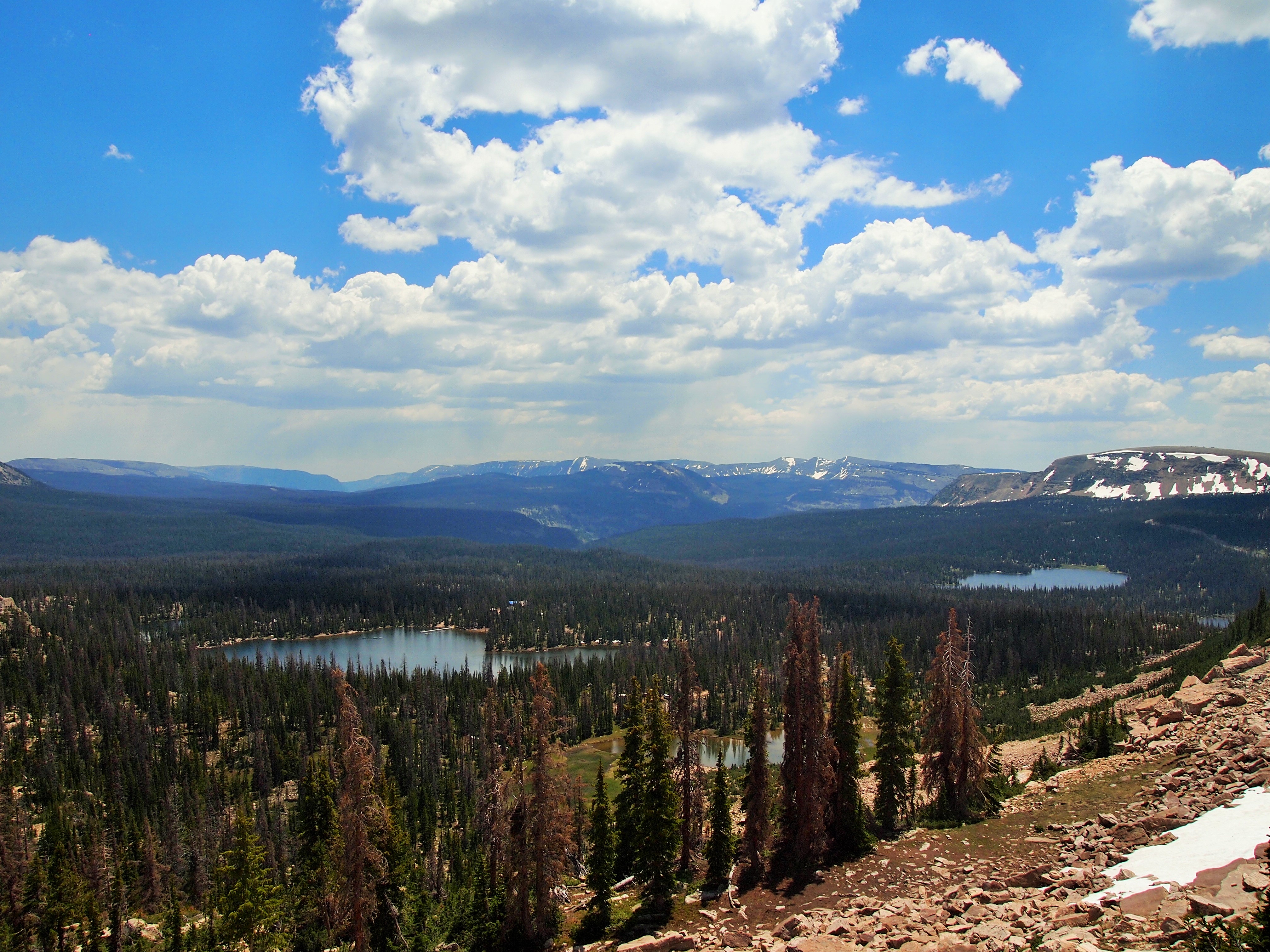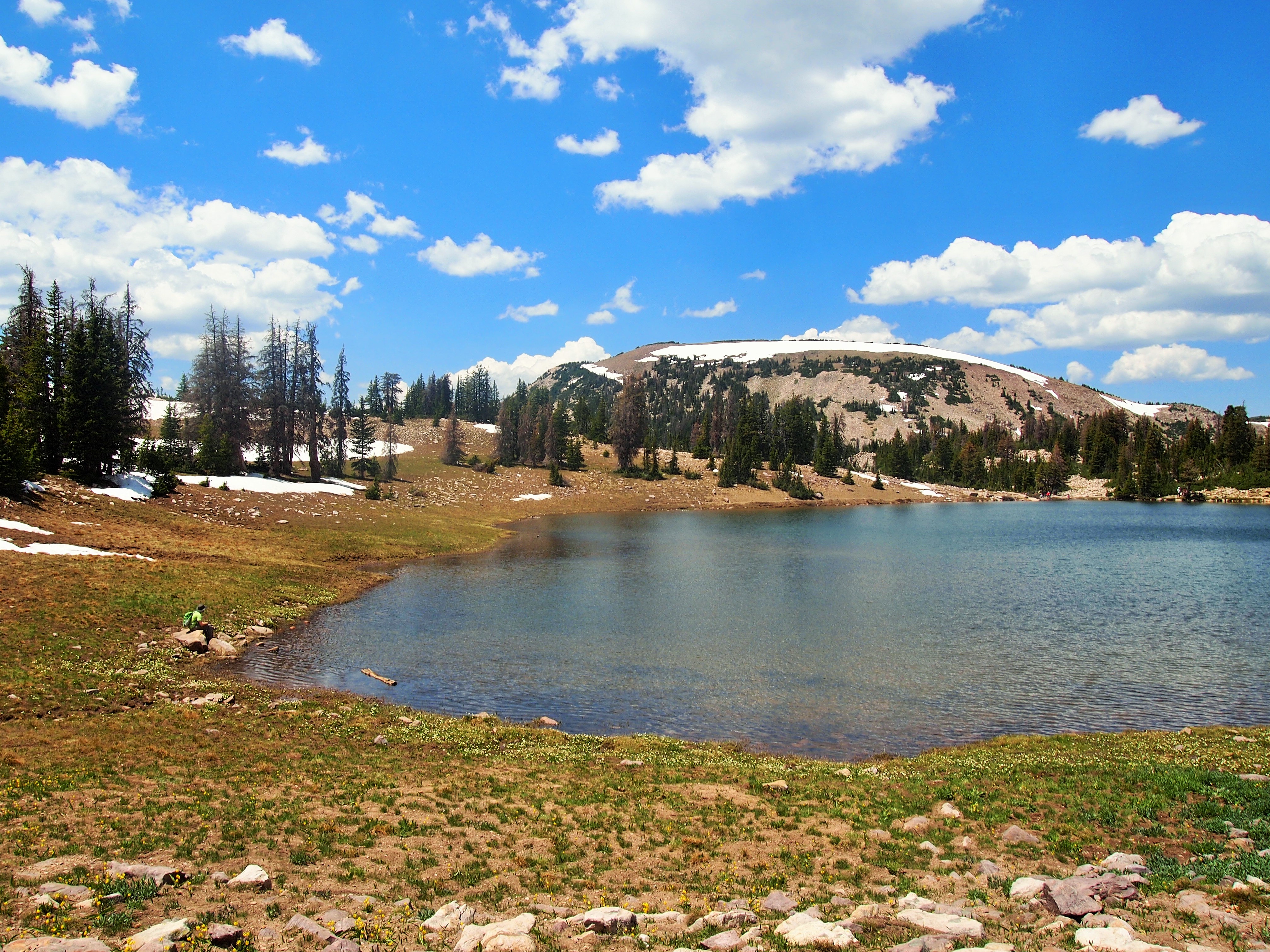 We didn’t get an early start and stopped at the Whole Foods in Kimball Junction to grab some snacks on the way so we didn’t start until close to 12:30pm. But it didn’t really matter. A 100 degree day in the Salt Lake Valley meant a cool 65 degrees at the trailhead. From the Pass Lake Trailhead, hikers can choose to go clockwise toward Kamas Lake or counter-clockwise toward Scout Lake. We went counter-clockwise and in hind sight I think this was the right decision. The bulk of the climbing is in the first 1.5 miles as the trail passes Picturesque Lake, Scout Lake, and then ascends to the saddle between Scout and Lofty Peaks. There was still a decent amount of snow on top of the saddle and we lost the trail for a bit before finding it again though it wasn’t necessary to use it. On the other side of the saddle we could easily see the trail following the edge of Lofty Lake below.