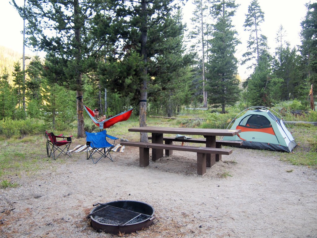 Though we were slightly disappointed, we’d also kind of expected it. So we continued down the road past Stanley, to see what was available along the Salmon River. Just past Lower Stanley, we found a nice spot nestled in tall pines at the Salmon River Campground. The campground is split by the highway and we preferred the open site on the side away from the river. Not as scenic, but better shaded with a nice spot for our hammock. We set up and hung out, whiling away the early afternoon, before going for a drive along the Hwy. 93, another section of the same scenic highway we drove last year from Challis to Salmon.