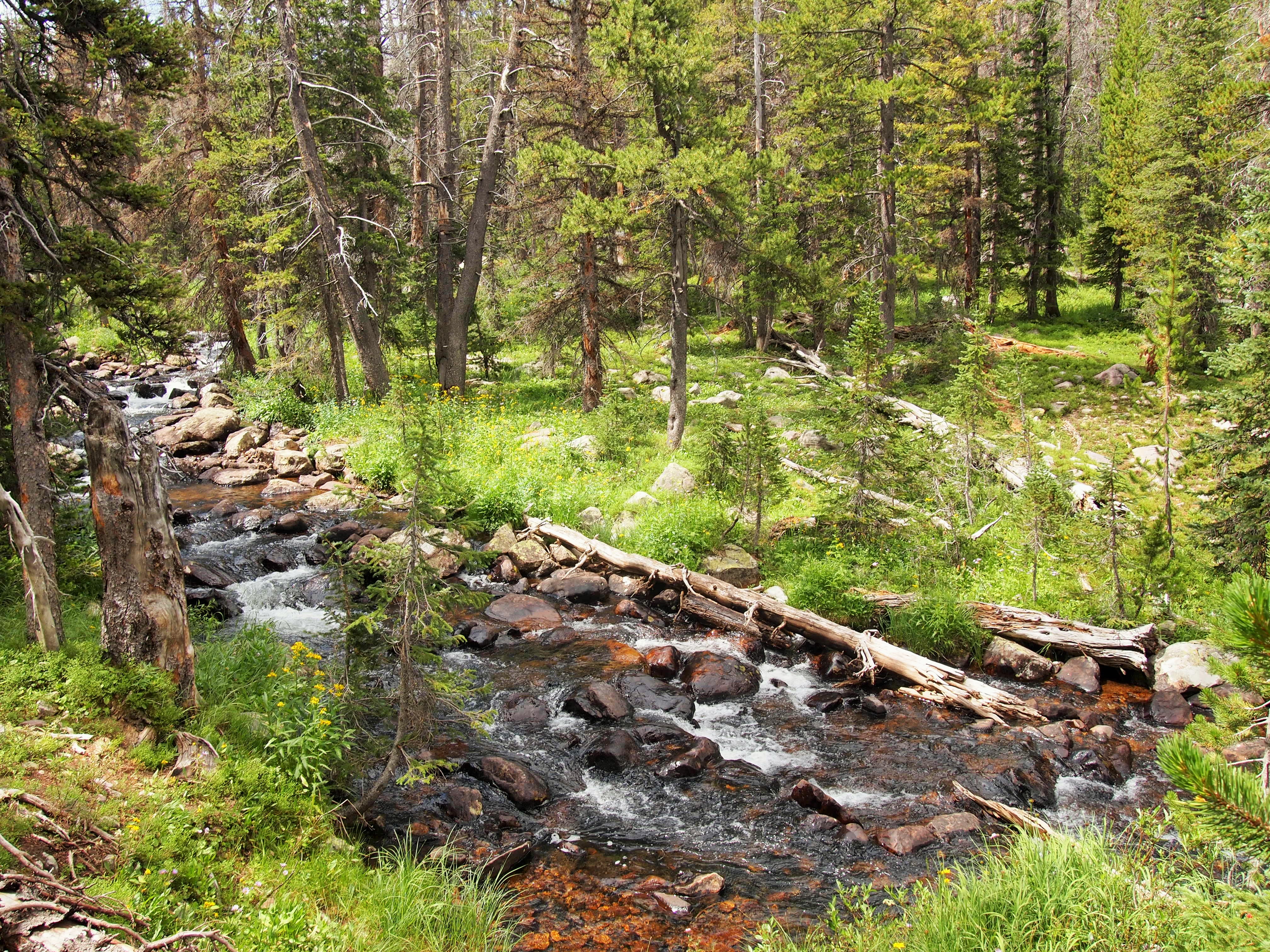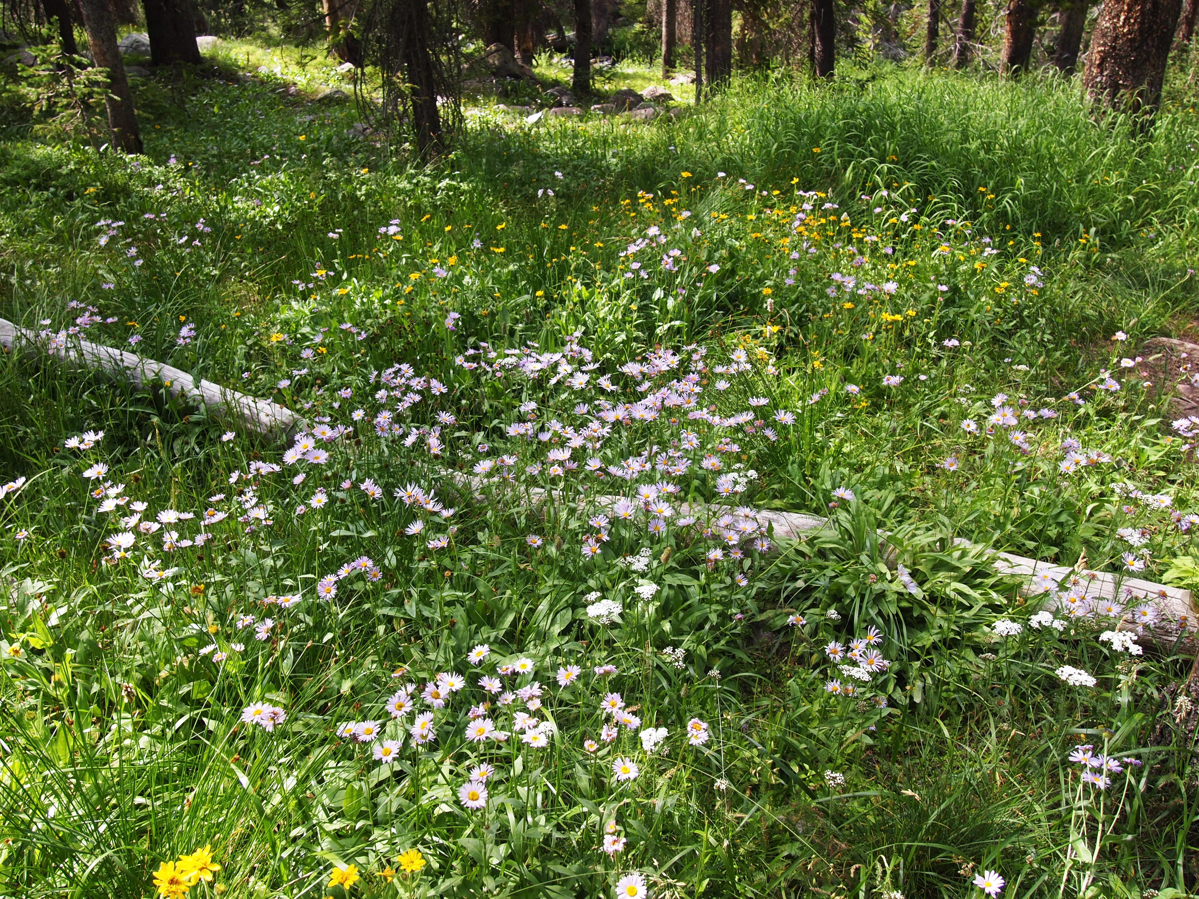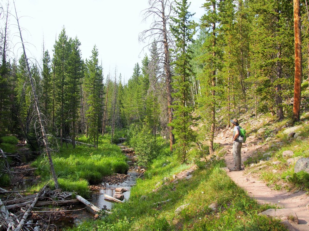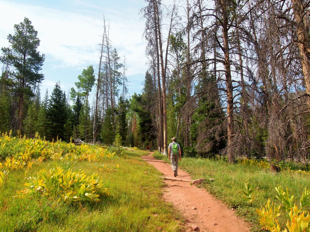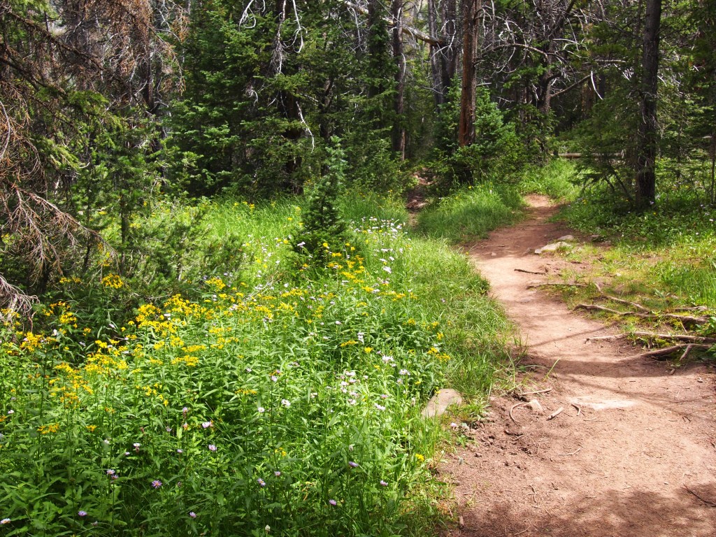 The beginning of the trail is beautifully pleasant. A little on the wet side, there are several boardwalks to help navigate some of the muddier areas, though there were several areas we had to negotiate in or around the mud ourselves. There are also multiple water crossings, some small, others more trying. After my stint at Sawtooth Lake, I was happy to come away from this hike without wet socks.