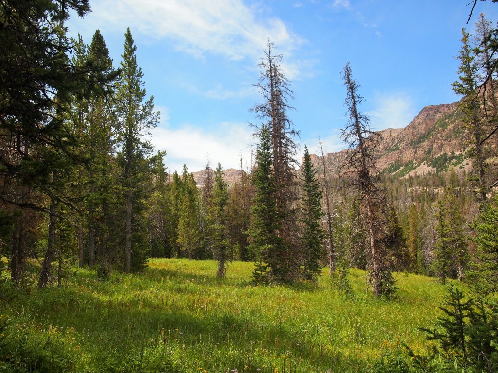 After what felt like ages – but was only 5 miles – we entered a gorgeous, open meadow. We could finally see our destination at the back of the basin and only had one mile to go. If we were backpacking we would have found a place along this portion of the trail. There was a beautiful stream flowing down from the lake that wound its way through the meadows below which would make for a peaceful campsite.
