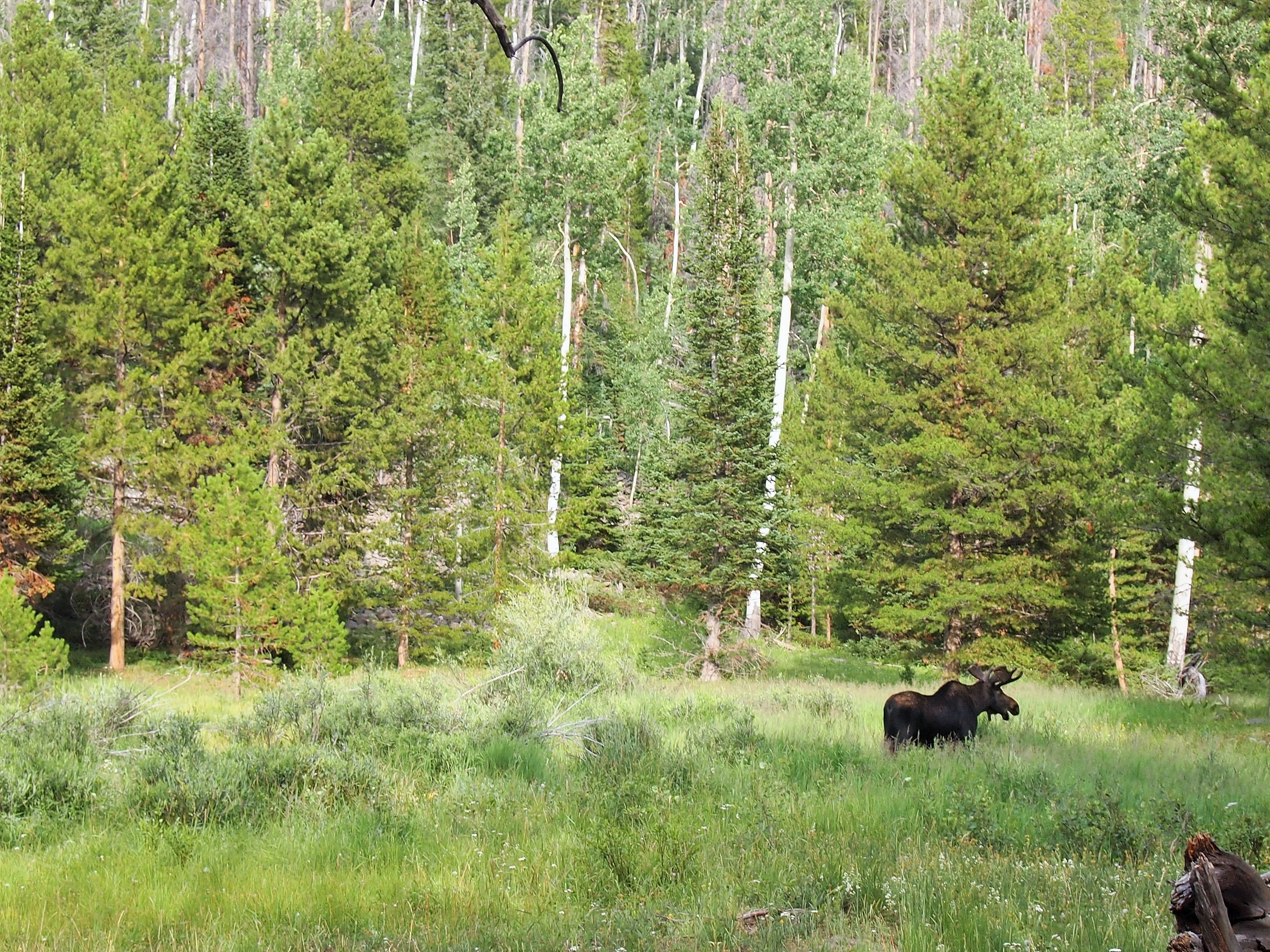 Unfortunately, we had to hike back down. We passed a couple groups of backpackers heading up for the night – I was not envious of their loads. The hike down was much more pleasant until we hit the final 3 miles or so. There we had to go down that steep stretch of rocky terrain, and then continue on and on for what felt like ages. Near the end, we came across a large bull moose munching in an open meadow. It was the closest we’d ever been to one. He was only 20 yards from us. We were cautious, pausing to make sure he wasn’t going to charge, and then crossed by his meadow. I waited until we were at a safer distance to snap his photo. Shortly after that we were finally done. With sore legs and hungry bellies, we climbed into our car to start the trip back to Mirror Lake Hwy. but were detained by a herd of sheep! Not exactly what I expected to encounter. They let us slowly drive past and then we were truly on our way back home.