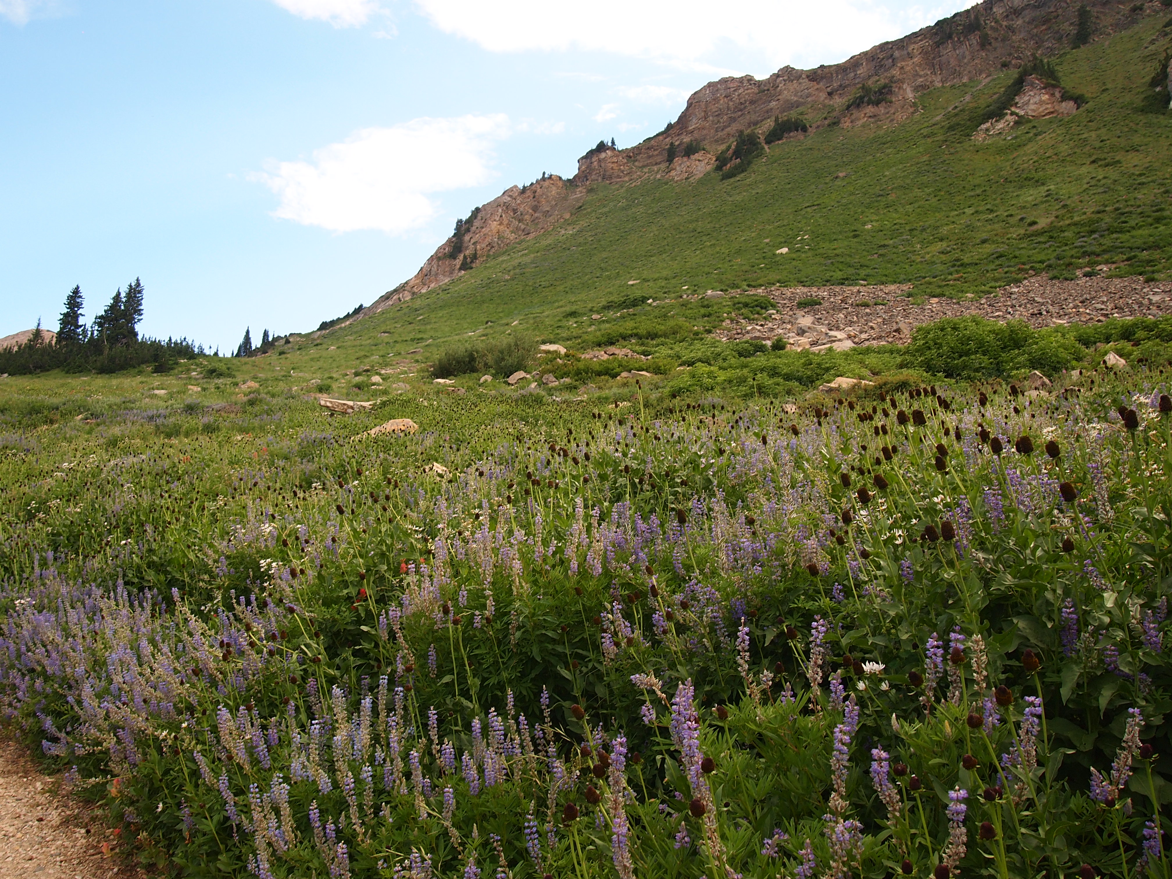 For our farewell-to-summer hike the weekend before school started, we decided to go back to Little Cottonwood Canyon. I thought we could hike through Upper Albion Meadows again, but instead of going to Cecret Lake, go up to Germania Pass. The wildflowers were almost entirely gone from the meadows; it was a completely different hike. But as we turned onto the Germania Pass trail and began ascending the switchbacks, the same wildflowers that had dominated the meadows below were in full bloom on the mountainside! We continued up the road until we came to a rock outcropping where we decided to check out the view of Cecret Lake and have a snack. In the end, we didn’t care enough to go the short distance to Germania Pass and ended up going back down. We passed through a boulder field (as we had on the ascent), but this time spotted at least 10 badgers sunning themselves! Where’s our badger dog when we need him!? It was a really lovely hike, a great send-off to summer, and culminated in burgers and beers at The Cotton Bottom Inn – what more could you want?