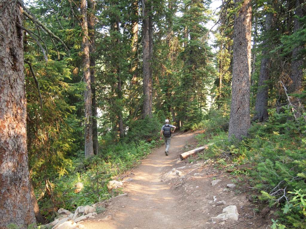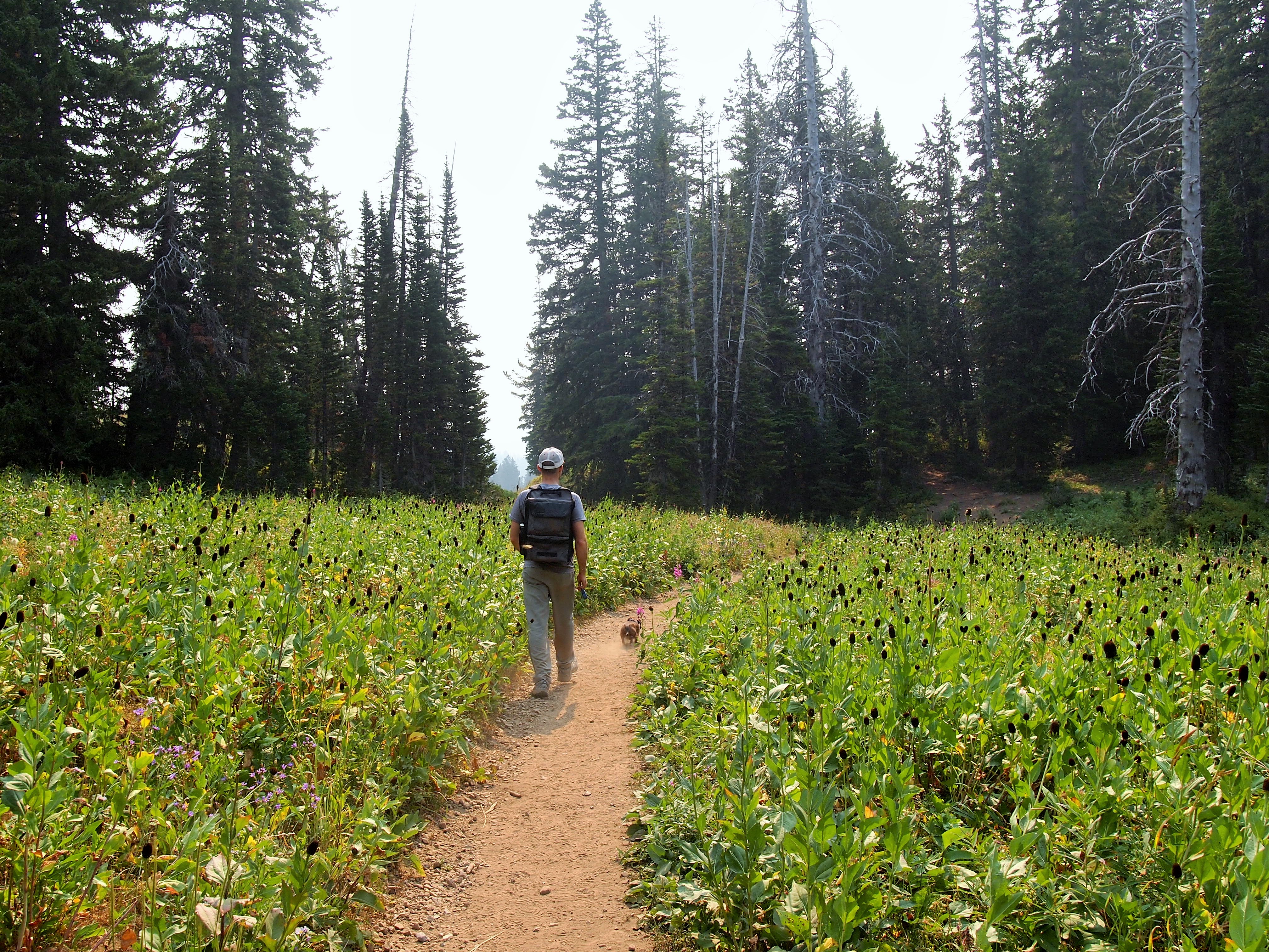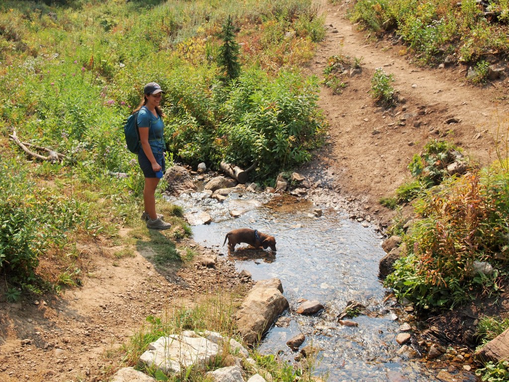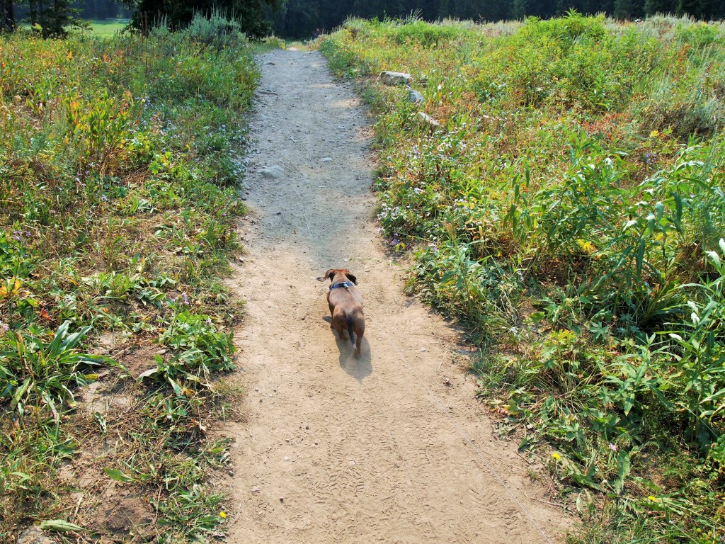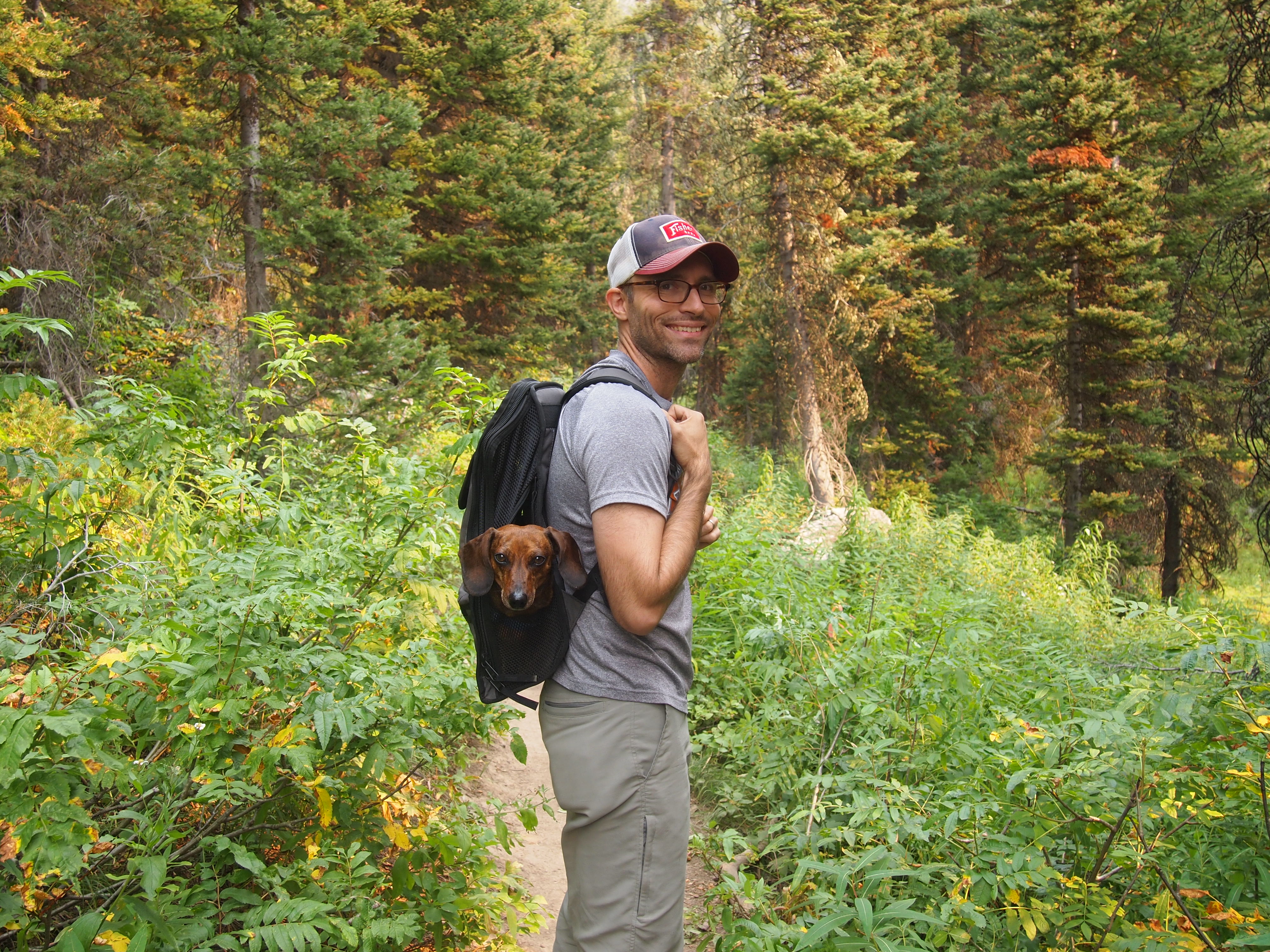 We let Truman out at the lake, and he scampered around for a while lapping up some lake water and following the scent of a darting squirrel. He was thrilled to be out of his pack. We let him do the first mile downhill before the descent became too steep. He was moving so quickly I could barely keep up! As usual, Truman had several admirers along the way, both in and out of the pack. He is definitely a strange sight on most trails!