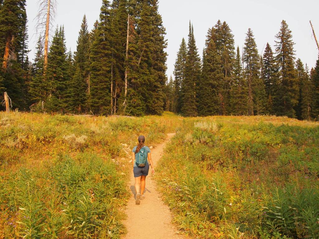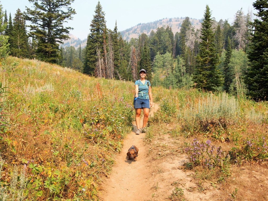 On Labor Day, we woke early to pack up our site and hit the road. We planned to meet my uncle and cousin in Victor, Idaho, for lunch at noon, but I wanted to squeeze in one more hike on our way. We grabbed breakfast in Jackson at our favorite shop, Pearl Street Bagels, and then headed west toward Victor. A mile south of the Teton Pass, we parked in a gravel lot to access the trailhead for Ski Lake, from what I’d read, a favorite hike for Jackson locals and their furry friends.