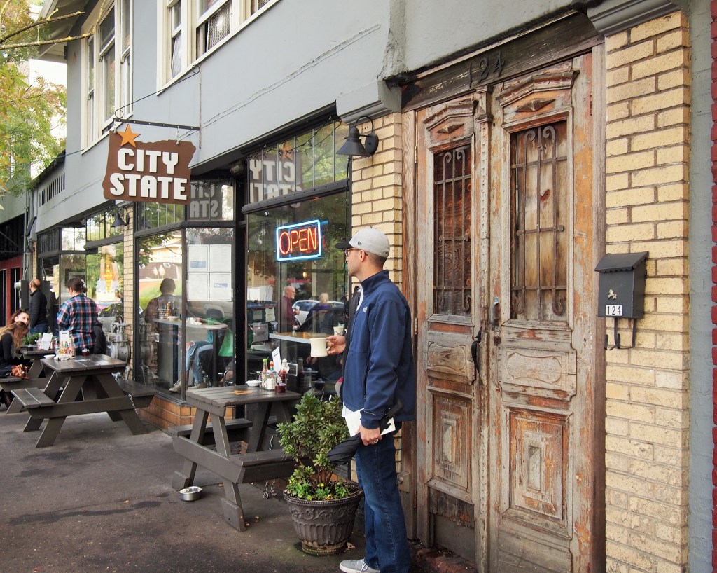 After Bible Club, we did catch an Uber back into town. We rounded out the evening with a visit to the Hawthorne district where we stopped into Powell’s and had beers at Back Stage Bar, a McMenamins institution hidden behind their Bagdad Theater. The Back Stage Bar was pretty impressive. It’s a cavernous seven story space with a 20×20 ft. mural at the front. I wasn’t too crazy about their beer, but the space alone was worth seeing. McMenamins is a local Oregon company which renovates historic buildings and turns them into hotels, bars, brewpubs, etc. and has their hands in a little bit of everything – beer, coffee, wine, spirits. We noticed several McMenamins as we traveled throughout Portland and each seemed to have its own eclectic theme.