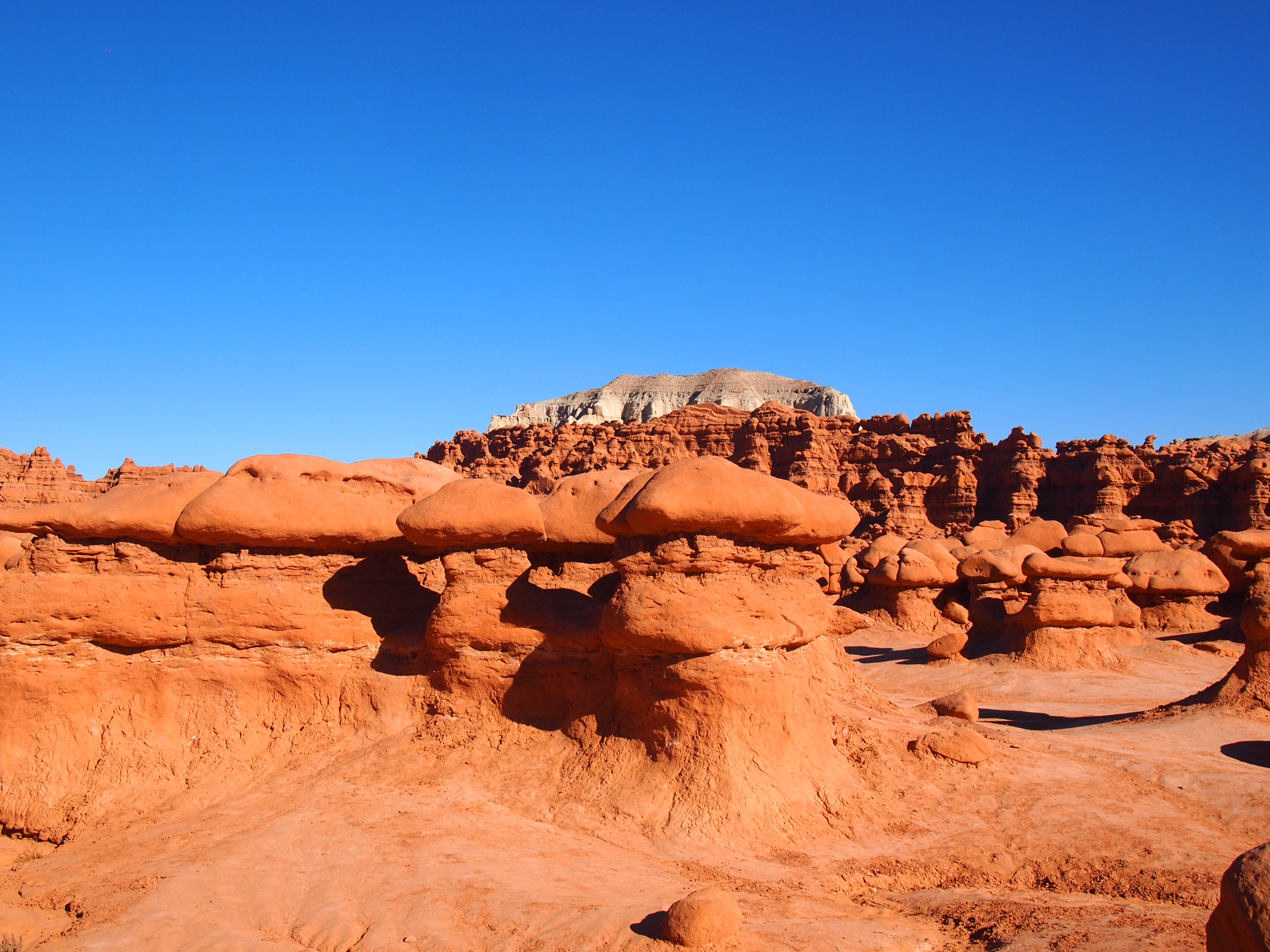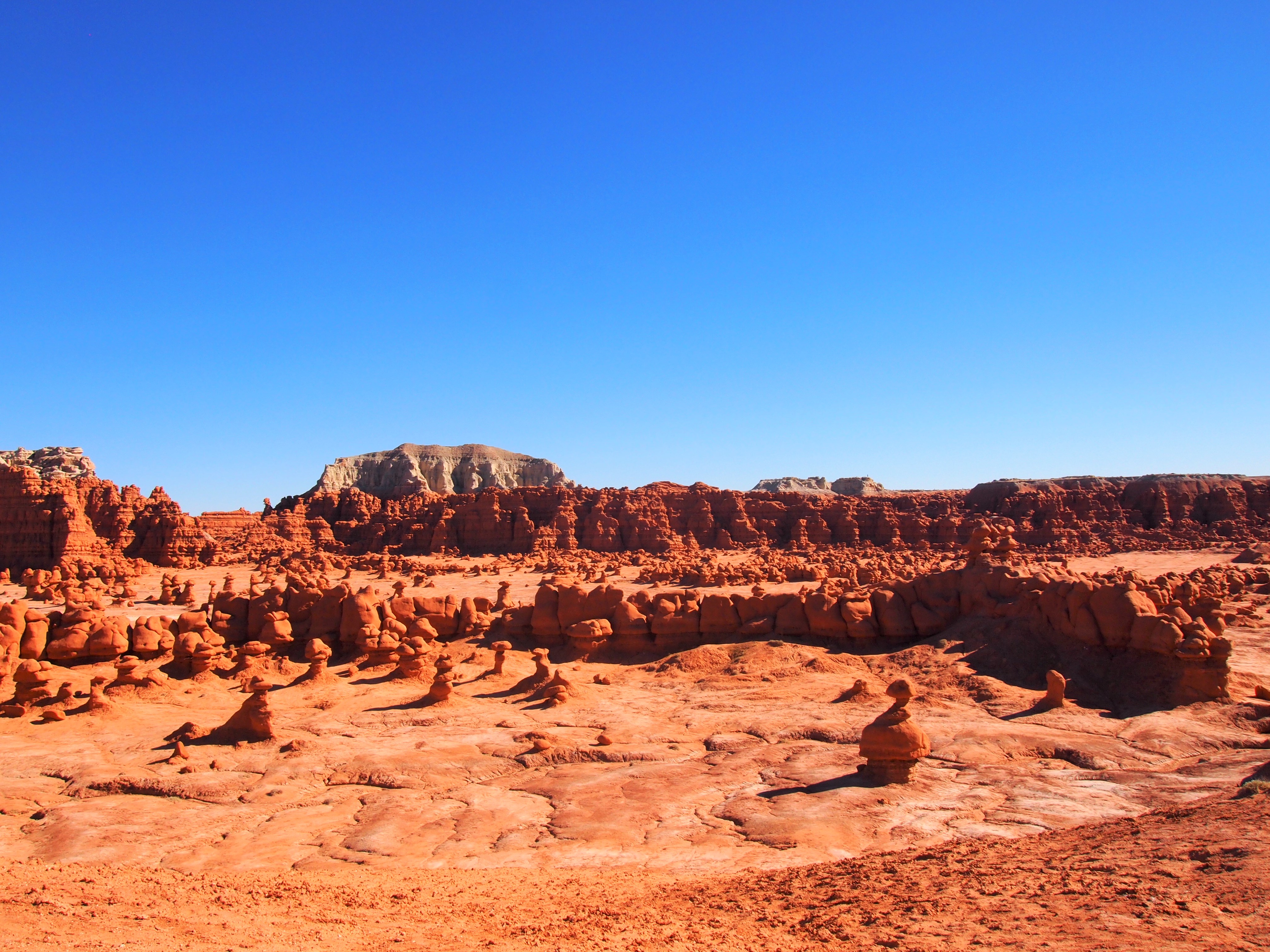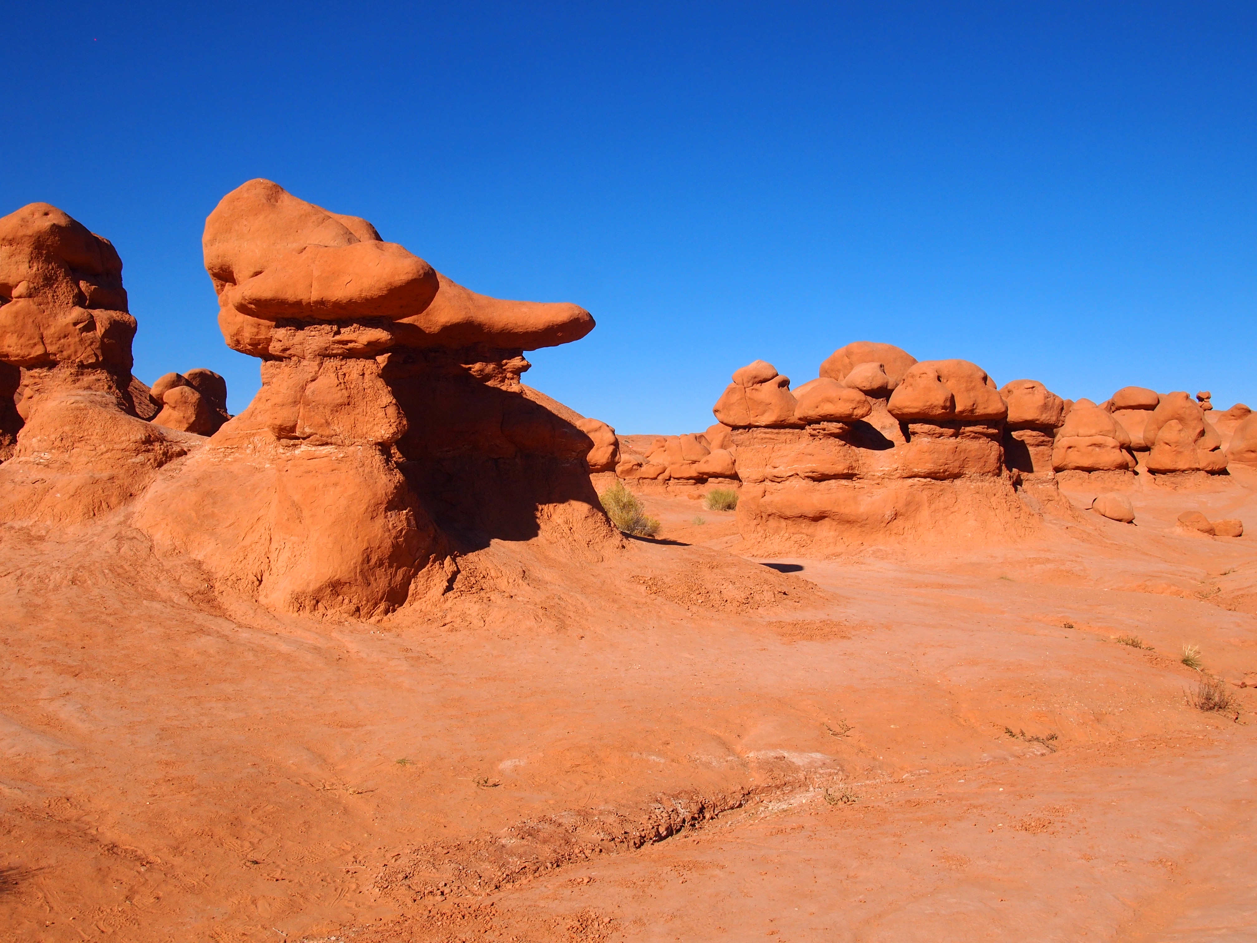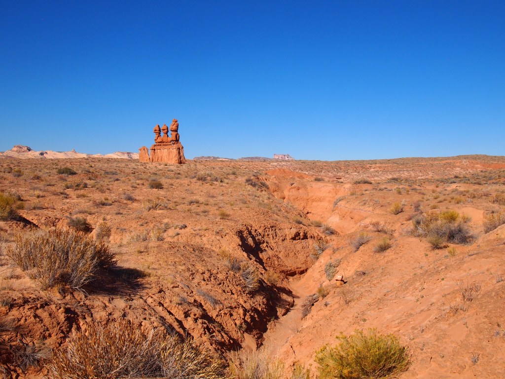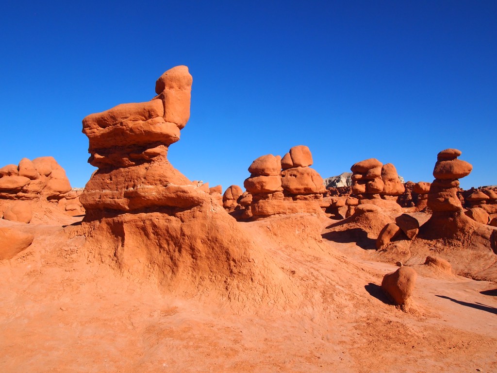 Park information notes that Goblin Valley was first discovered by cowboys searching for lost cattle. However, the area is full of pictographs and petroglyphs from native populations which clearly suggest the valley’s existence wasn’t a complete mystery. The park’s modern history dates back to the late 1920s when Arthur Chaffin discovered the valley, calling it Mushroom Valley. Chaffin returned to the valley in 1949 to photograph the formations and examine the valley more in depth. The valley wasn’t designated as a state park until 1964. Surprisingly, every website I looked at spewed the exact same information about the park’s discovery. I would be interested to find a more substantial accounting of the park and its history. John Fremont’s survey team was nearby, did they not see this valley of goblins? What prompted the change from Mushroom Valley to Goblin Valley?