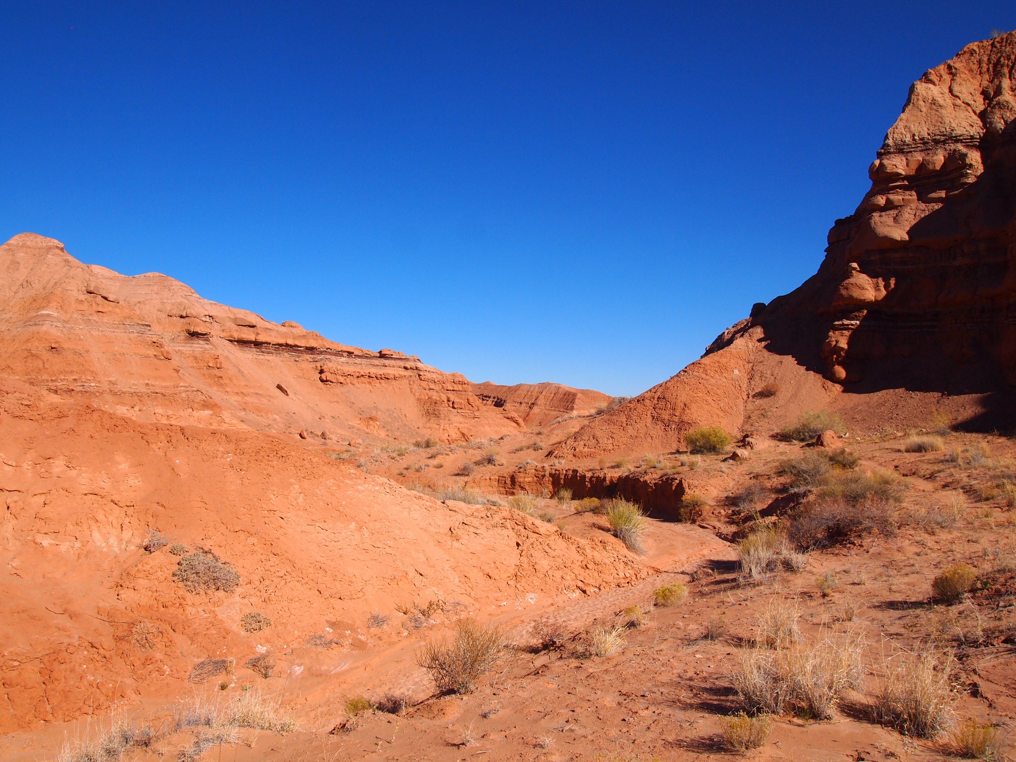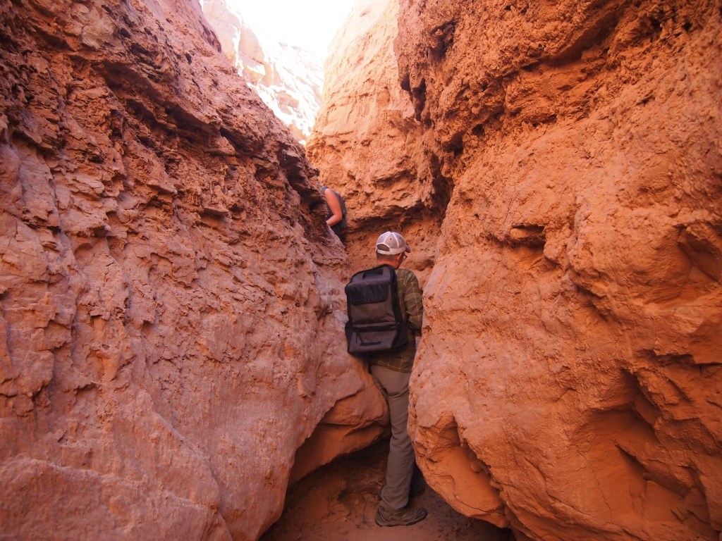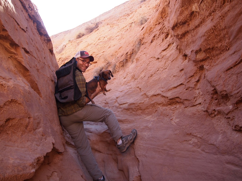 There are three hiking trails in the park and none of the descriptions were very helpful. I had read about them briefly before our trip, but I hadn’t firmly decided on one over the other. Normally it wouldn’t matter that much, but I like to know ahead of time if Truman will be able to do the hike. We ended up doing Carmel Canyon, a short 1.5 mile jaunt starting above the valley floor, descending to a wash below, and finally snaking and scrambling through narrow canyons to the parking area again. It was a great hike for Truman, and he was overly enthusiastic about it, running much of the way. Some of the scrambling at the end was a bit tricky with him though. One of us had to hoist ourselves up over the pour-off while the other passed Truman up. Only the last pour-off was particularly difficult. It was a really fun little hike.