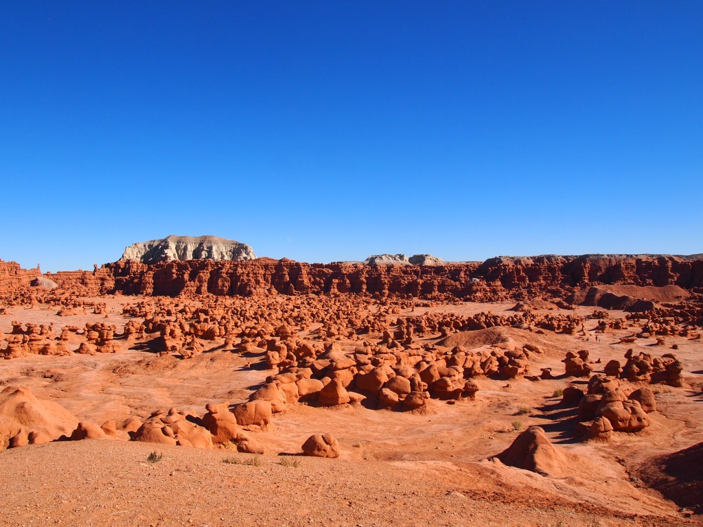 After we staked out our spot at Temple Mountain RA, I wanted to spend the afternoon exploring Goblin Valley State Park. Goblin Valley SP is a relatively small area within the San Rafael Swell but well worth visiting. Its valley of mushroom-shaped hoodoos is truly spectacular and unlike anything else we’ve seen in Utah thus far.