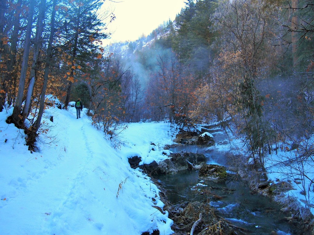 Since we were in a side canyon, the trail remained shaded and cold. My own exhalation caused frost to form on my hair! When we reached the bridge over Sixth Water Creek, we knew we’d reached the final mile. For the remainder of the hike, we followed Fifth Water Creek. Here, still shaded, the trail had been packed down enough that there was an icy layer which wasn’t always discernible at first glance. We had to be more cautious on parts off the trail which skirted drop-offs along with rises/falls in the trail. On the way out I wore my Yaktrax and the difference was incredible. I had absolutely no trouble on the icy portions.