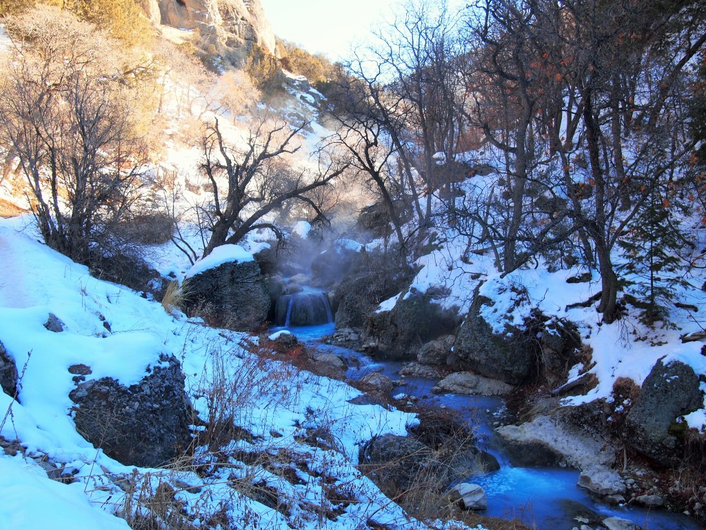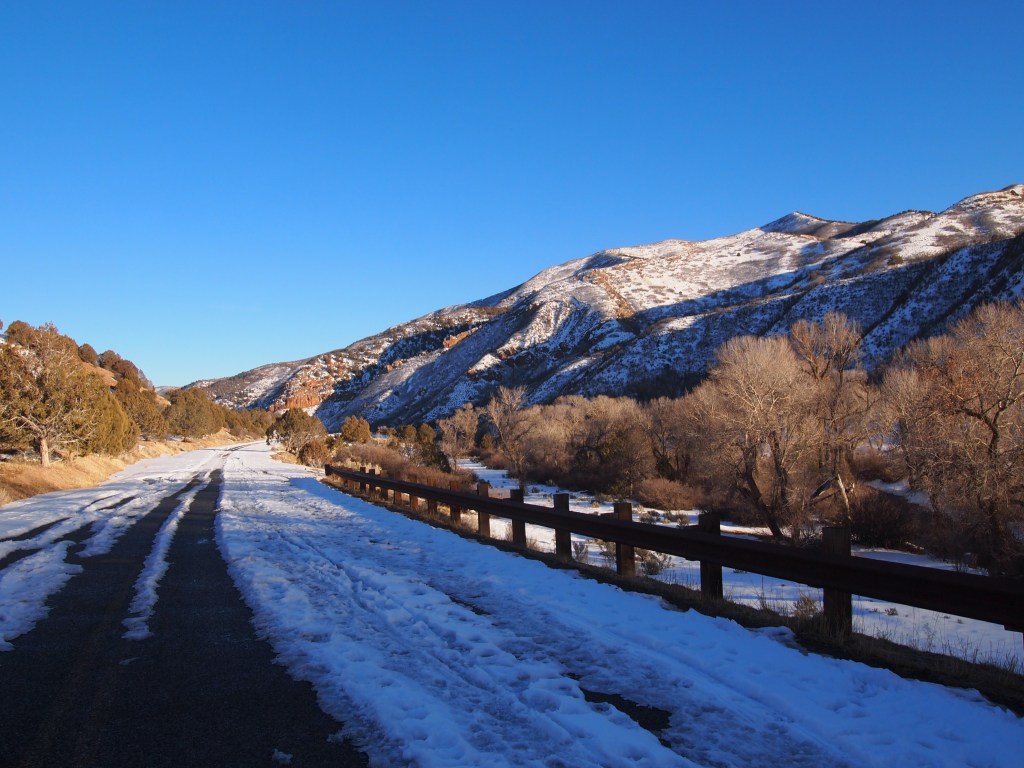 We arrived at the winter gate and began our hike around 9:40am. It was 16 degrees outside, and I was initially concerned because I’d worn my lighter down jacket. At first much of the road was in the shade and it remained very cold. But the portions in the sun quickly warmed us back up. I had been dreading the four extra miles on the road, but it was actually a wonderfully serene walk. The road snaked alongside the Diamond Fork and we were alone for almost the entirety of the walk. I was hoping we could do the first four miles in under two hours. We made it to the trailhead in one!