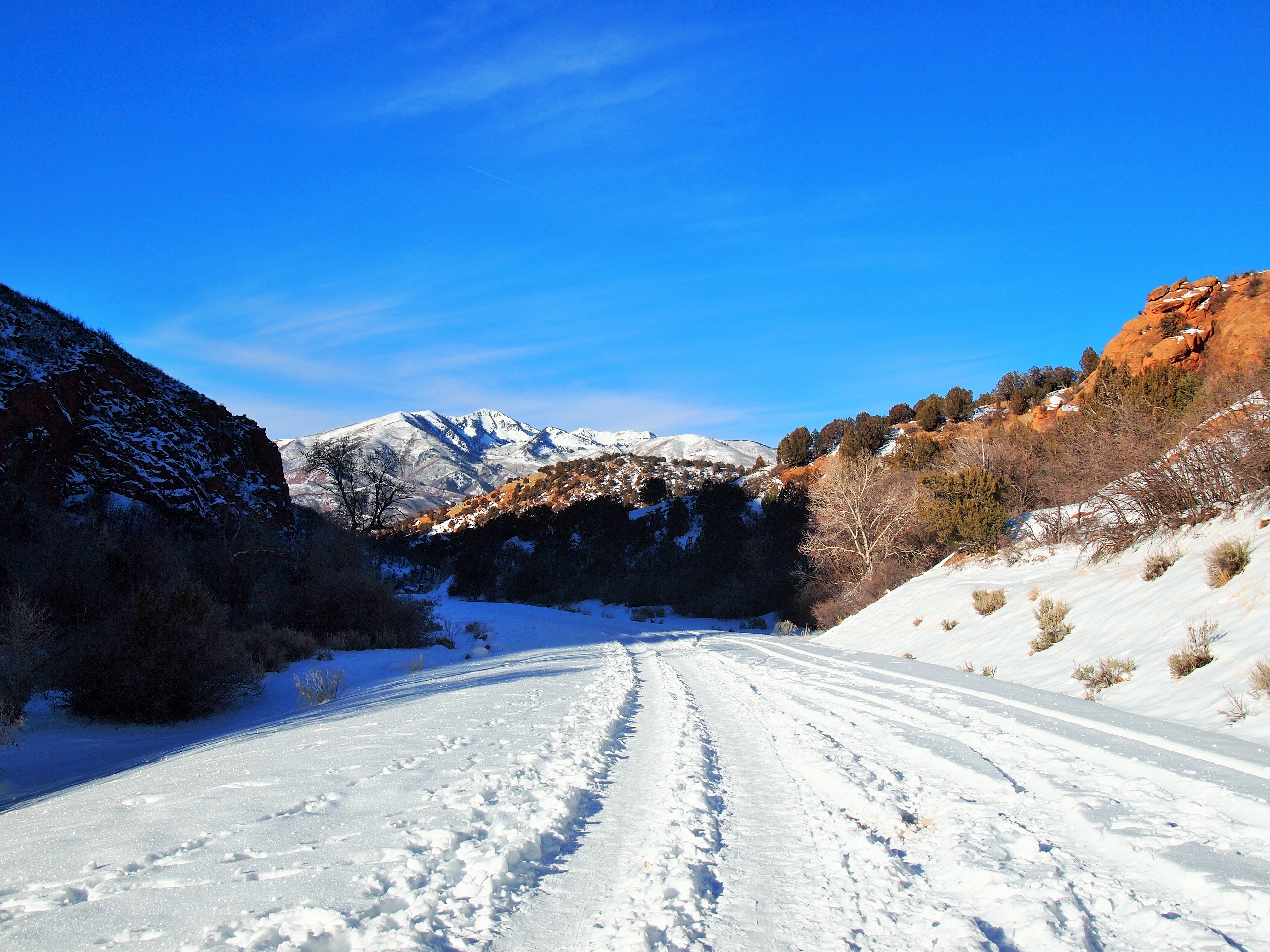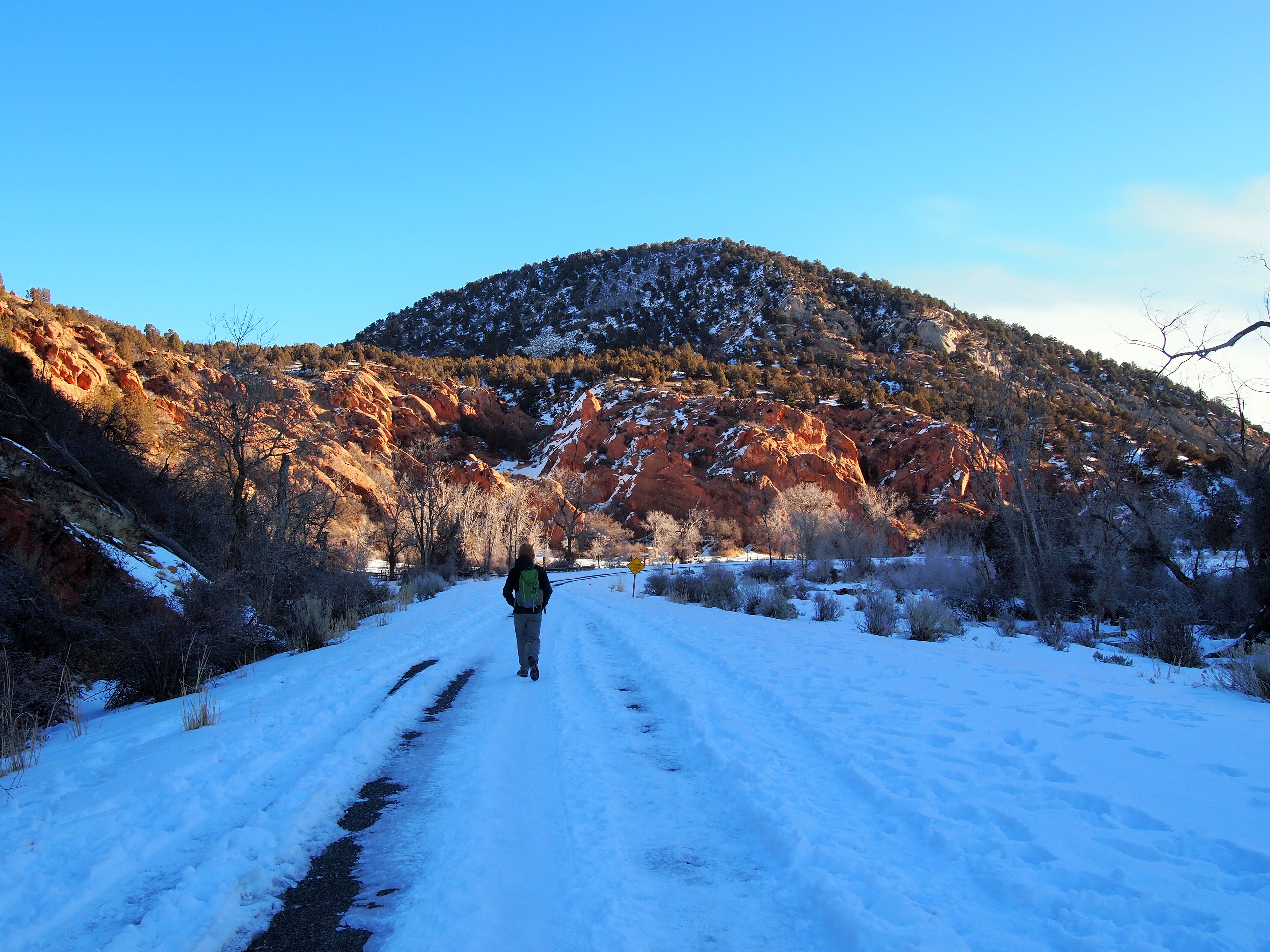 We arrived at the winter gate and began our hike around 9:40am. It was 16 degrees outside, and I was initially concerned because I’d worn my lighter down jacket. At first much of the road was in the shade and it remained very cold. But the portions in the sun quickly warmed us back up. I had been dreading the four extra miles on the road, but it was actually a wonderfully serene walk. The road snaked alongside the Diamond Fork and we were alone for almost the entirety of the walk. I was hoping we could do the first four miles in under two hours. We made it to the trailhead in one!