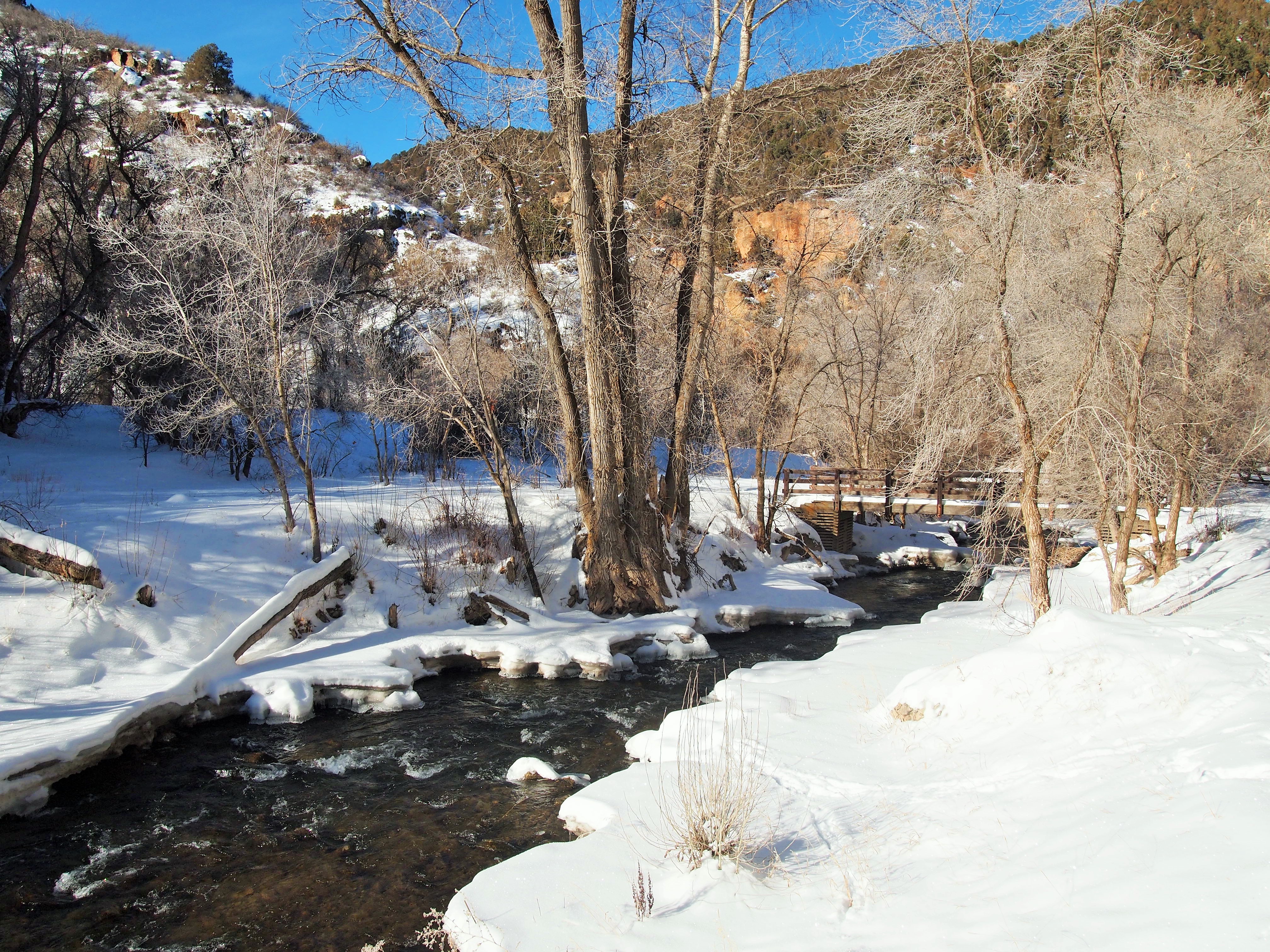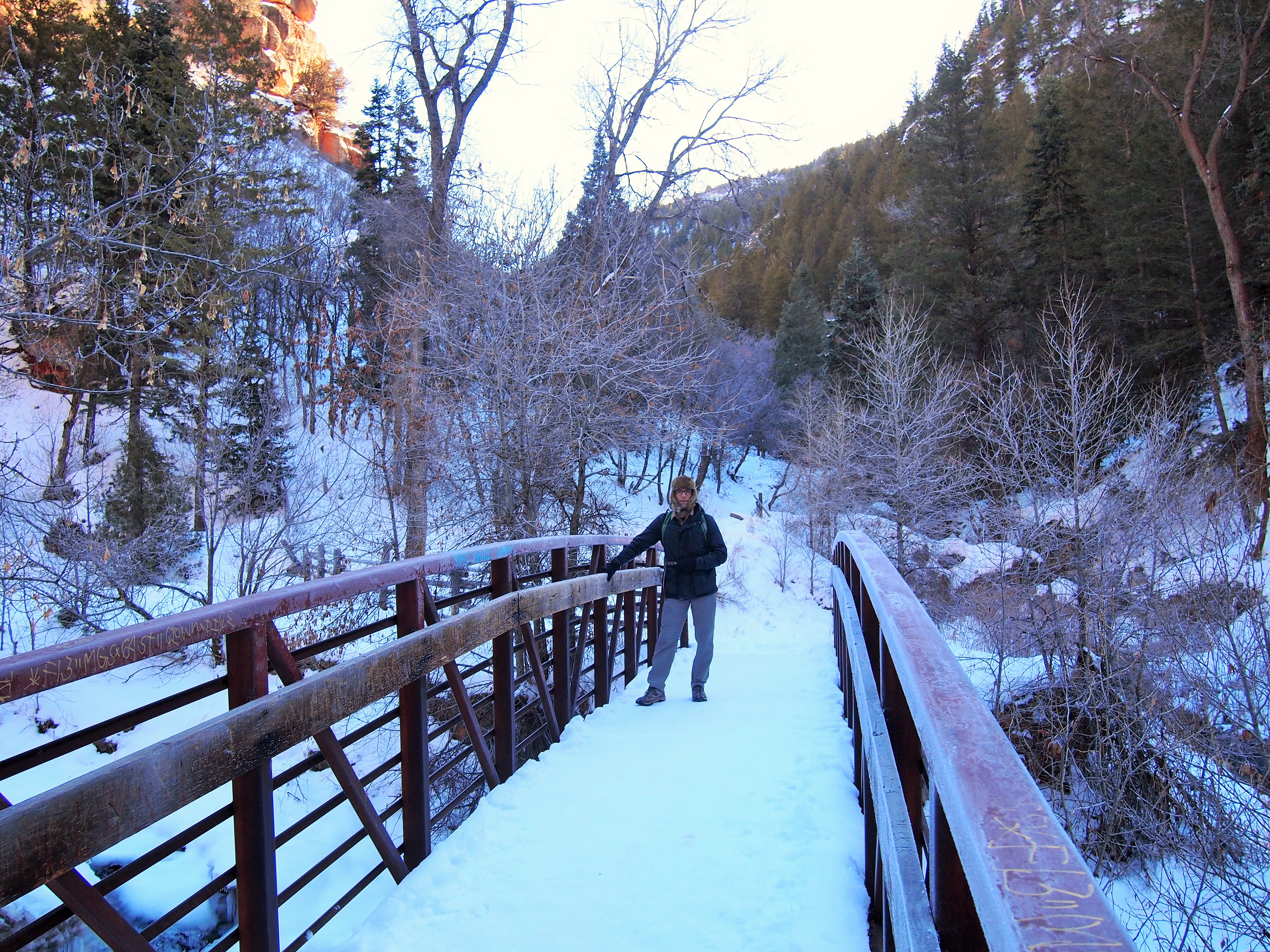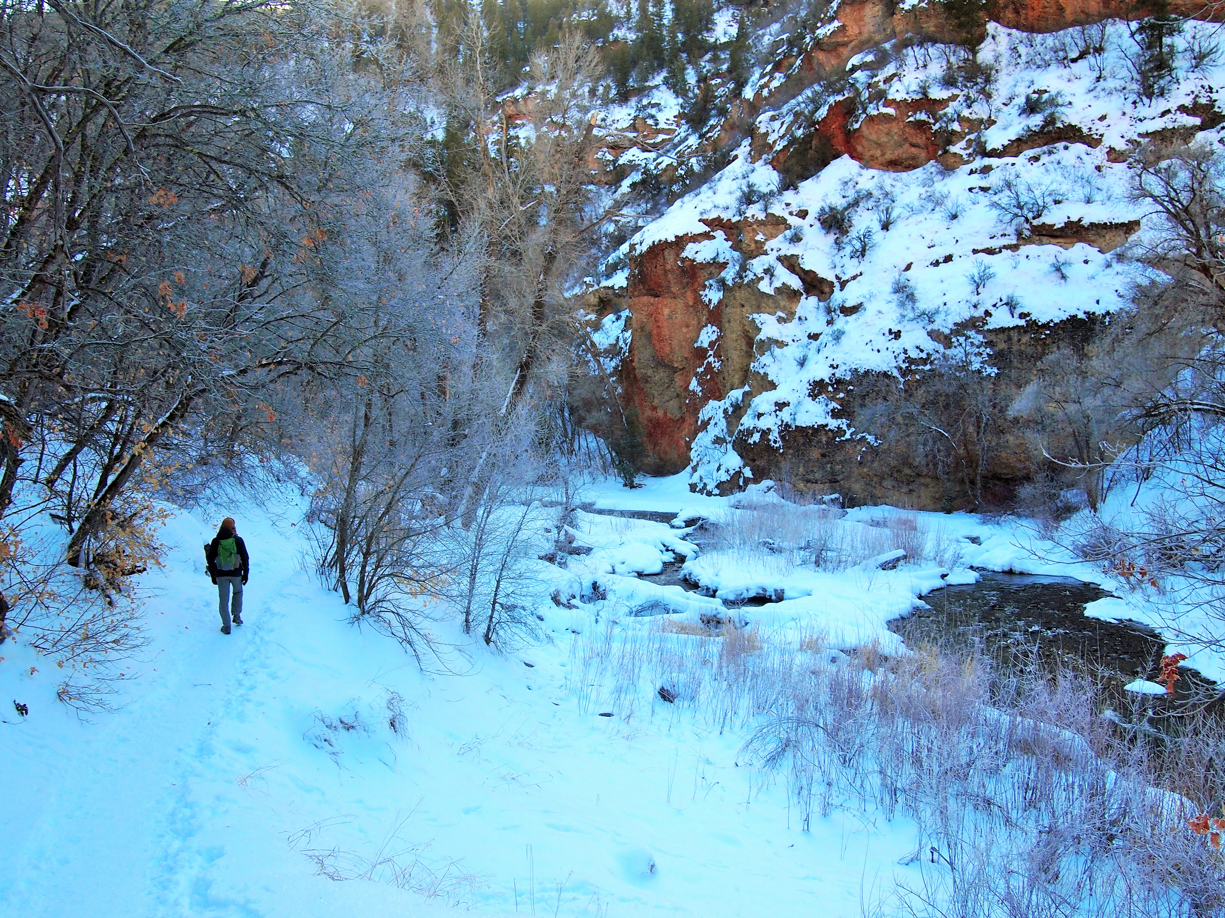 Since we were in a side canyon, the trail remained shaded and cold. My own exhalation caused frost to form on my hair! When we reached the bridge over Sixth Water Creek, we knew we’d reached the final mile. For the remainder of the hike, we followed Fifth Water Creek. Here, still shaded, the trail had been packed down enough that there was an icy layer which wasn’t always discernible at first glance. We had to be more cautious on parts off the trail which skirted drop-offs along with rises/falls in the trail. On the way out I wore my Yaktrax and the difference was incredible. I had absolutely no trouble on the icy portions.