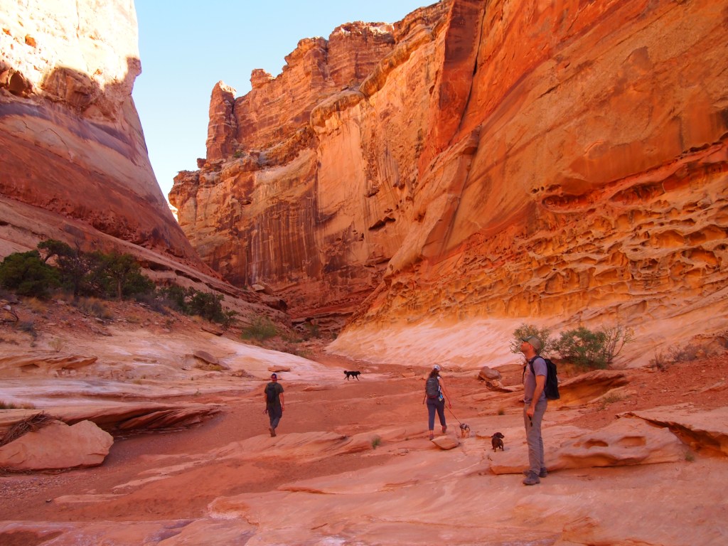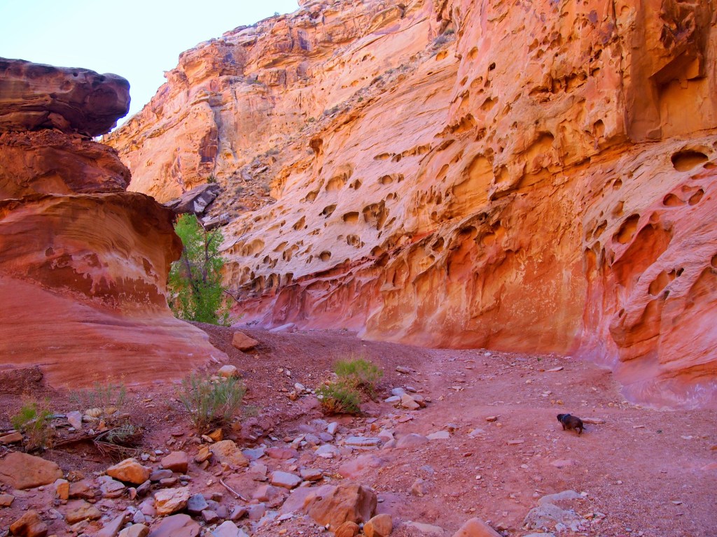 From the parking area, we followed a wash for the first half mile or so until we reached the entrance to the canyon. In the wash we had to bear the full force of the late afternoon sun; once inside the shade of the canyon walls we could enjoy a evening stroll – sort of. The first obstacle we encountered was a series of pour offs. Though we could have bypassed them by following the ledge to the right, we decided to descend them. It was fun going down, but a little trickier getting back up (with the dogs) on our way out.