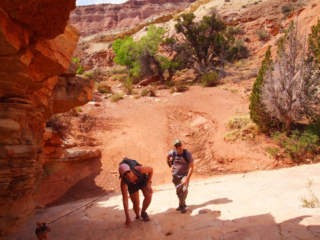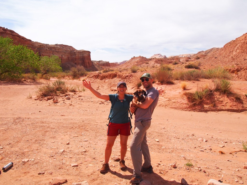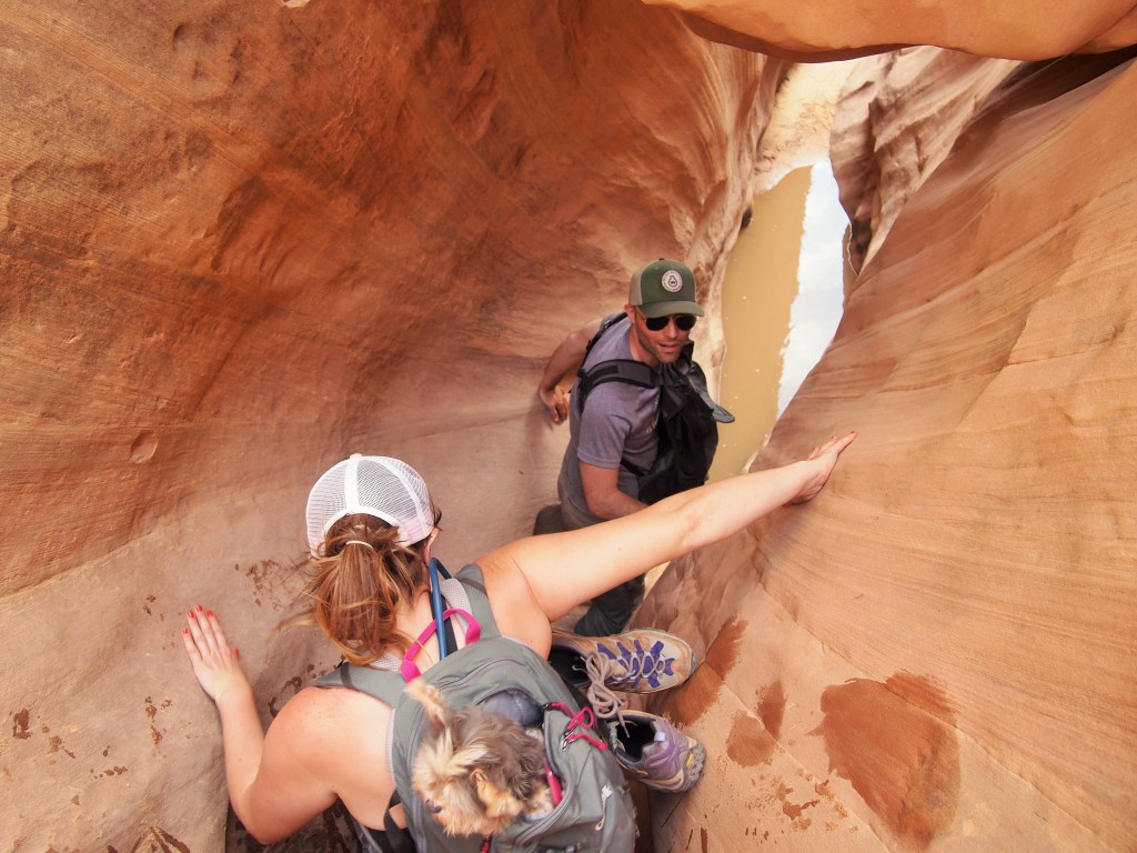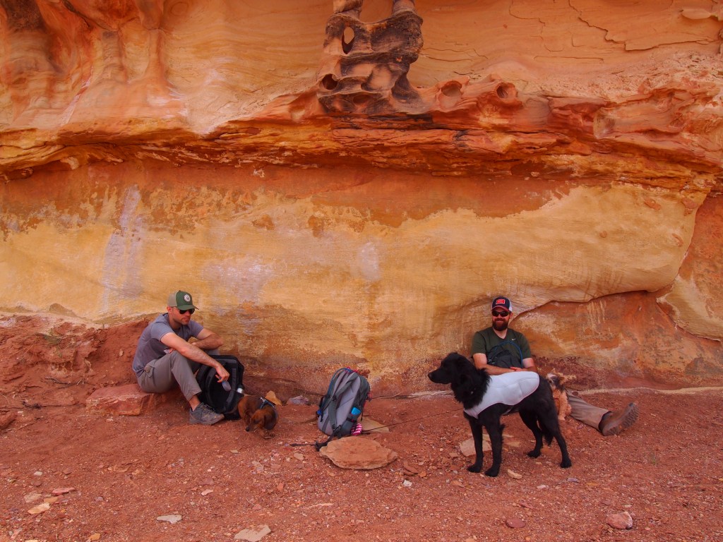 In the morning we enjoyed a leisurely breakfast of blueberry pancakes with coffee and tea. Lisa and I had picked the hike for the day: Ding and Dang Canyons. We had been talking about/researching the hike for a full week. We read descriptions, looked at Instagram photos, and even talked to another person who had completed it. It sounded completely do-able for our group of four. Taking three dogs along complicated things slightly, but with Truman and Belle (Lisa’s malchi) able to fit in packs, only Sasha (Ryan’s retriever mix) was considered a risk. But Lisa and I brushed those doubts aside and decided we wanted to tackle the two canyons. Ryan was less confident, and Zach had no idea what lay in store.