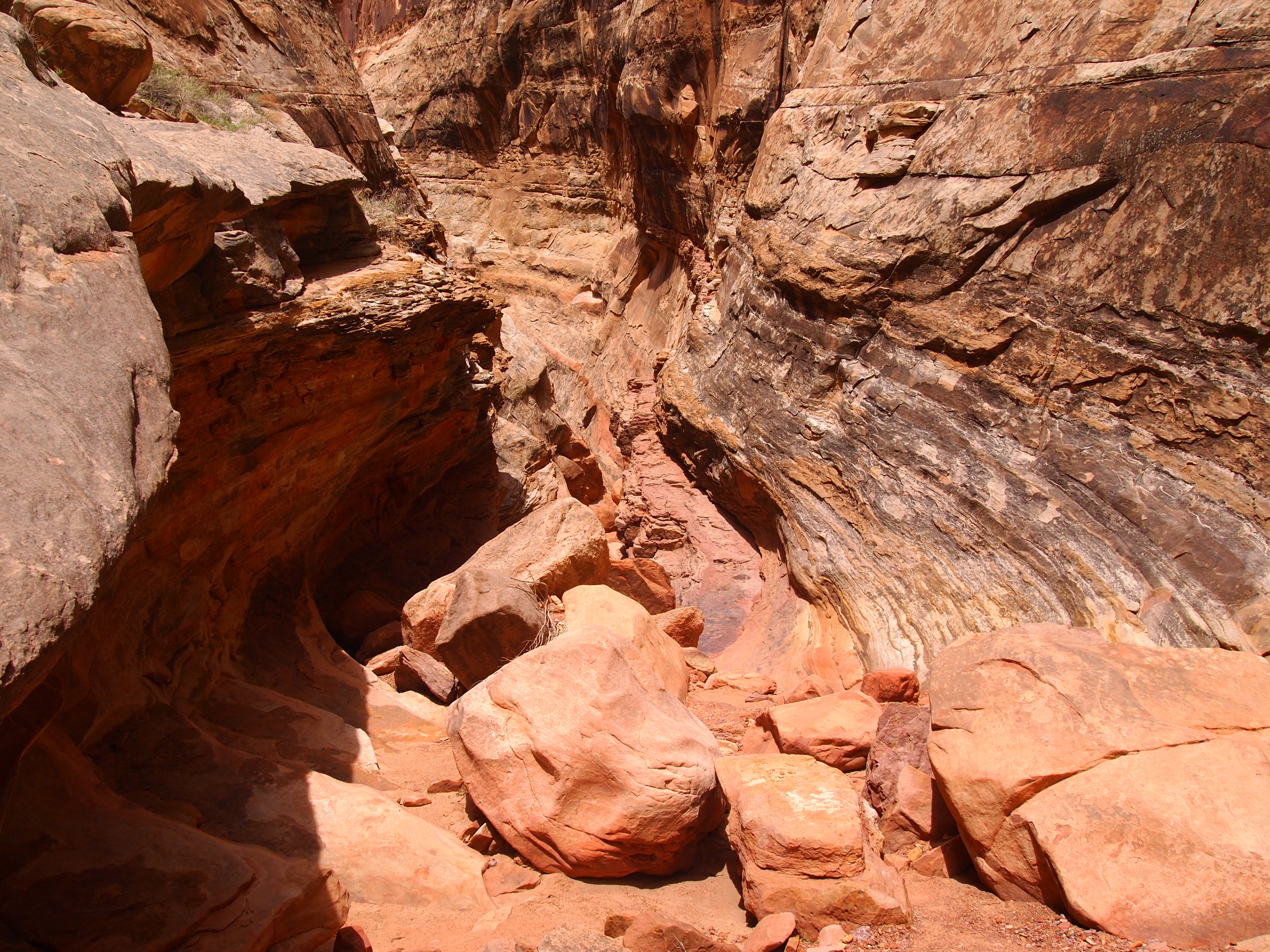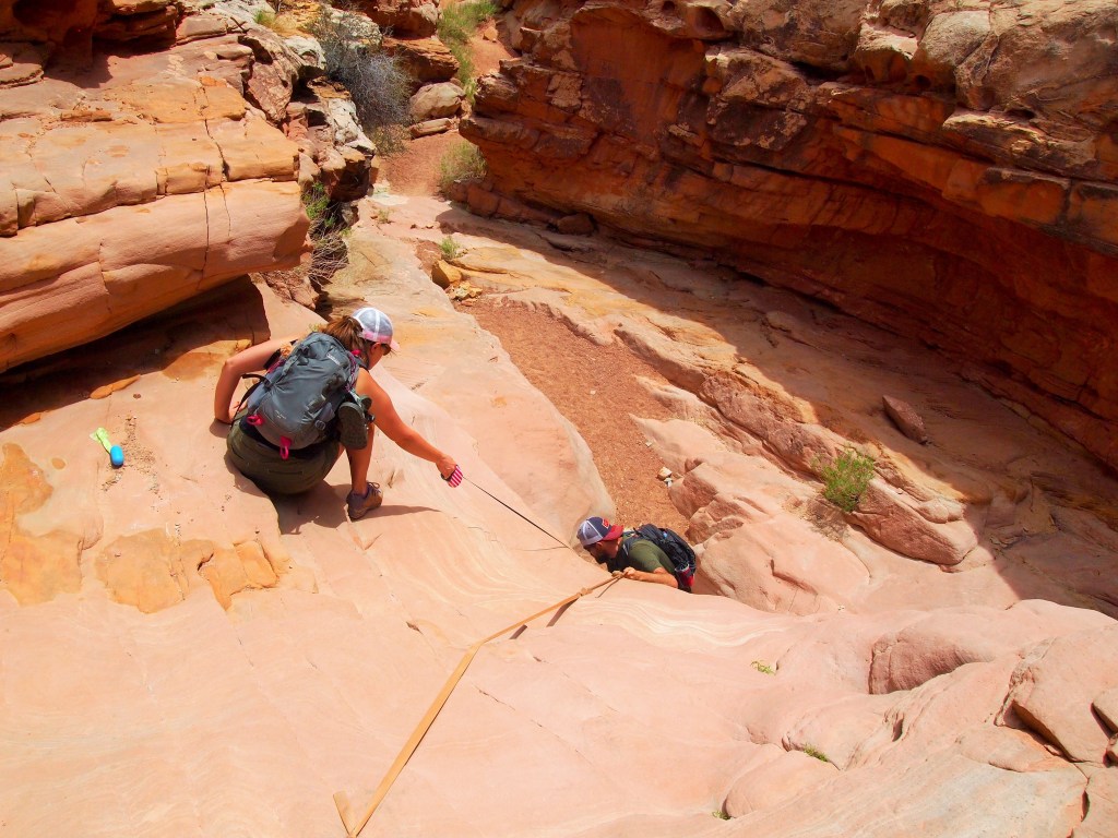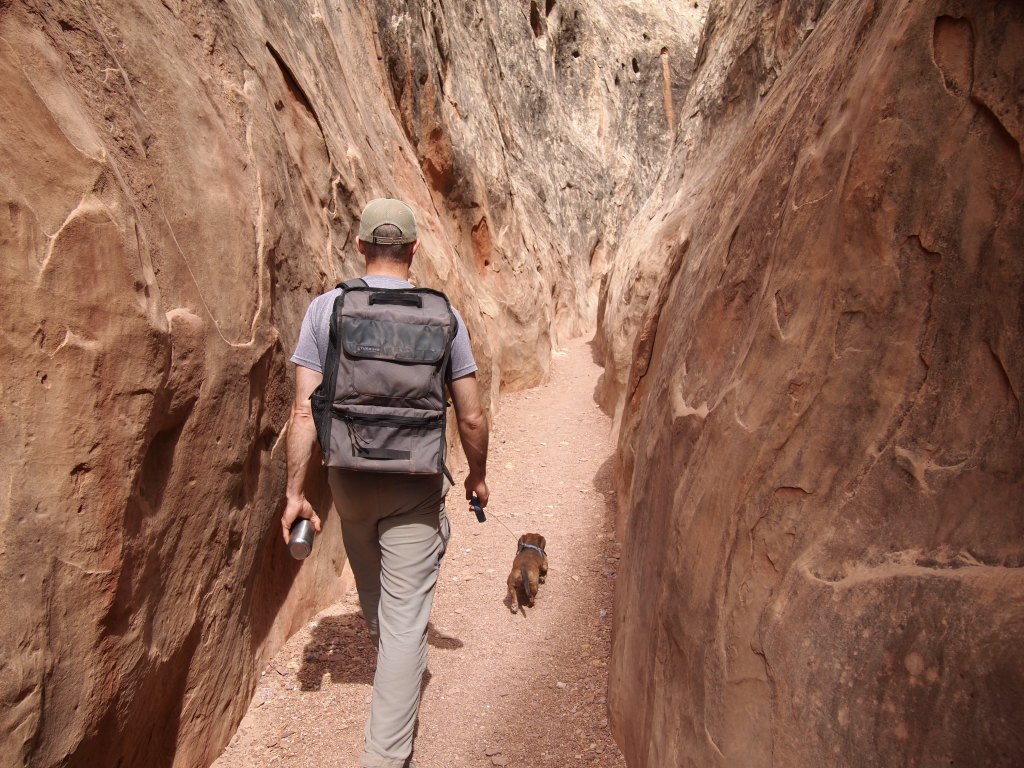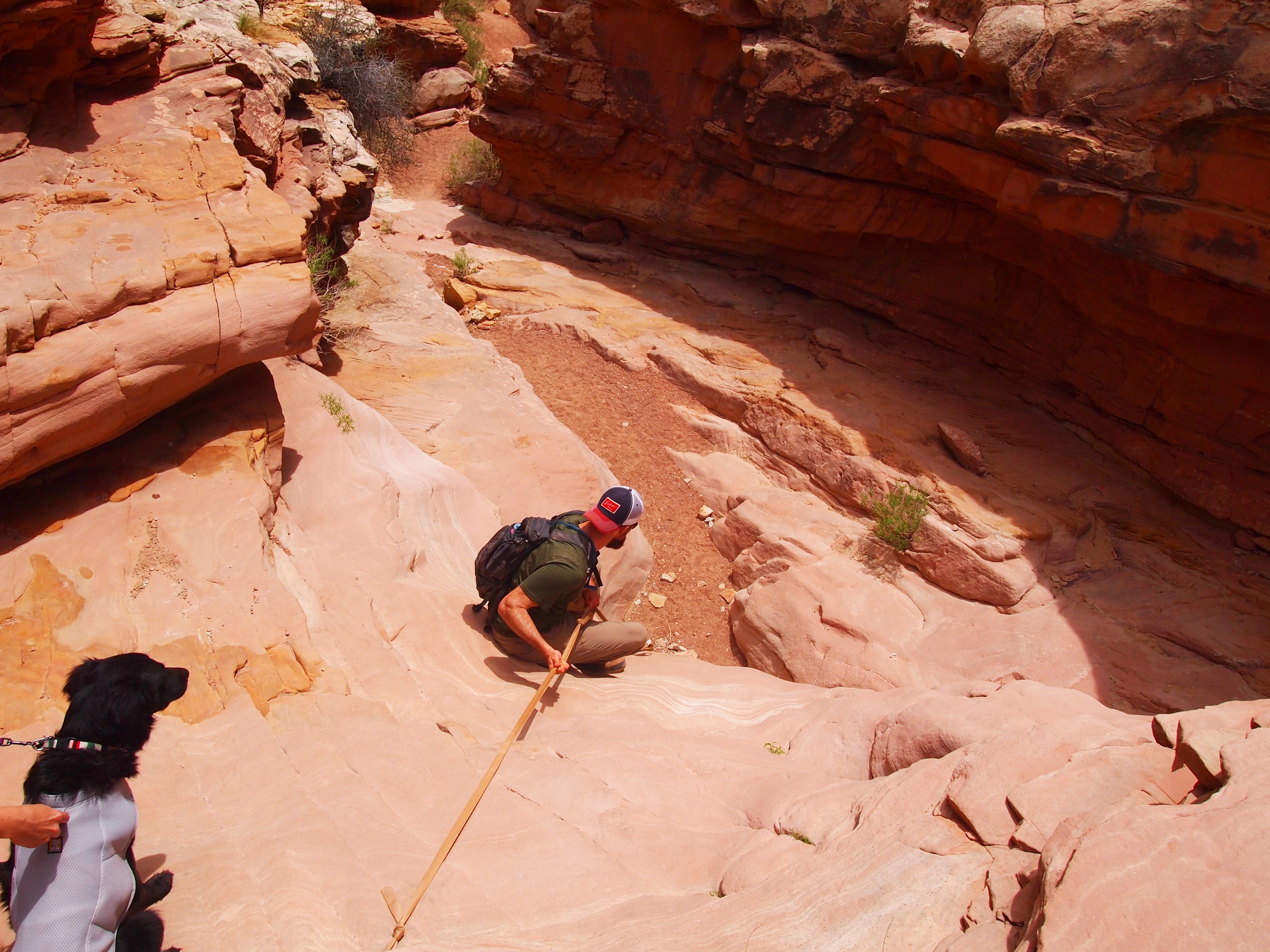 Although Truman had been a bit of a pill in Ding Canyon, by the time he needed to be in his pack for the more difficult portions of Dang, he was more than obliging. Belle also tired out and was ready for a ride in Lisa’s backpack. This made it that much easier to get them down the various obstacles we faced the farther down the canyon we went.