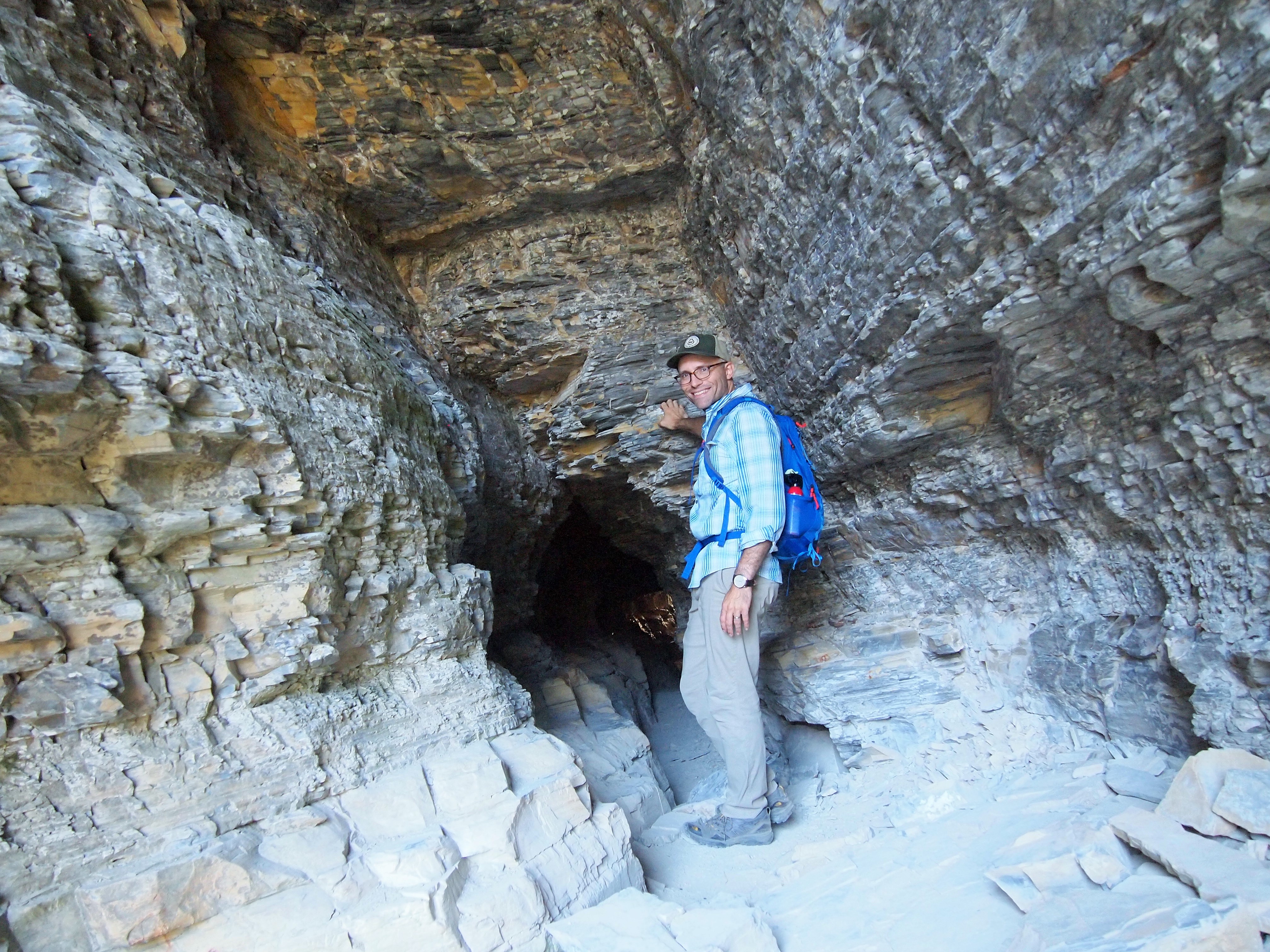 Then we reached it, the highlight of the trail, and the piece I had been dreading: the ladder, tunnel, and short cabled-ascent to the basin. As usual, my anxiety was unfounded and any doubt I had quickly dissipated. For whatever reason, it’s only the idea of these obstacles that I fear; once I’m there it’s not a problem. The ladder, although very skinny, was a cinch to climb, and the tunnel was a fun obstacle. We had to climb down from the tunnel’s exit and then skirt our way over to the cables to climb up the rest of the cliff-face. The cables weren’t entirely necessary, but were certainly comforting. Once we made it to the top, it was only a short distance to the lake itself.