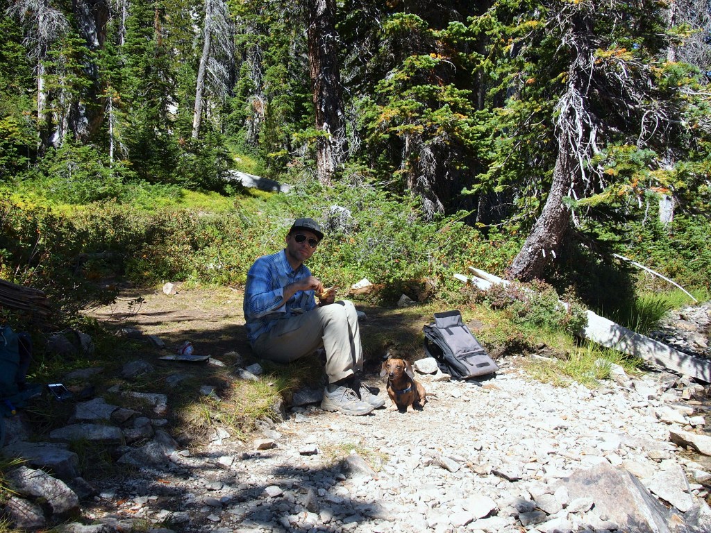 The next morning we woke up refreshed and ready to tackle the day’s agenda: a long day hike to Alice Lake. We got a late start on the trail just before 11am, but in the end didn’t suffer for it. We did have to park in the overflow parking area next to the horse corrals which added an extra half mile (each way) to our hike bringing our grand total to 12.6 miles RT. The first 1.7 miles took us for a pretty jaunt alongside Pettit Lake to the boundary of the Sawtooth Wilderness. From the wilderness boundary, the trail remained fairly level and shaded making it easy and enjoyable for Truman. He wasn’t fond of any of the creek crossings along the trail, but took every possible opportunity to drink the cool clear water.