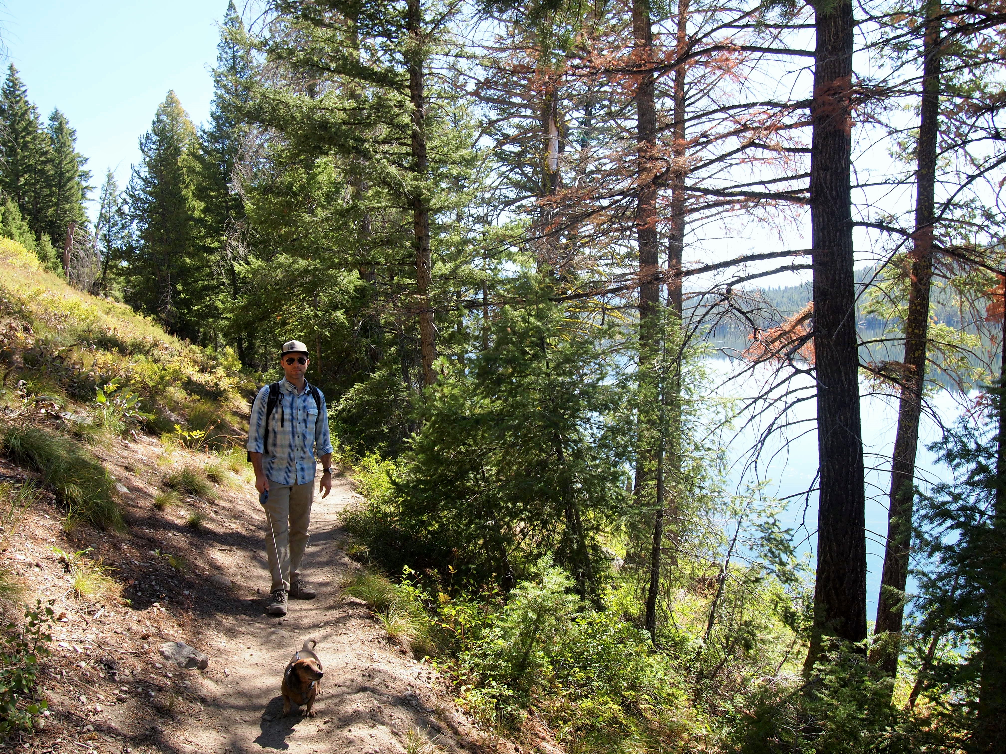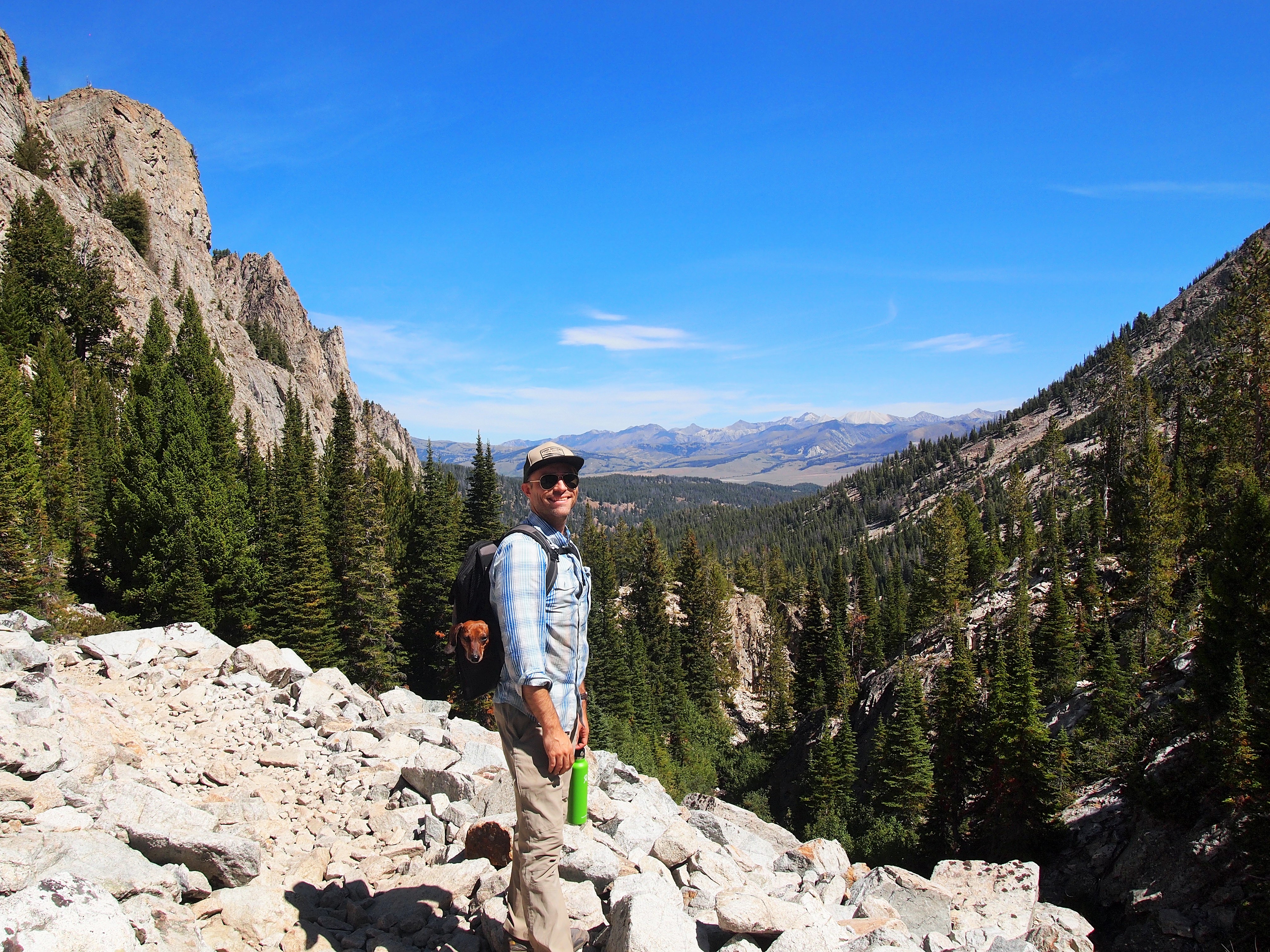 The next morning we woke up refreshed and ready to tackle the day’s agenda: a long day hike to Alice Lake. We got a late start on the trail just before 11am, but in the end didn’t suffer for it. We did have to park in the overflow parking area next to the horse corrals which added an extra half mile (each way) to our hike bringing our grand total to 12.6 miles RT. The first 1.7 miles took us for a pretty jaunt alongside Pettit Lake to the boundary of the Sawtooth Wilderness. From the wilderness boundary, the trail remained fairly level and shaded making it easy and enjoyable for Truman. He wasn’t fond of any of the creek crossings along the trail, but took every possible opportunity to drink the cool clear water.