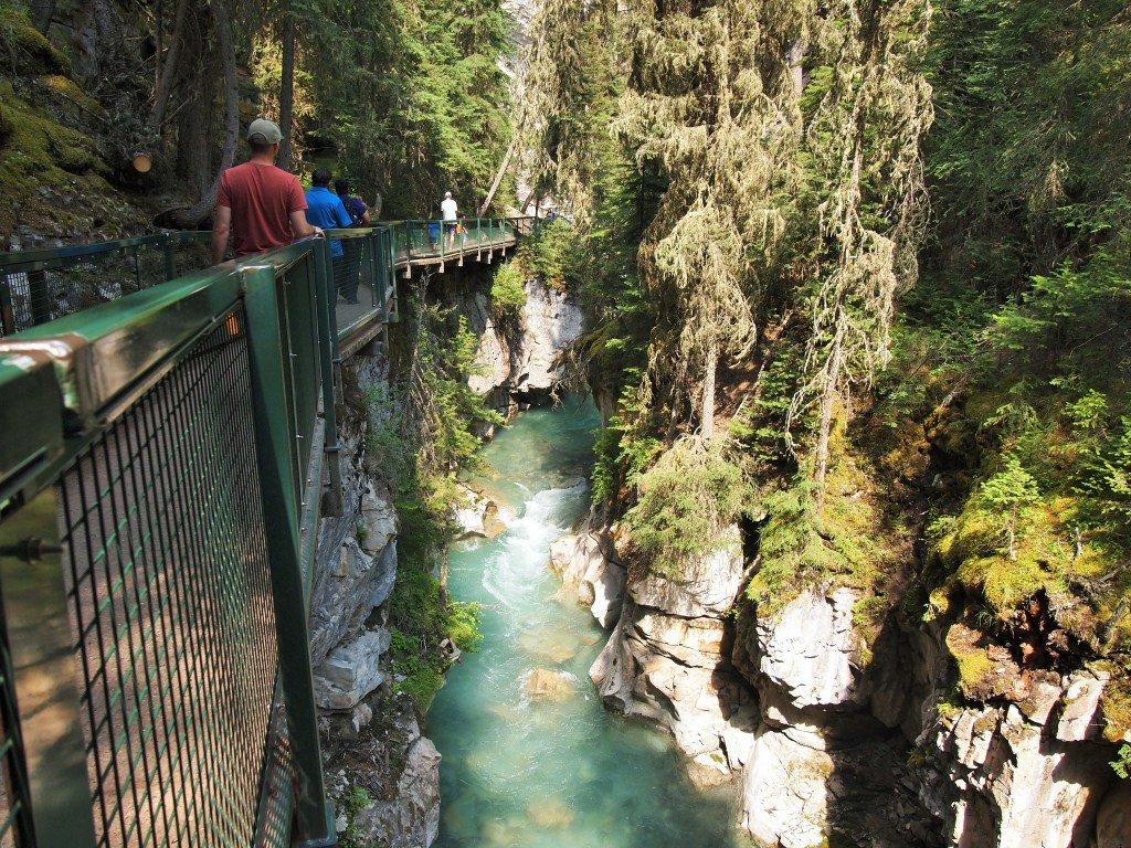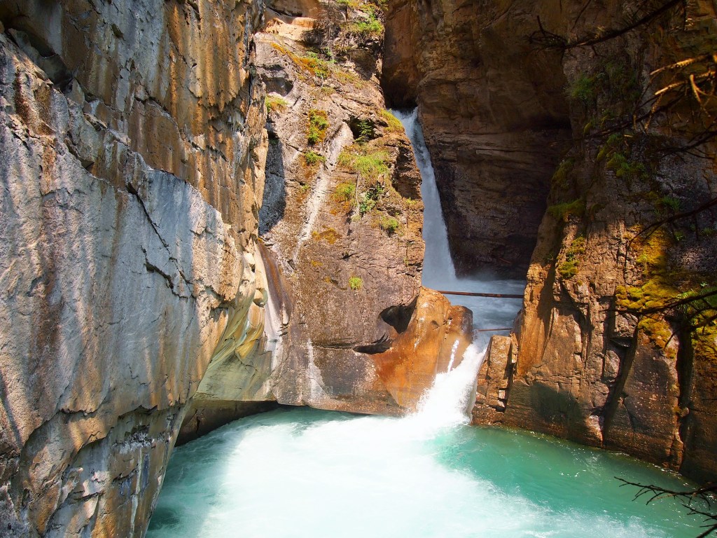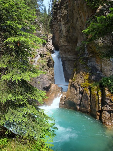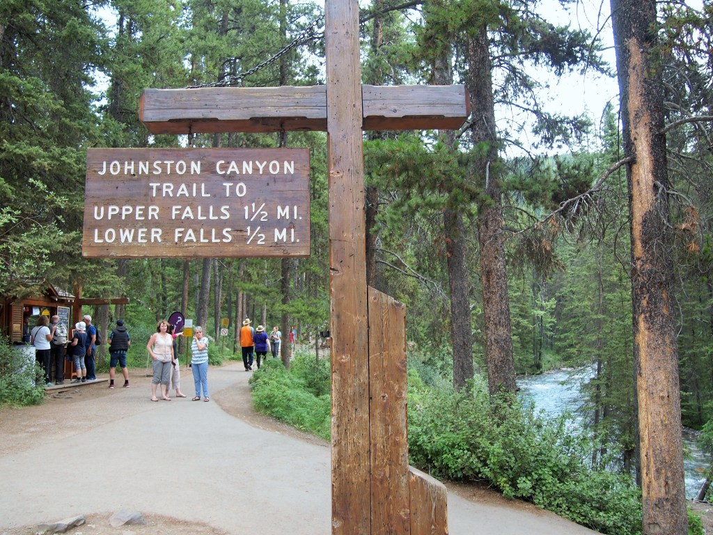 We left Banff to begin our driving tour of the park. Shortly after leaving the town, we exited for the Bow Valley Parkway which runs parallel to the Trans-Canada Highway for 32 miles toward Lake Louise. It felt quiet, and I was surprised to see little other traffic on the road – well, until I looked behind us! Our first stop was the immensely popular, Johnston Canyon. Cars lined the roadway and the parking lots were at capacity. We managed to find a nearby spot on the road, and scurried out to quickly walk the path to the lower falls. We knew it would be crowded, but we were able to navigate around slower groups pretty easily. The path begins alongside Johnston Creek and then narrows onto a catwalk to bring visitors into the depths of the canyon. It was a pleasant walk. The canyon is 100 ft. at its deepest point, but it felt more spectacular since we were in the canyon itself. The falls weren’t anything special – we’ve seen better waterfalls – but it was worth the short walk to the end.